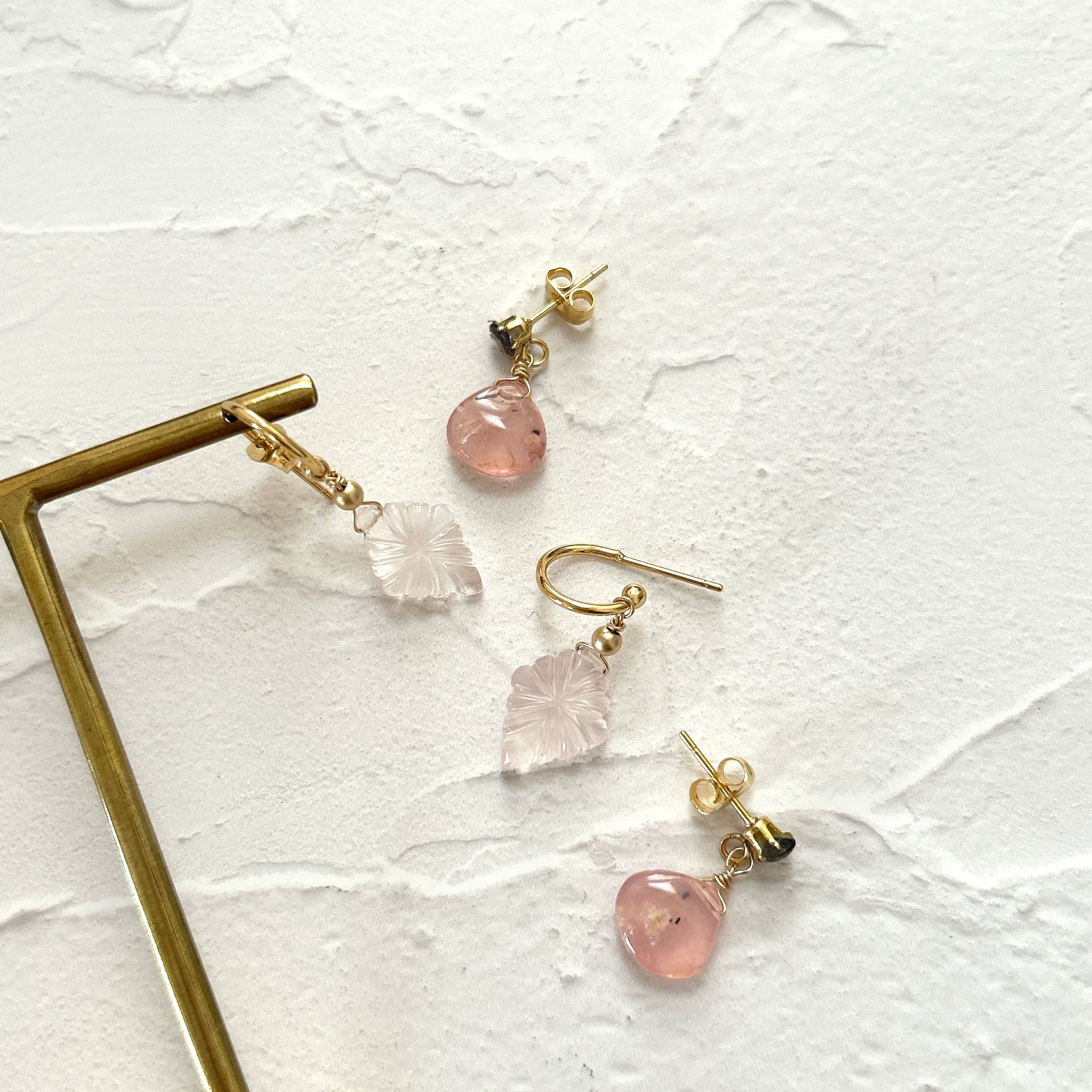 菱形にカットされ、繊細な彫刻の入ったエレガントなローズクォーツのピアス。