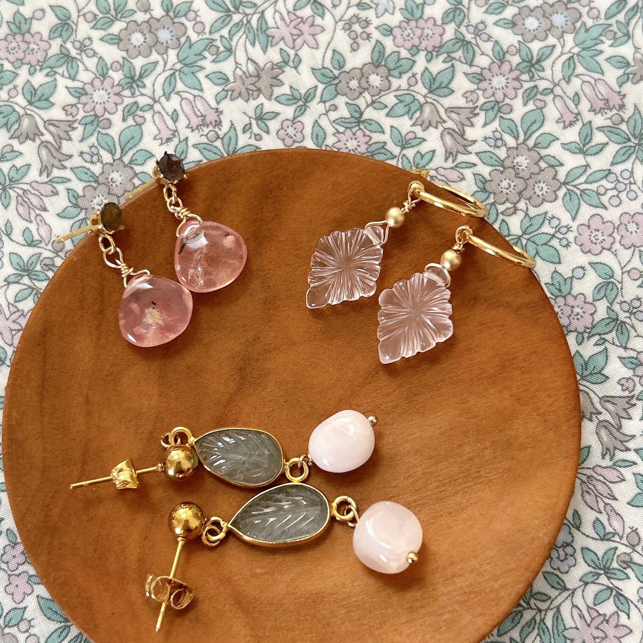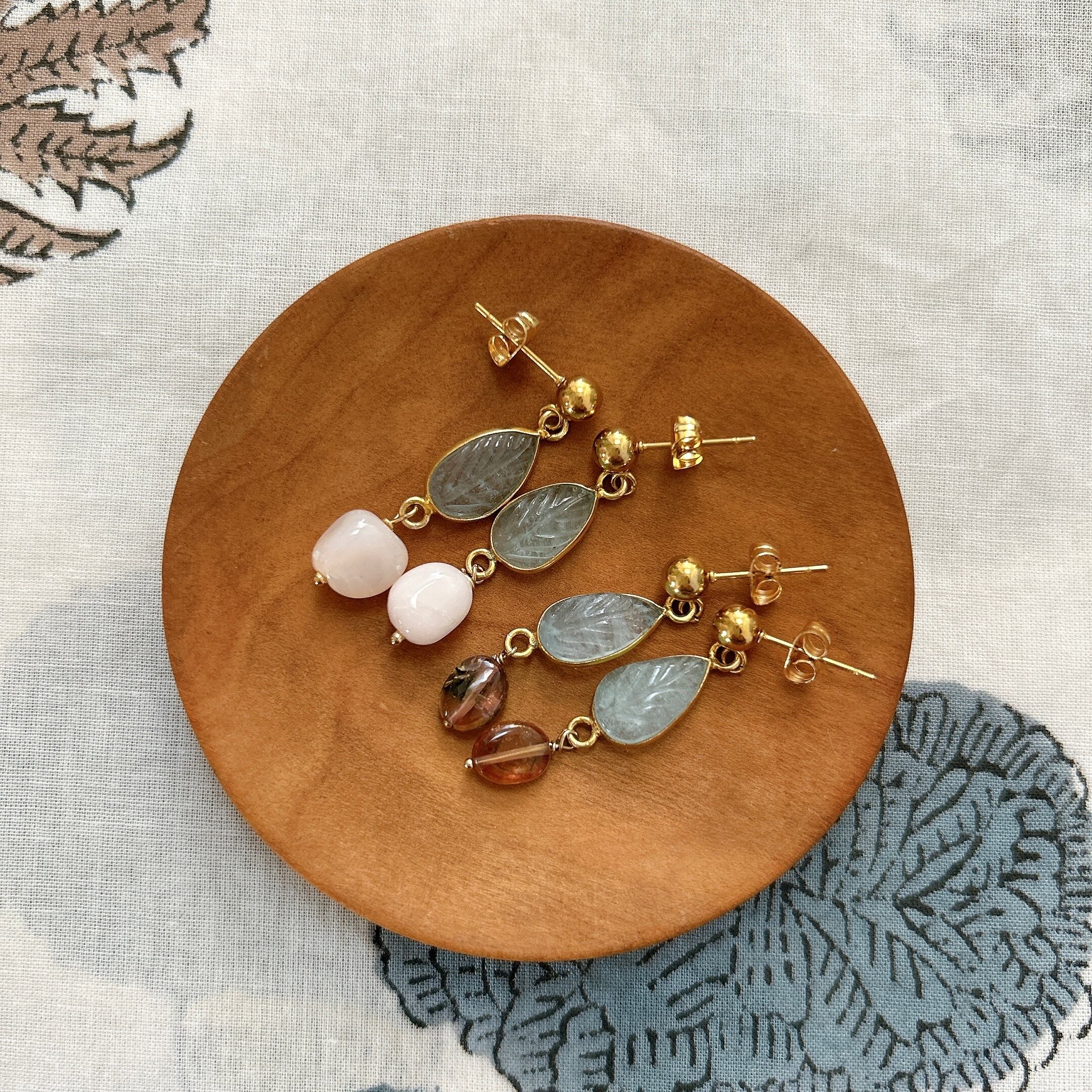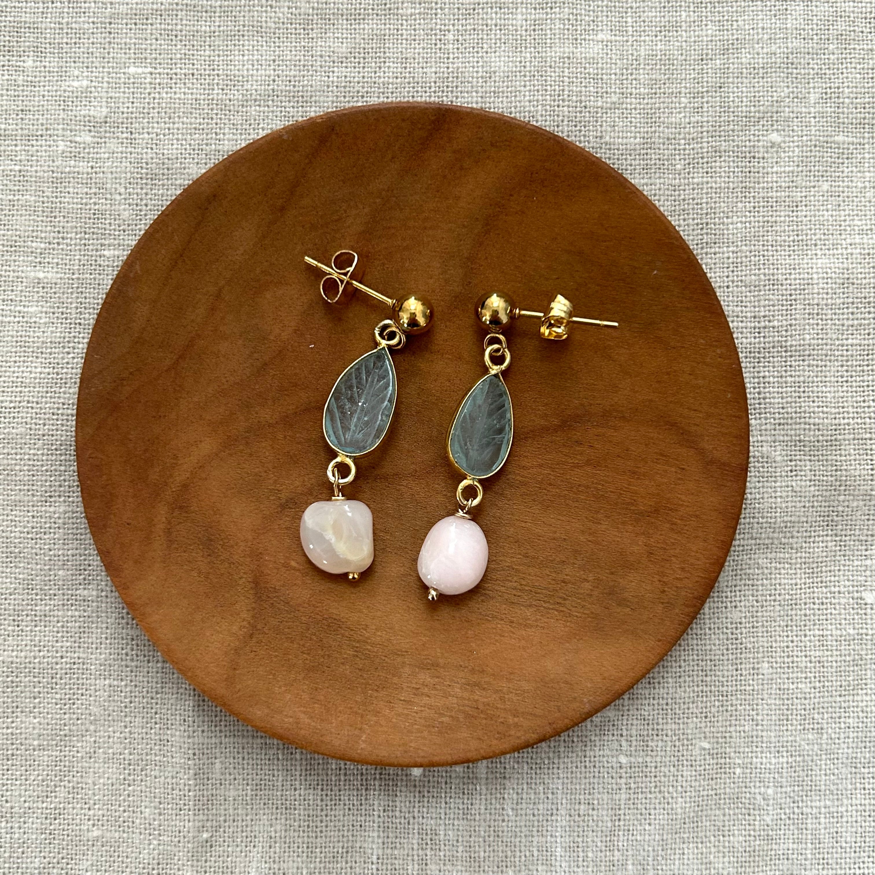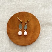 リーフカービングアクアマリンとピンクオパールのピアス<イヤリング変更可> P-105