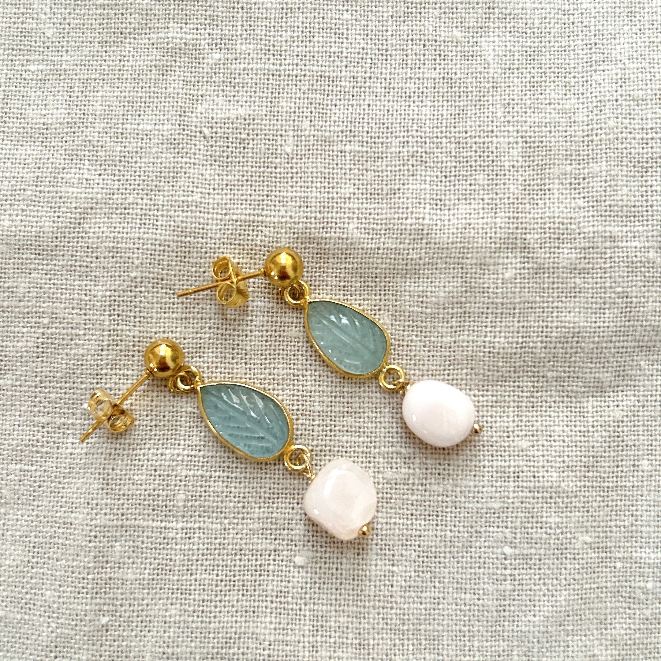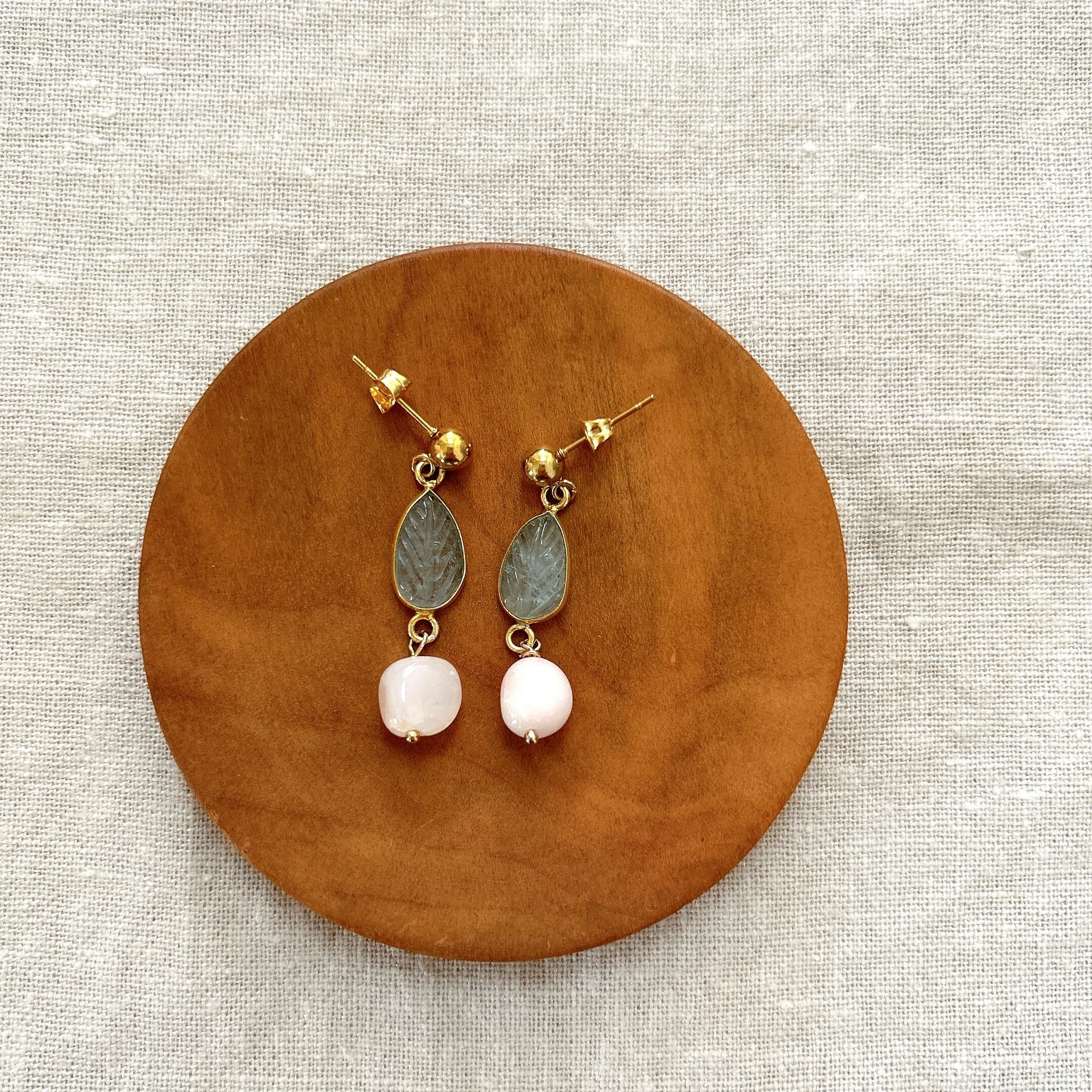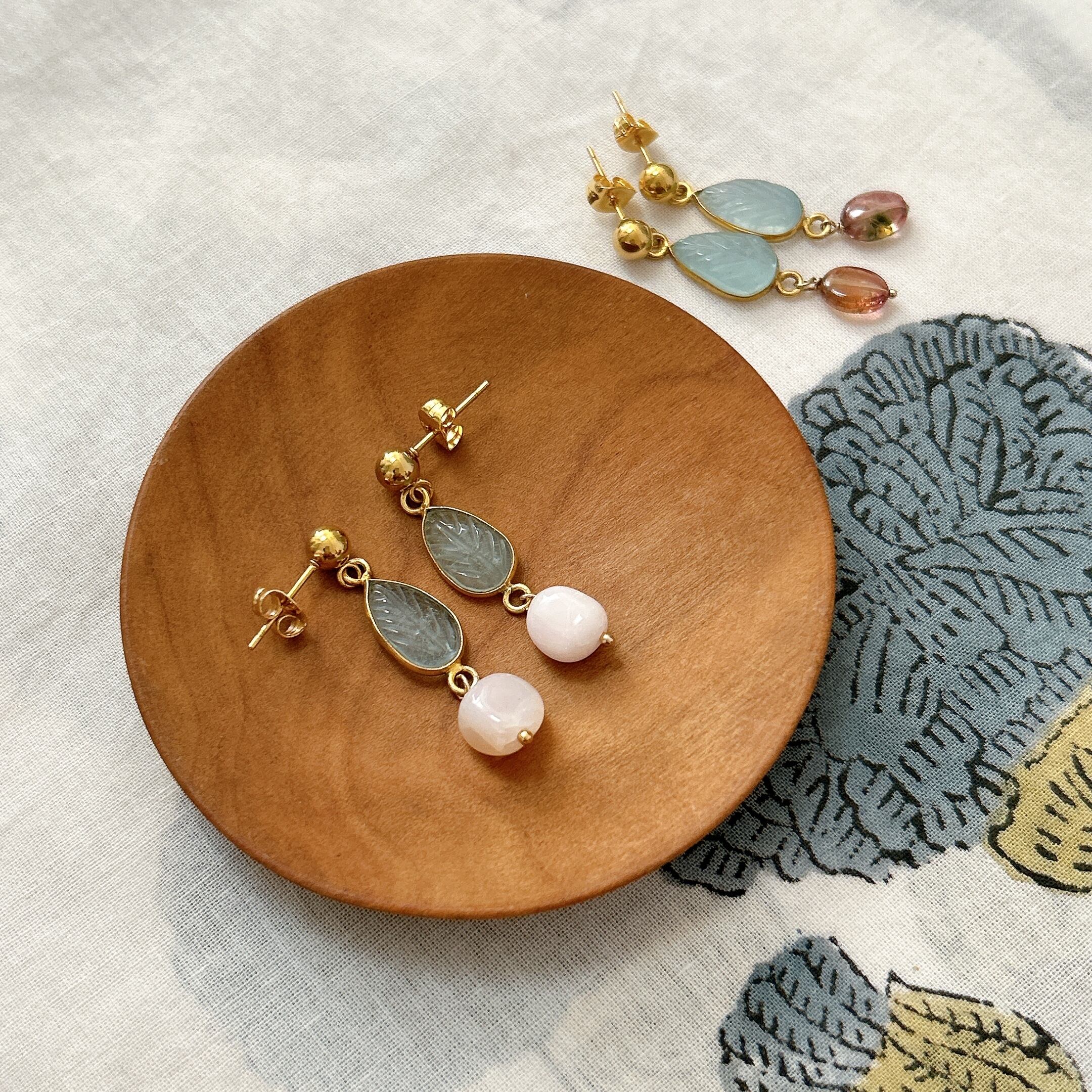 リーフカービングアクアマリンとピンクオパールのピアス<イヤリング変更可> P-105