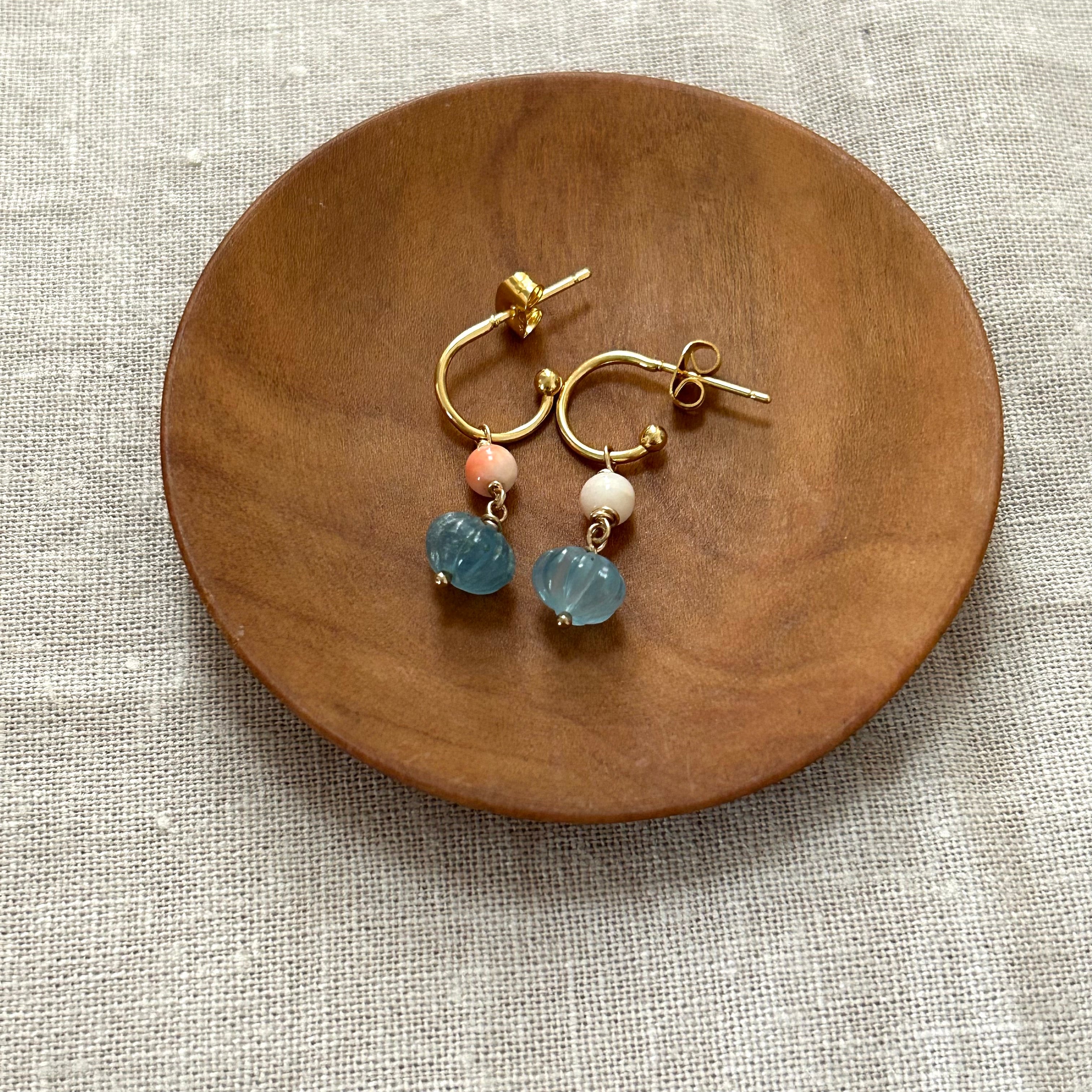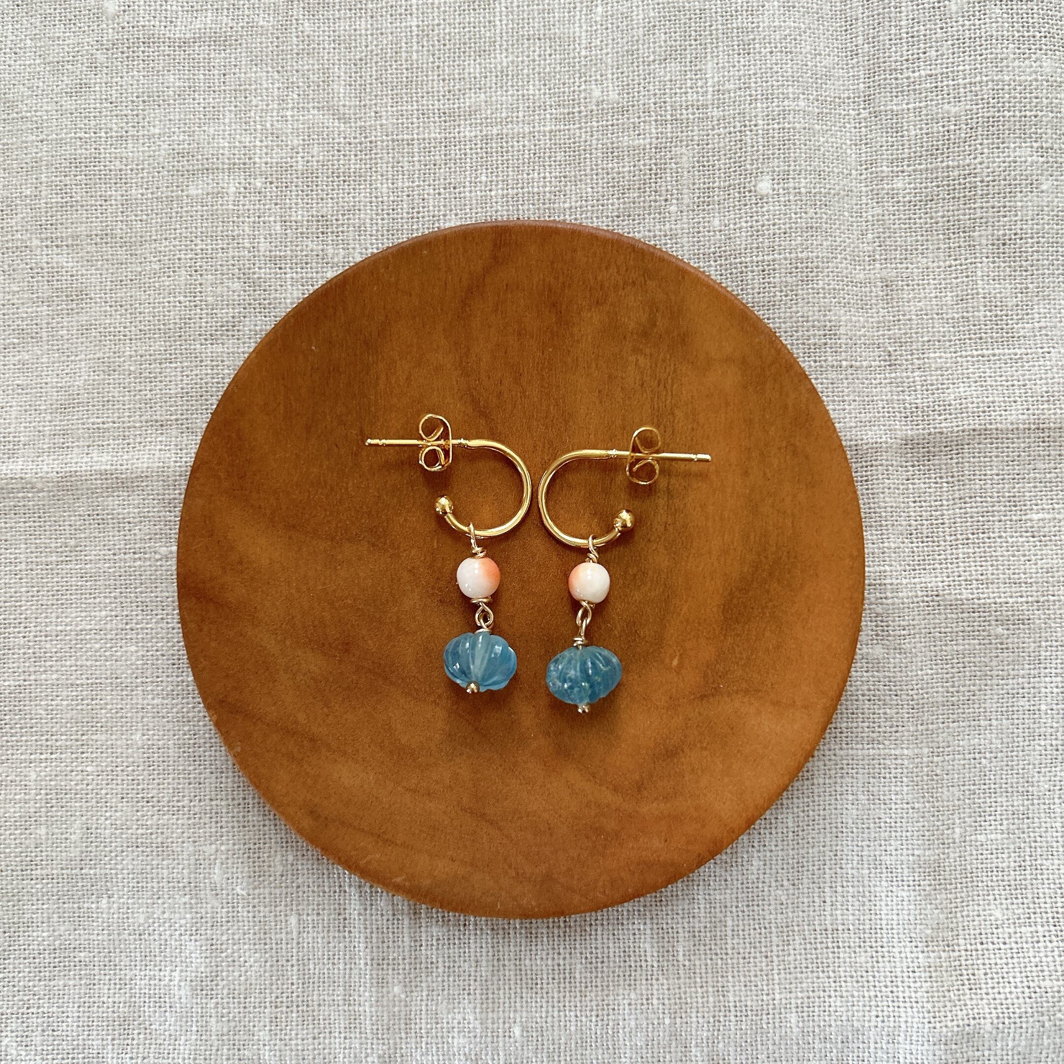 カービングアクアマリンと深海珊瑚のピアス<イヤリング変更可> P-103