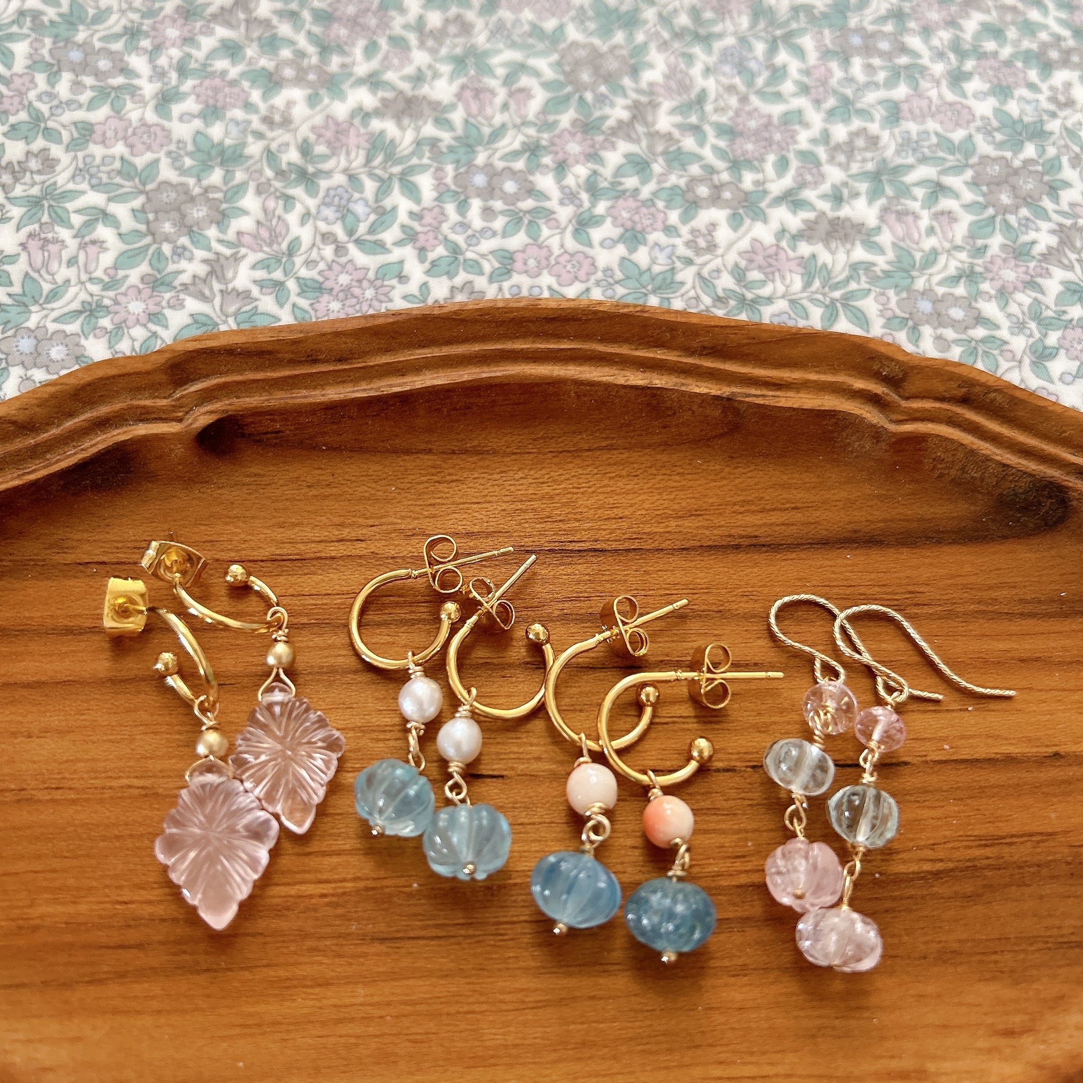 現在販売中のものには、カーネリアンやグリーンオニキス、ホワイトオパールのカボチャピアス、モルガナイトとアクアマリンのフラワーピアス(写真7-9枚目右)がございますので、よろしかったらそちらもご覧くださいね!