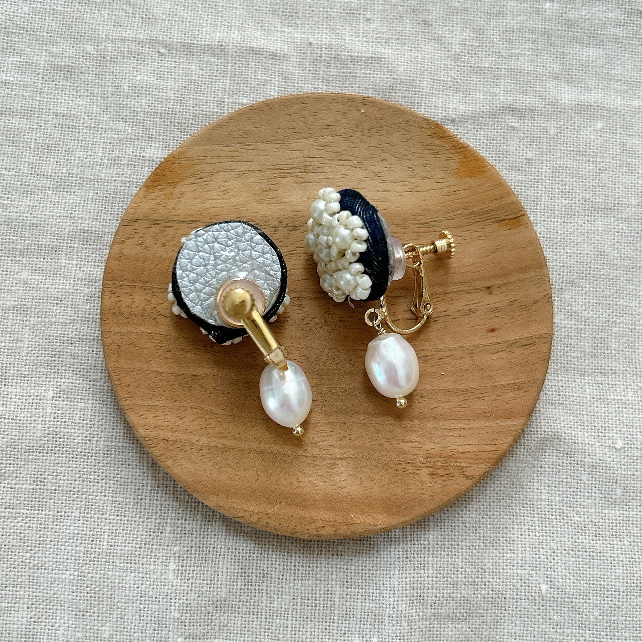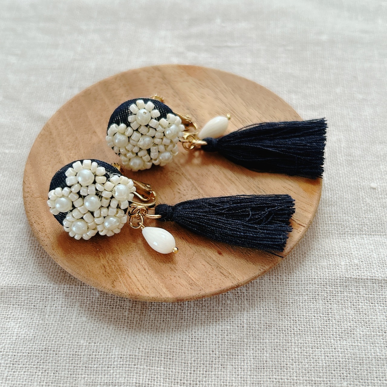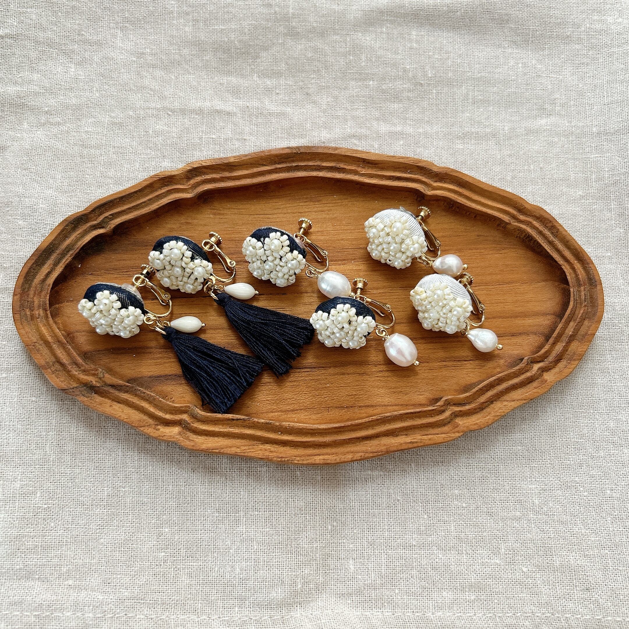 <素材>インドボタン、①はコットン糸(タッセル)、白珊瑚、合皮、淡水パール、真鍮(イヤリング金具、ニッケルフリー加工)