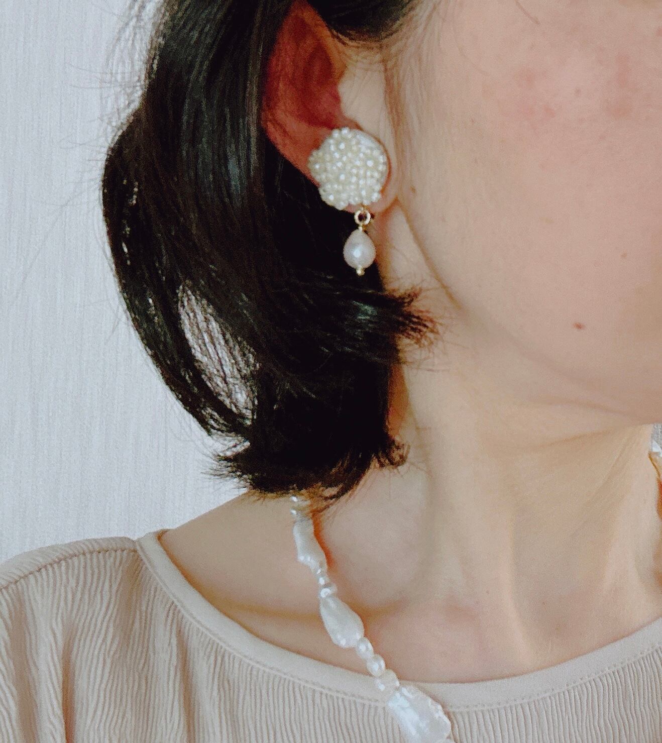 タッセルデザインの①は、淡水パールではなく涙型の白珊瑚を合わせてみました。