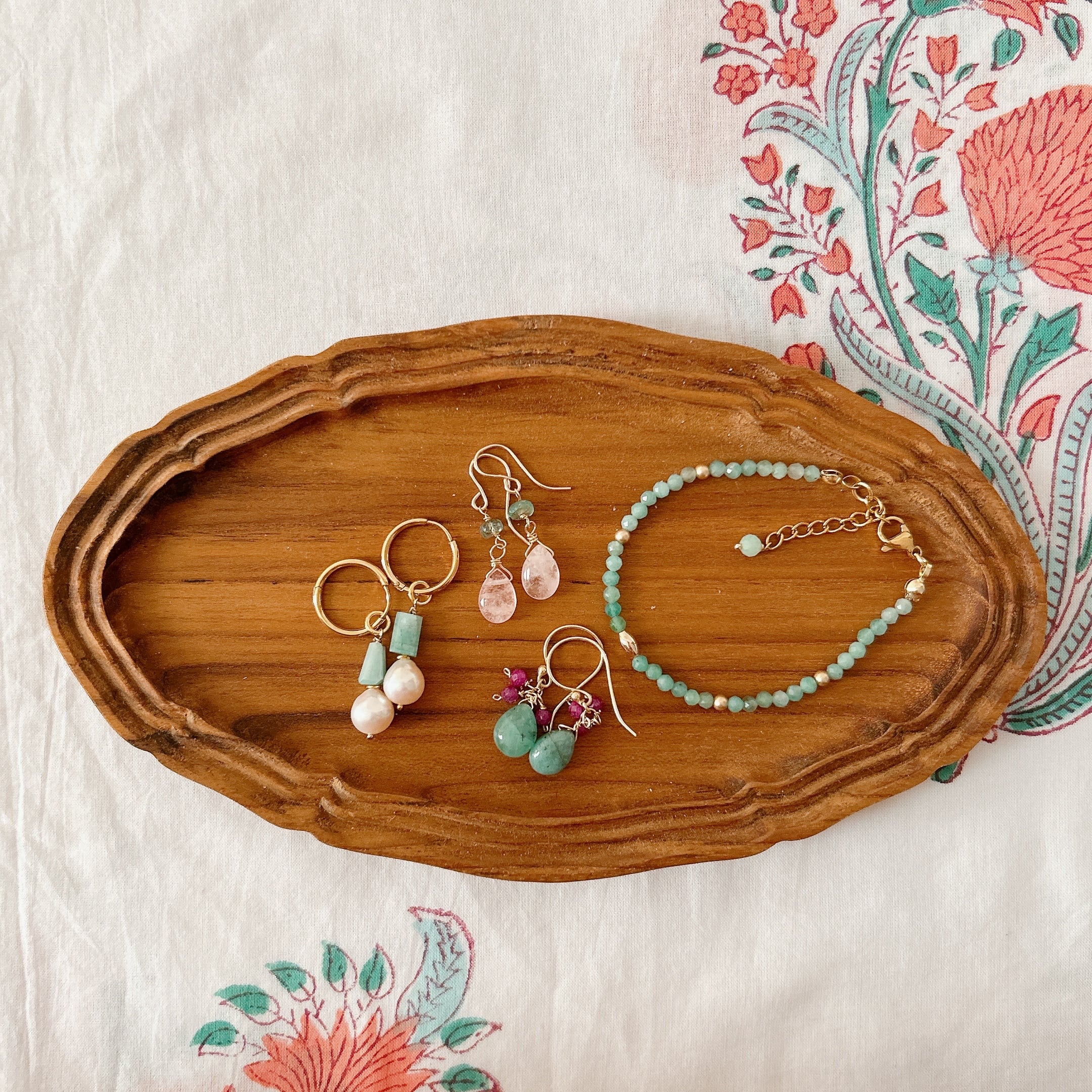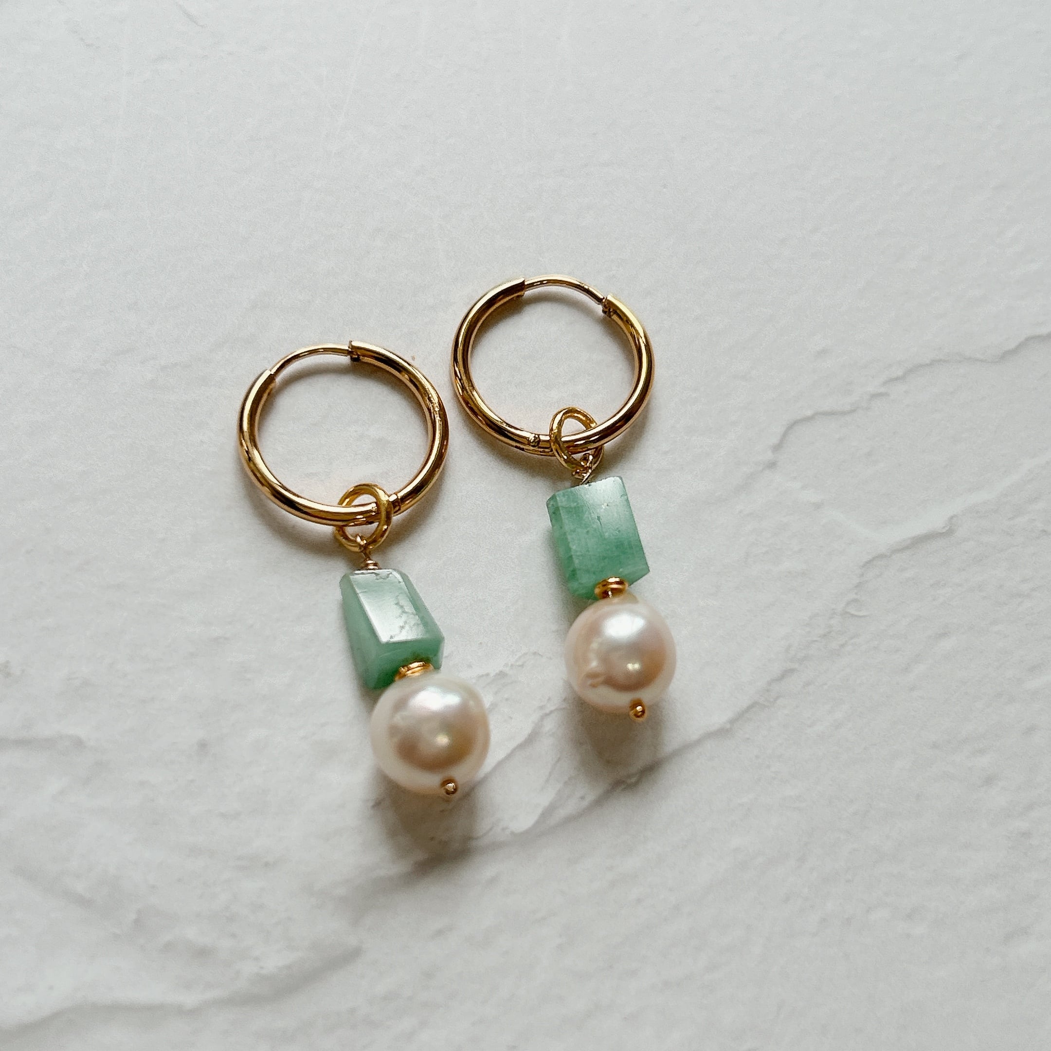 タンブル(小石)カットのエメラルドに、やや涙型のぷっくりとしたあこやパールを合わせた、シンプルな中に華やかさもあるピアス(イヤリング)。