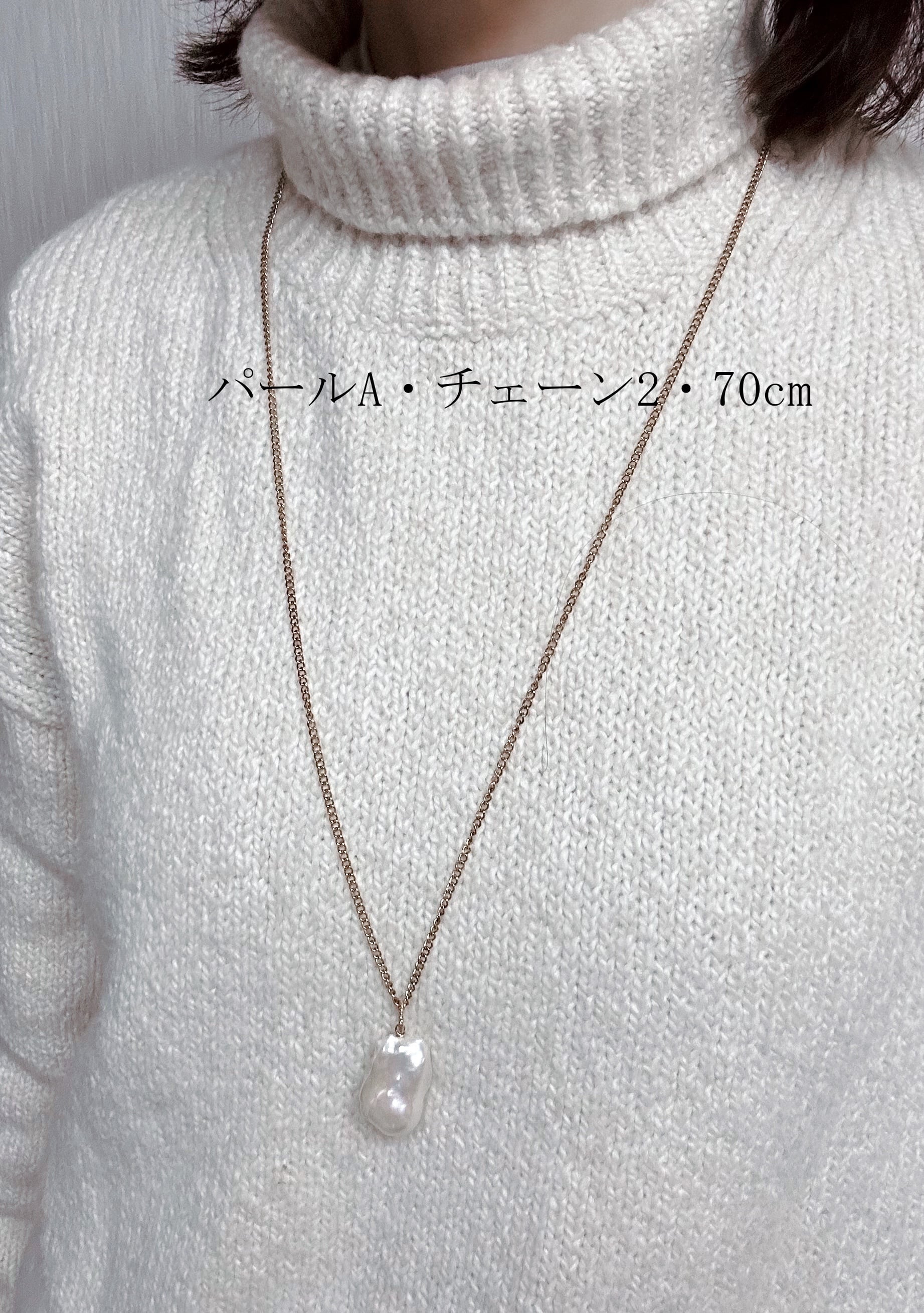 パールとチェーンの種類、長さは 50cm、60cm(+100円)に加え、今回からボリュームニットにも映える70cm(+300円)からお選びいただけるようになりました!