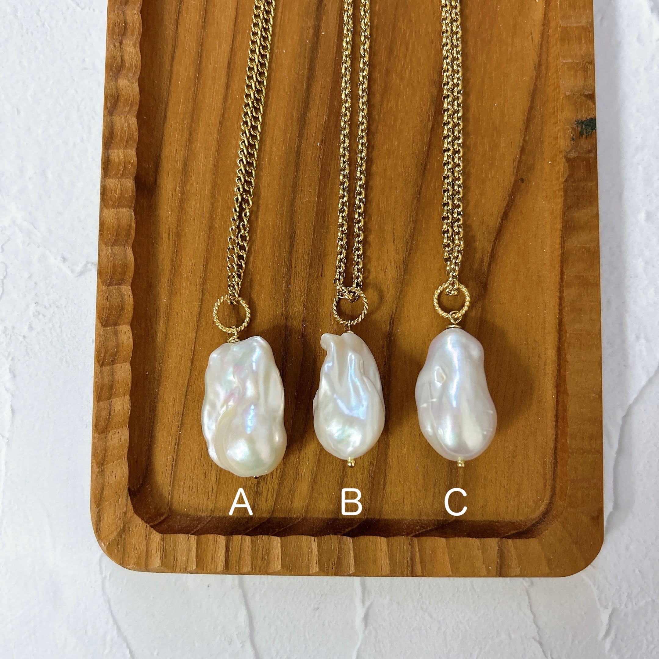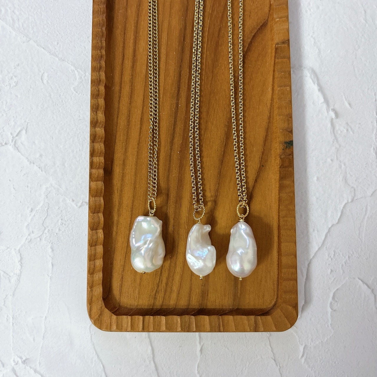 たっぷり大粒、つやつやのオイスター淡水バロックパールをひとつ、長めのステンレスチェーンでシンプルなネックレスに仕立てました。