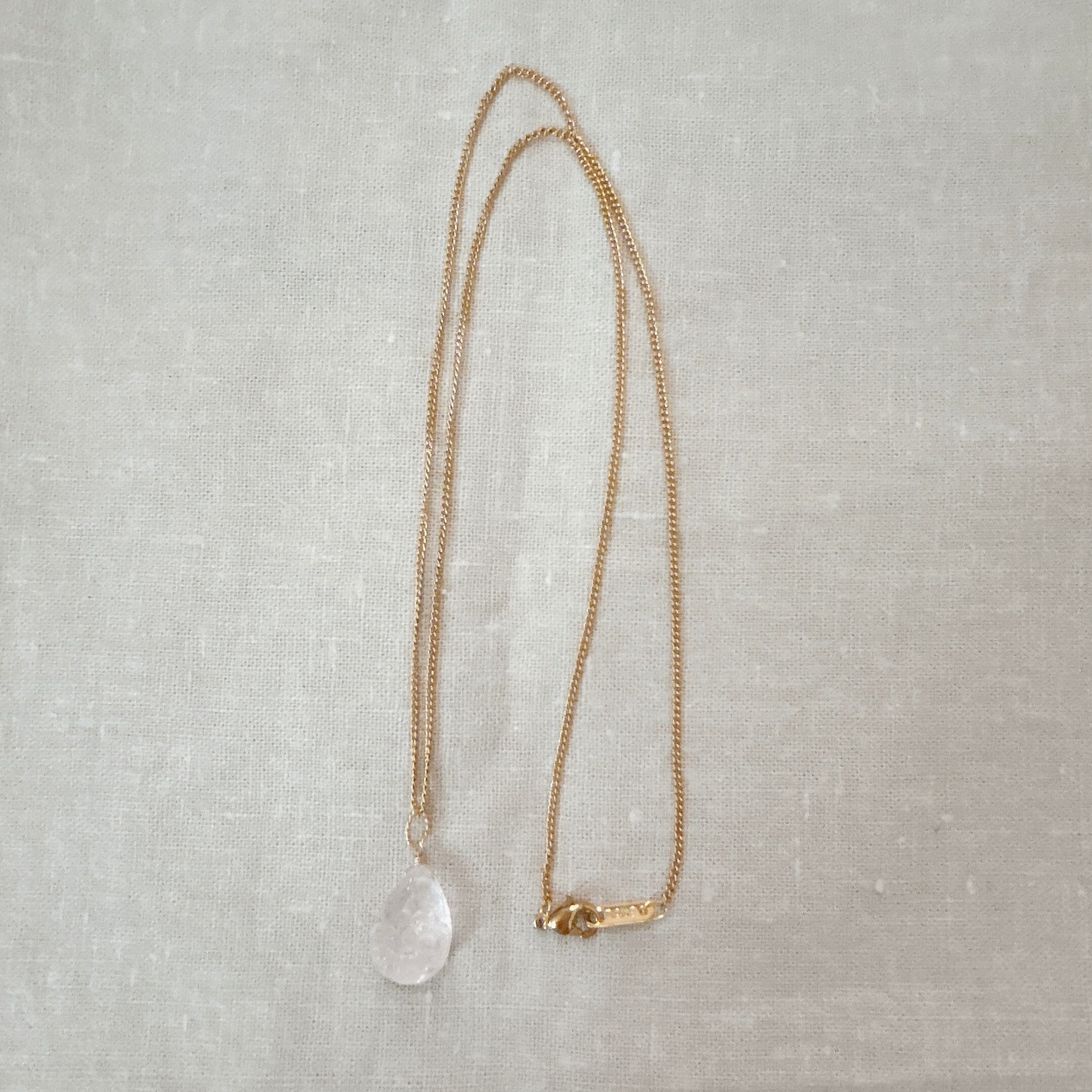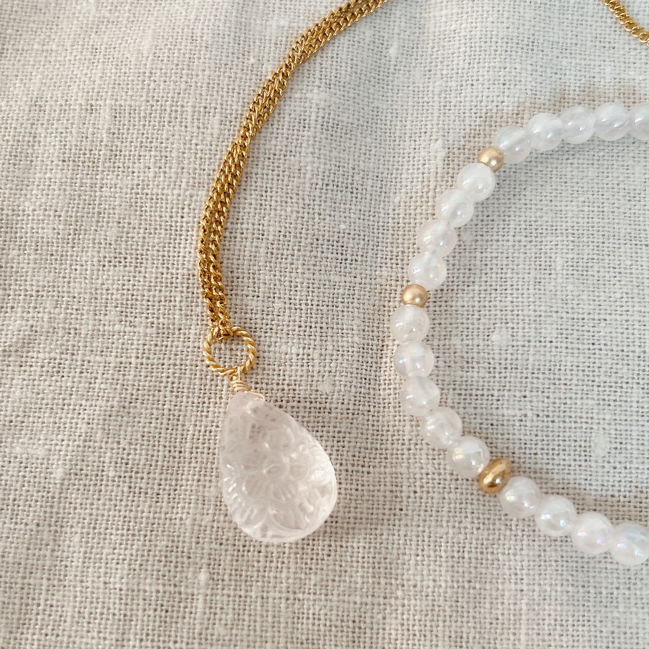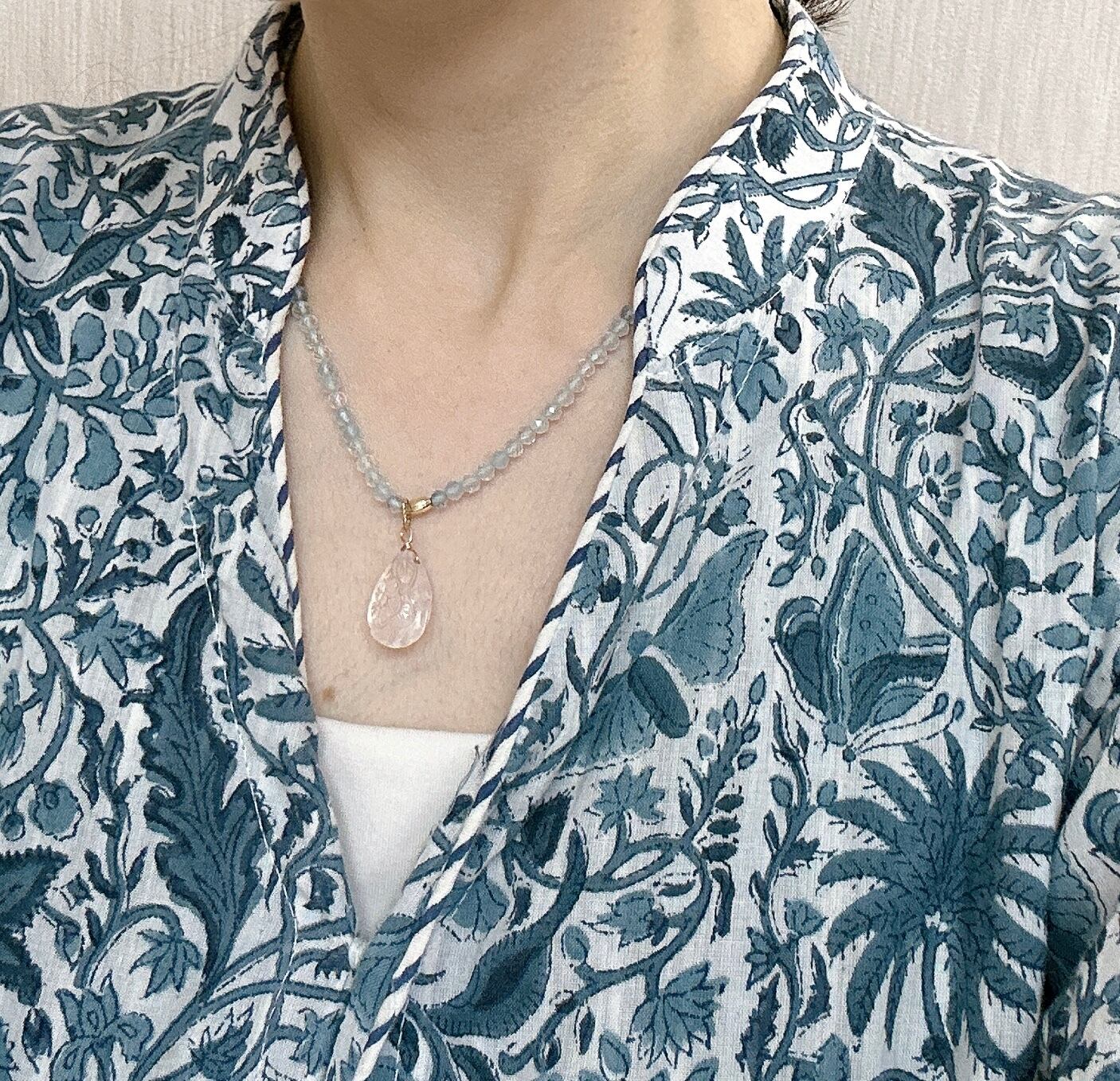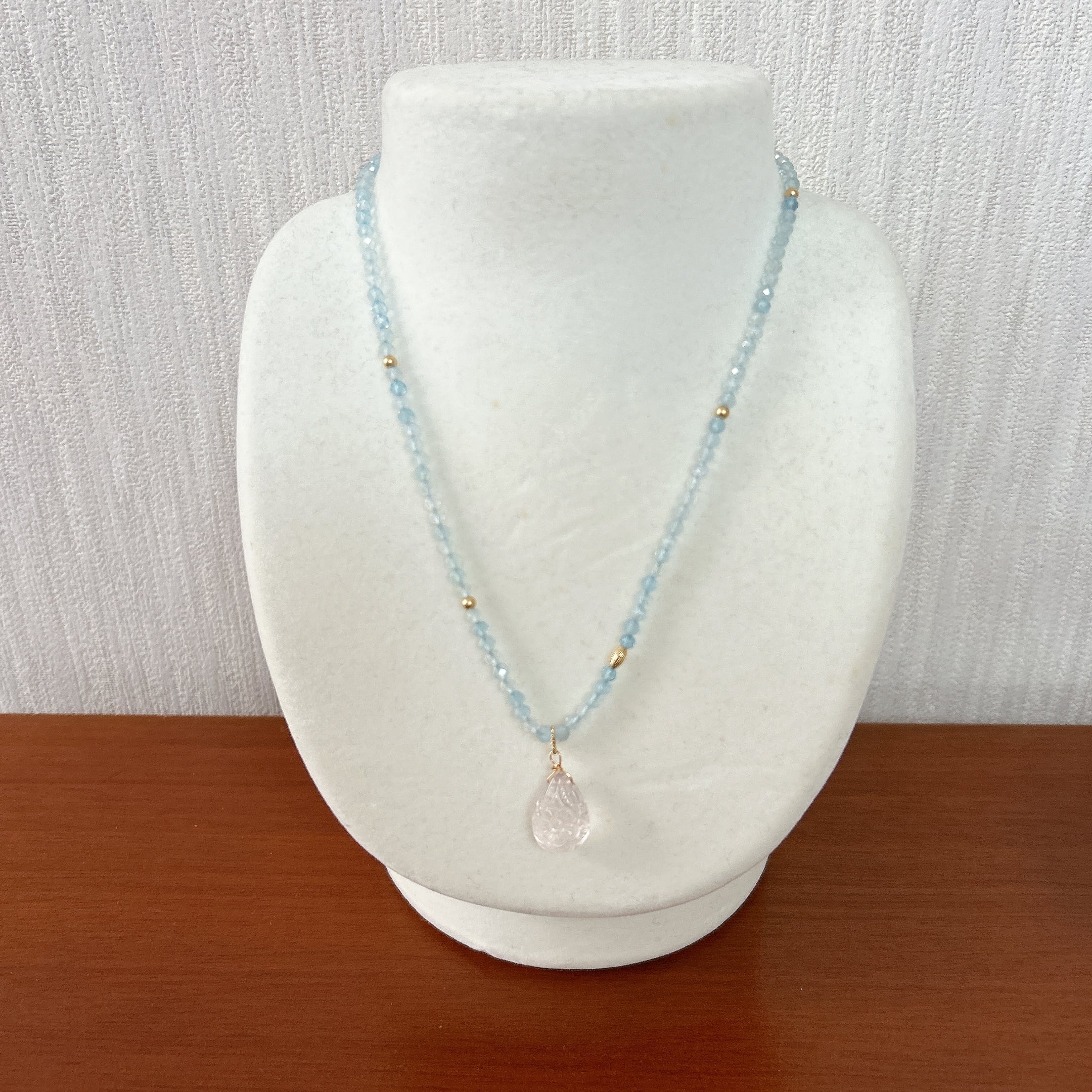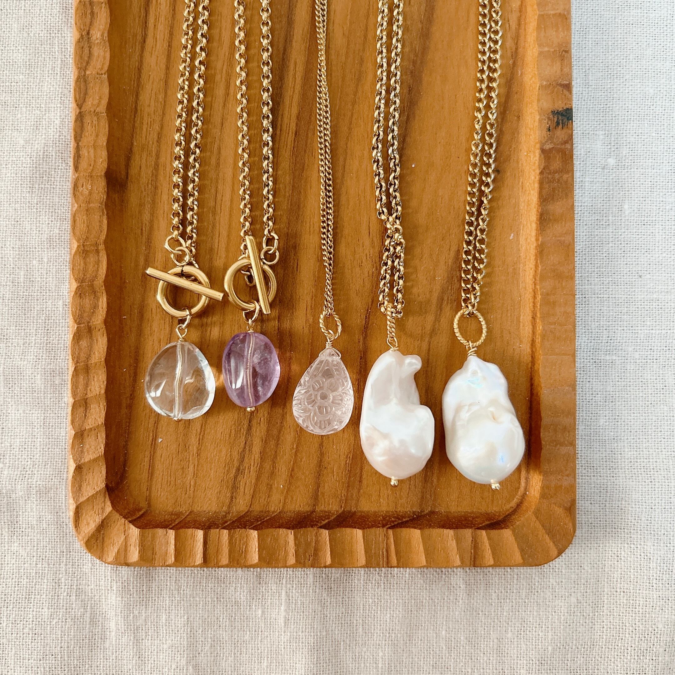 一目惚れで仕入れた、繊細なお花の彫刻が施されている大きなローズクォーツのドロップビーズ。この可愛さを生かしたくて、シンプルな一粒ネックレスに仕立てました。