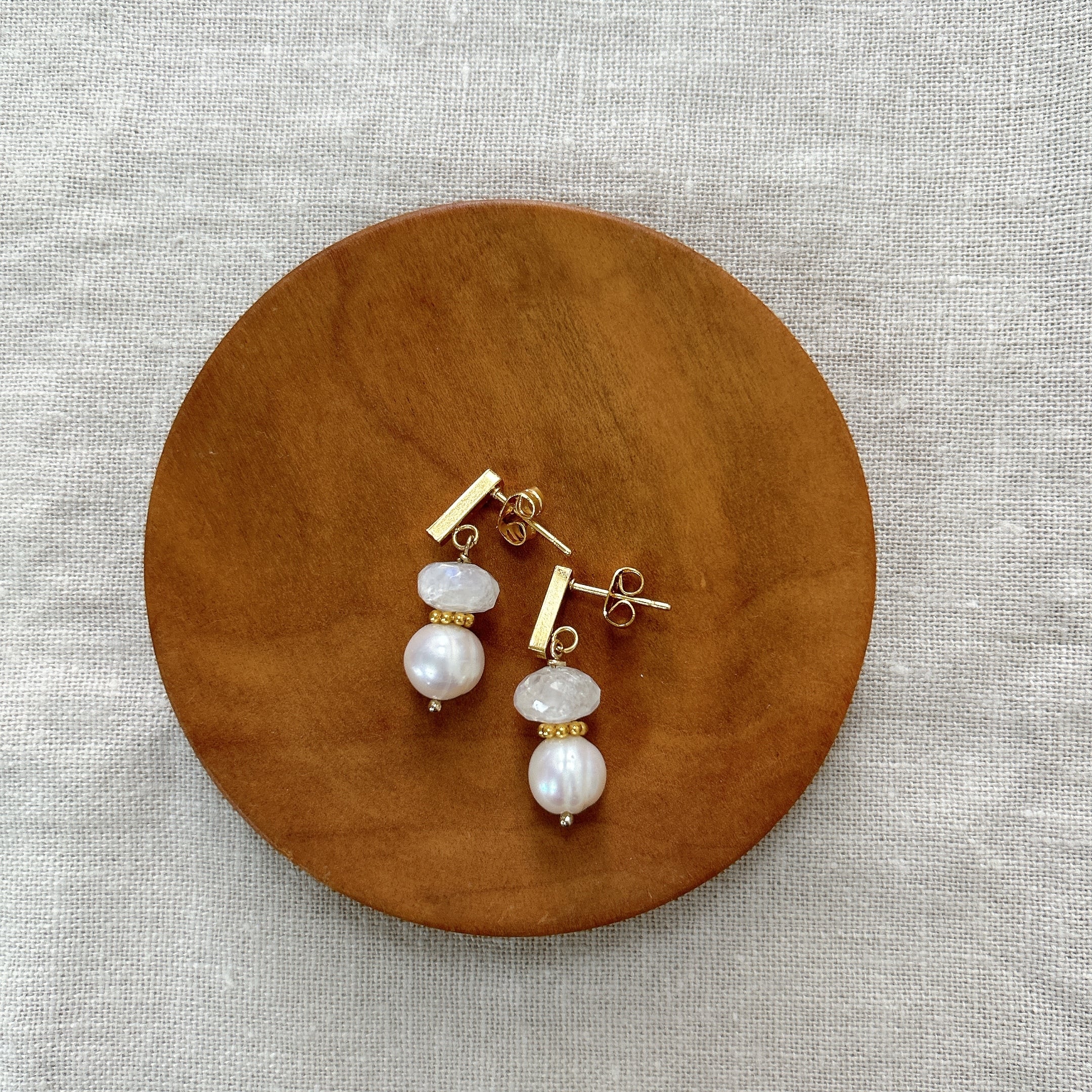 ころんとしたボタンカットのレインボームーンストーンと、大粒の淡水パールの組み合わせが可愛らしいピアス。光の加減でブルー系のシラーがとても美しく光ります。