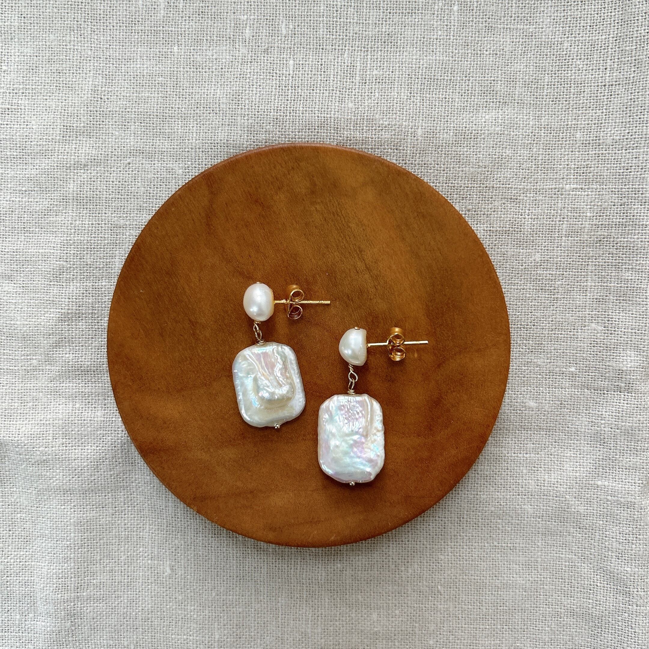 今回はレクタングル(長方形)のバロック淡水パールを合わせてみました。