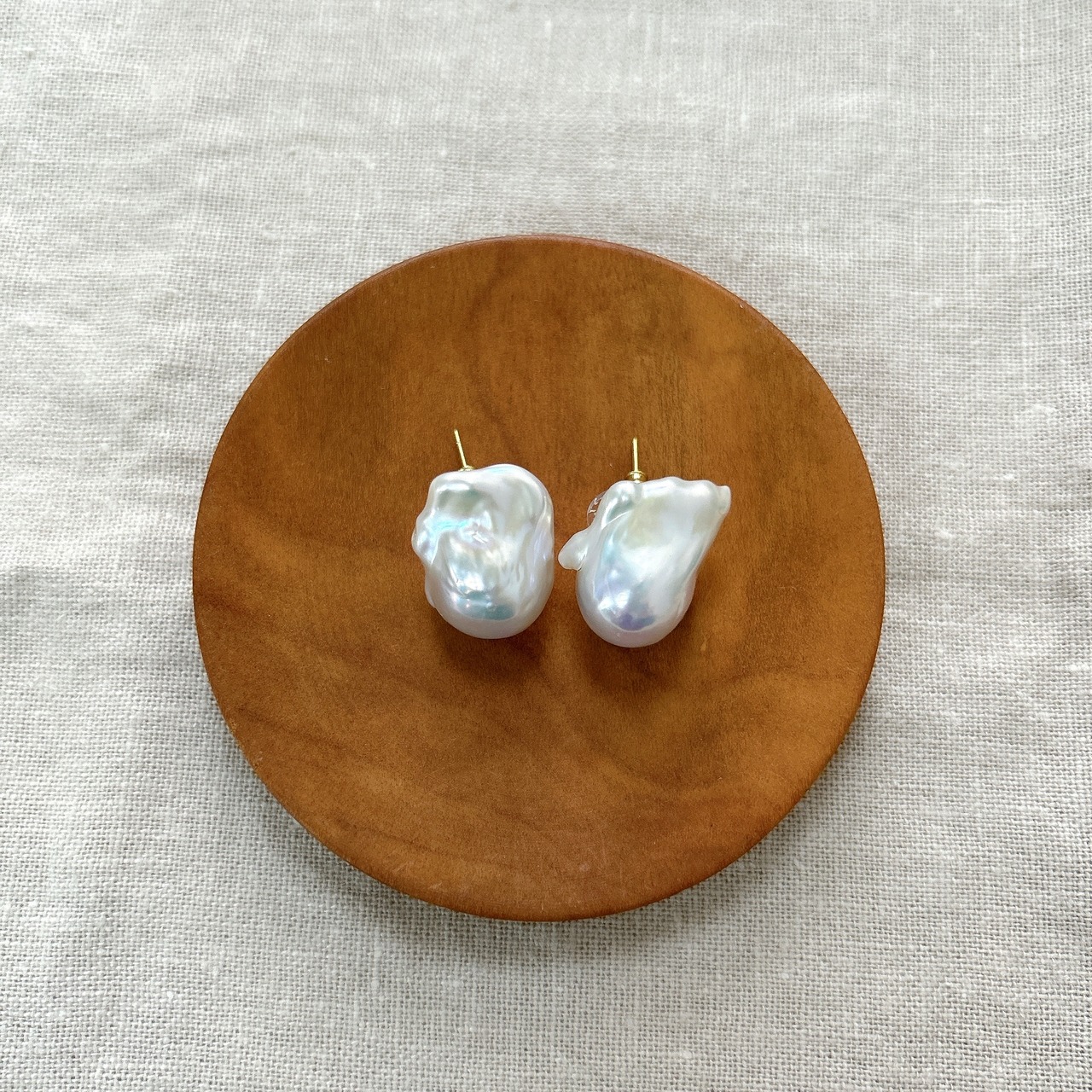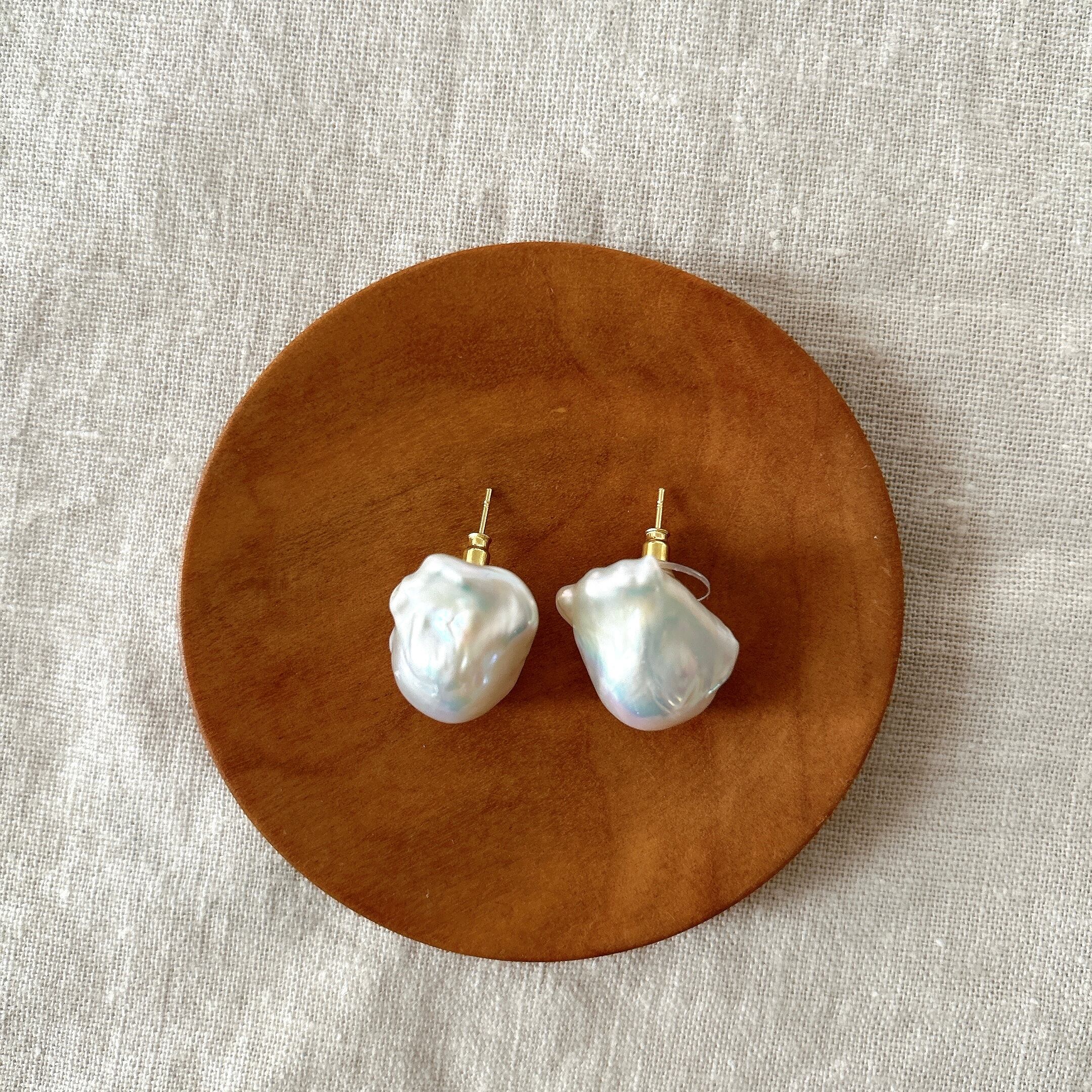 つやつや、ぷっくりのオイスターバロック淡水パールを、そのままの形を生かした一粒スタッドピアスに仕立てました。