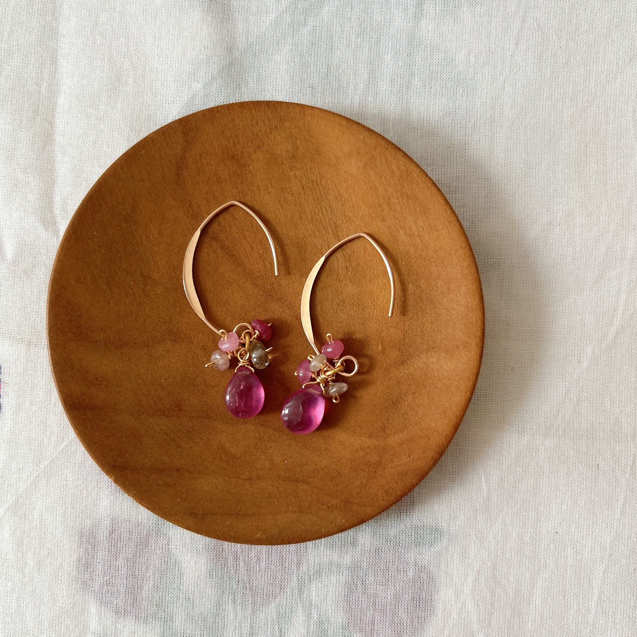 同じコランダムという鉱物であるピンクサファイアの小粒と合わせた、華やかなフリンジピアス。肌馴染みの良いピンクゴールド色のフックをあしらいました。
