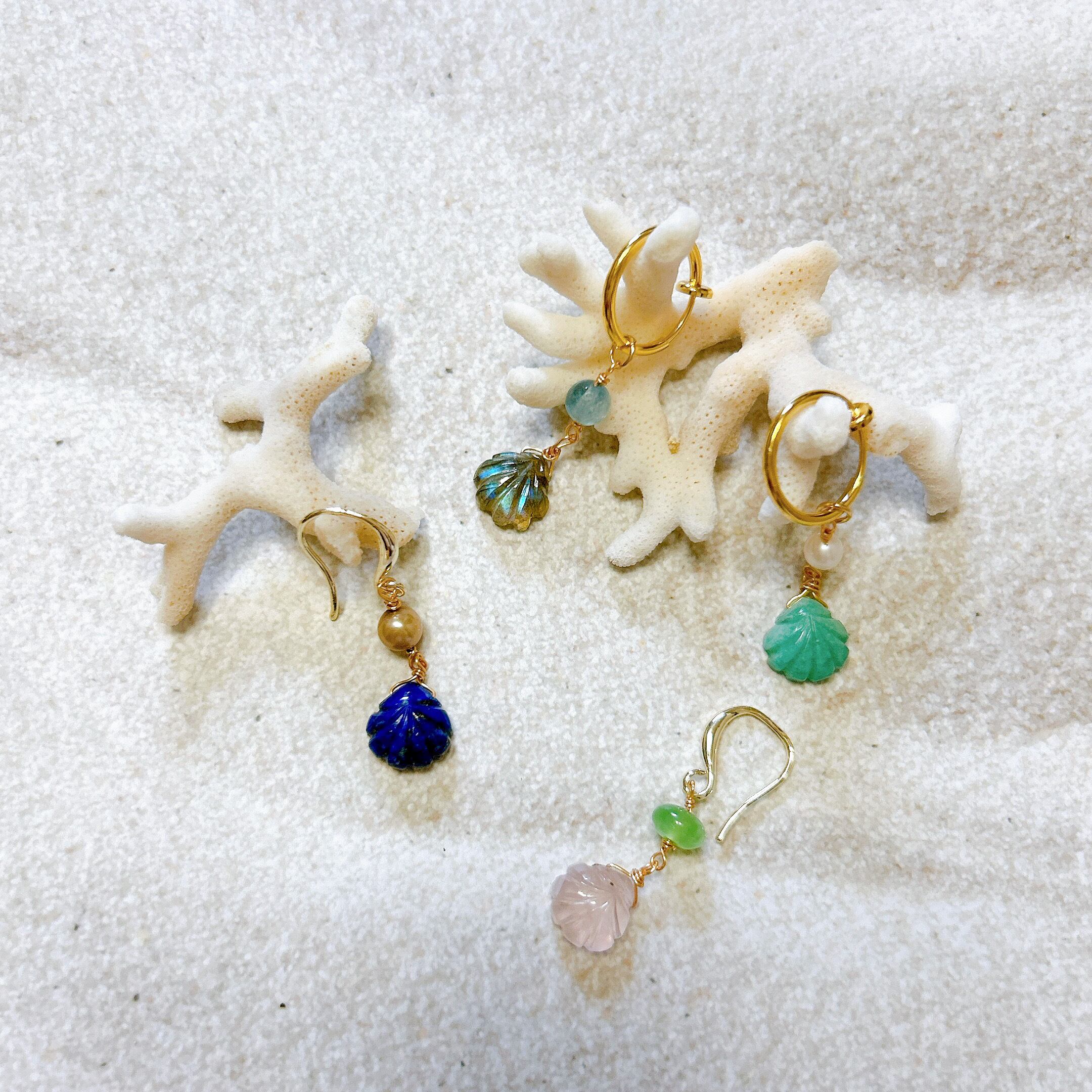 夏らしいシェル型にカービングされた天然石のイヤーアクセサリー。atelier nar初のイヤーカフが登場です!