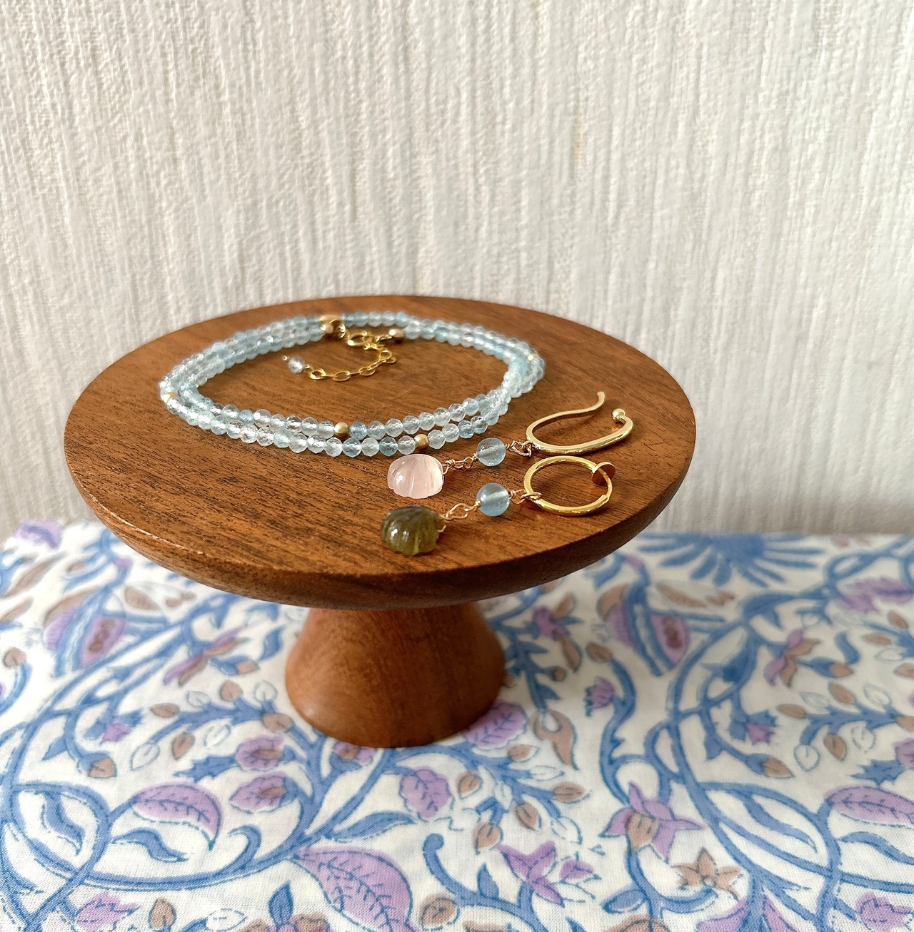 こちらのローズクォーツには、海を思わせる淡いブルーのアクアマリンと、キュートなアップルグリーンのクリソプレーズを組み合わせました。