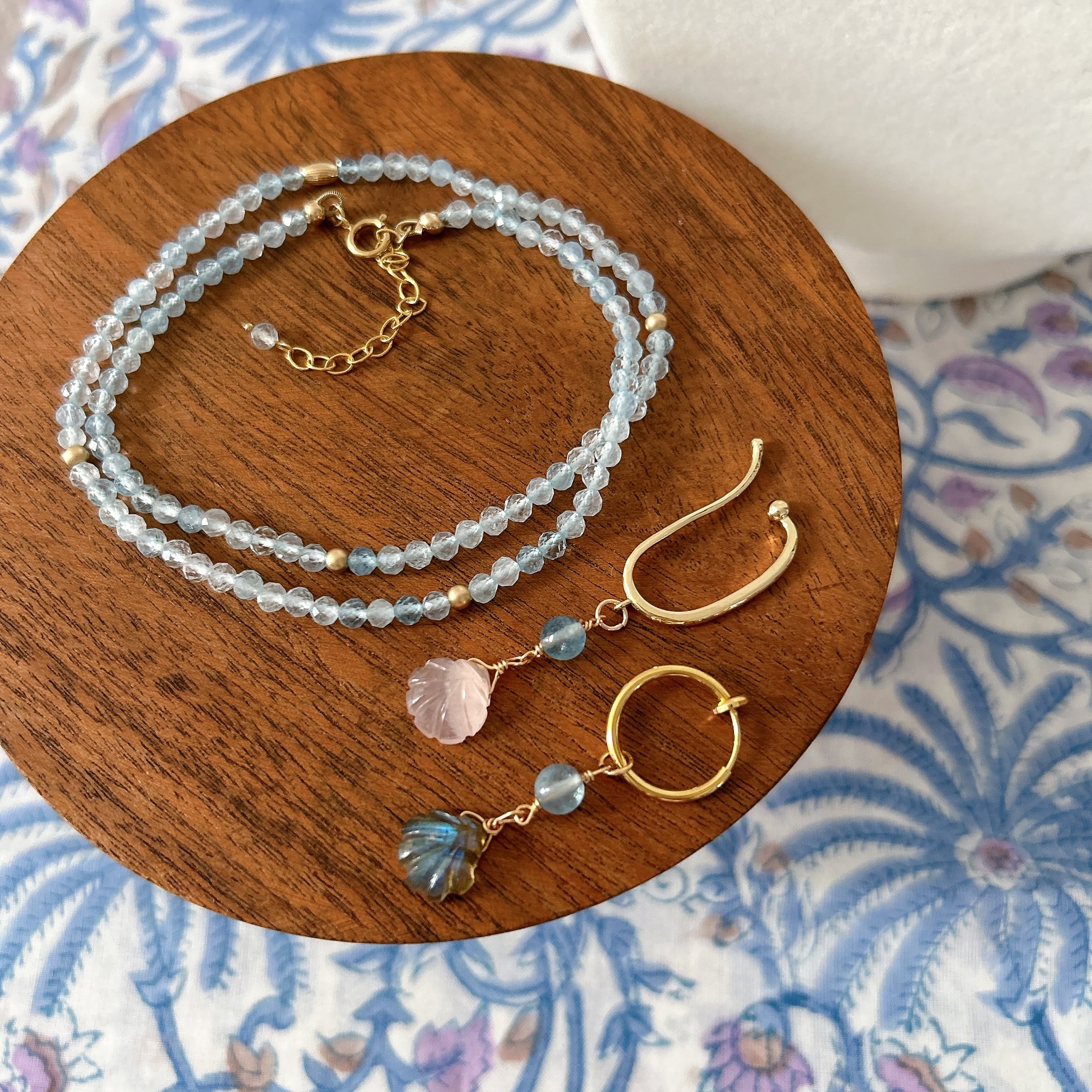 こちらのアクアマリンは、遠浅の海のような淡いブルーが清涼感たっぷりで、夏の素肌にぴったり。時折混じっている濃いめのブルーがまた美しいんです。