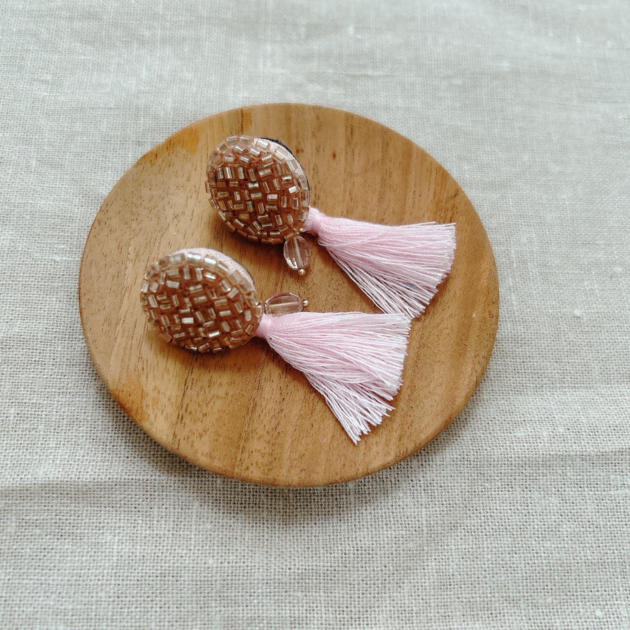 パールビーズのボタンには淡いピーチピンクのタッセルと同系色の淡水パール、ピンクゴールドのビーズには桜色のタッセルとカットの美しいローズクォーツを合わせました。