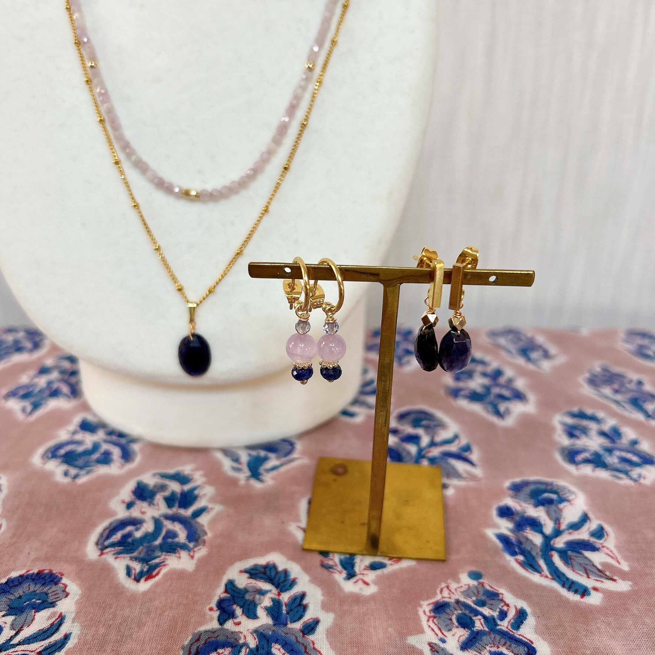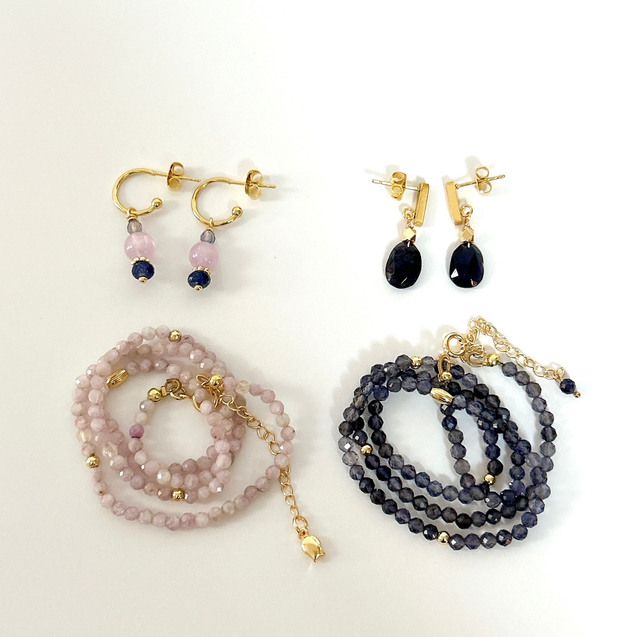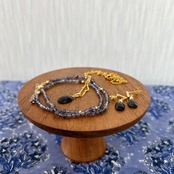 お揃いのデザインのネックレスや、アイオライトのブレスレット、ショートネックレスもご用意していますので、ぜひセットでお楽しみくださいね。