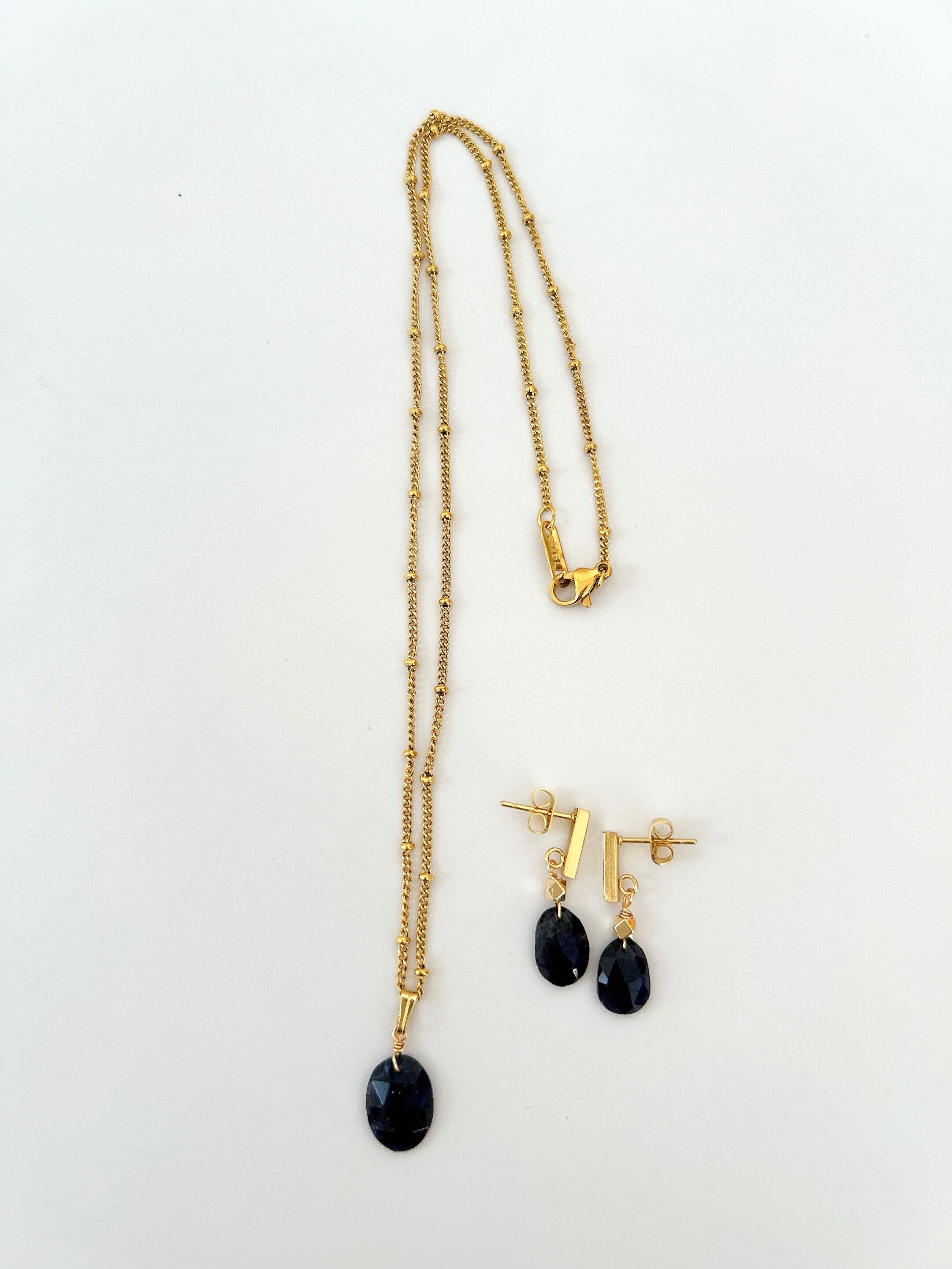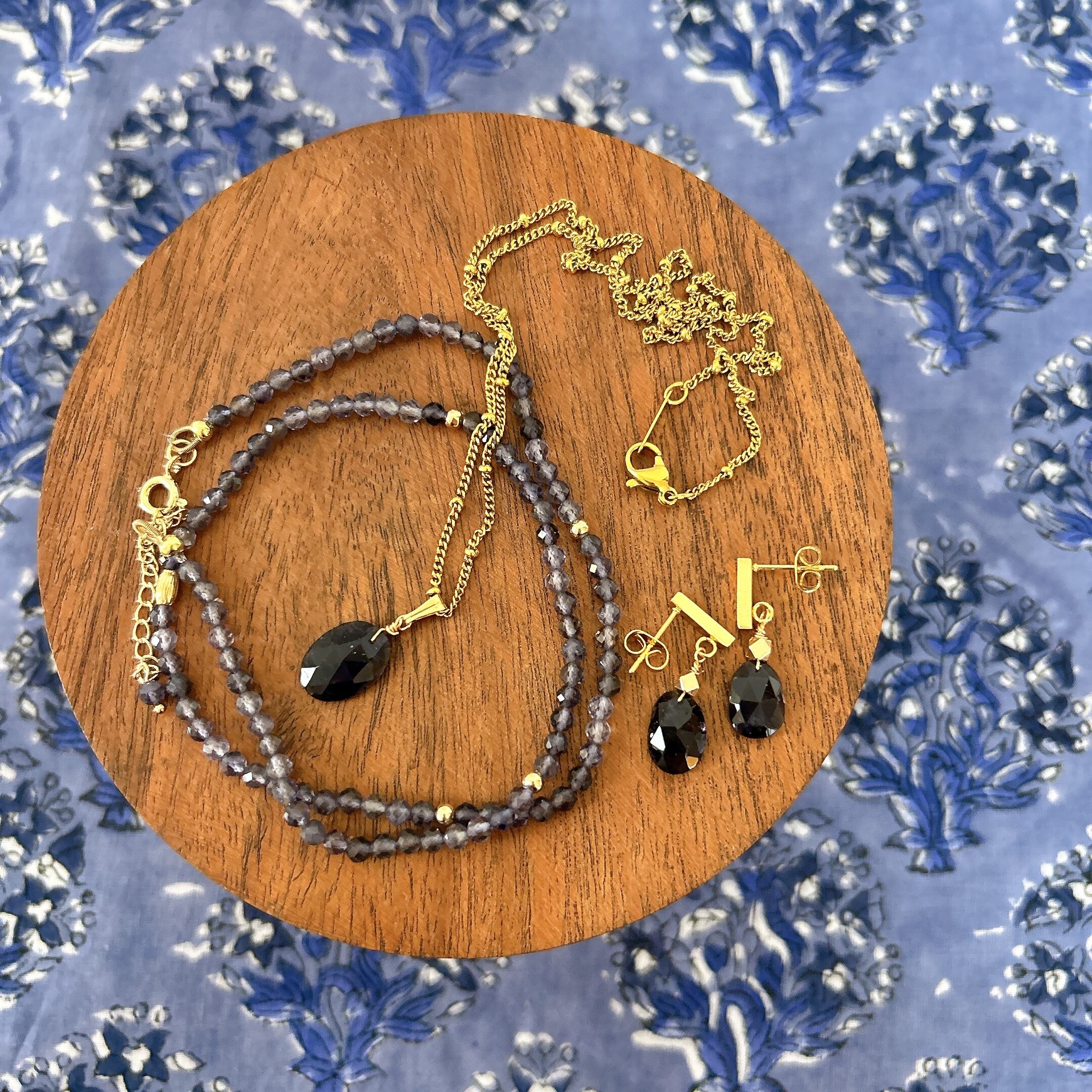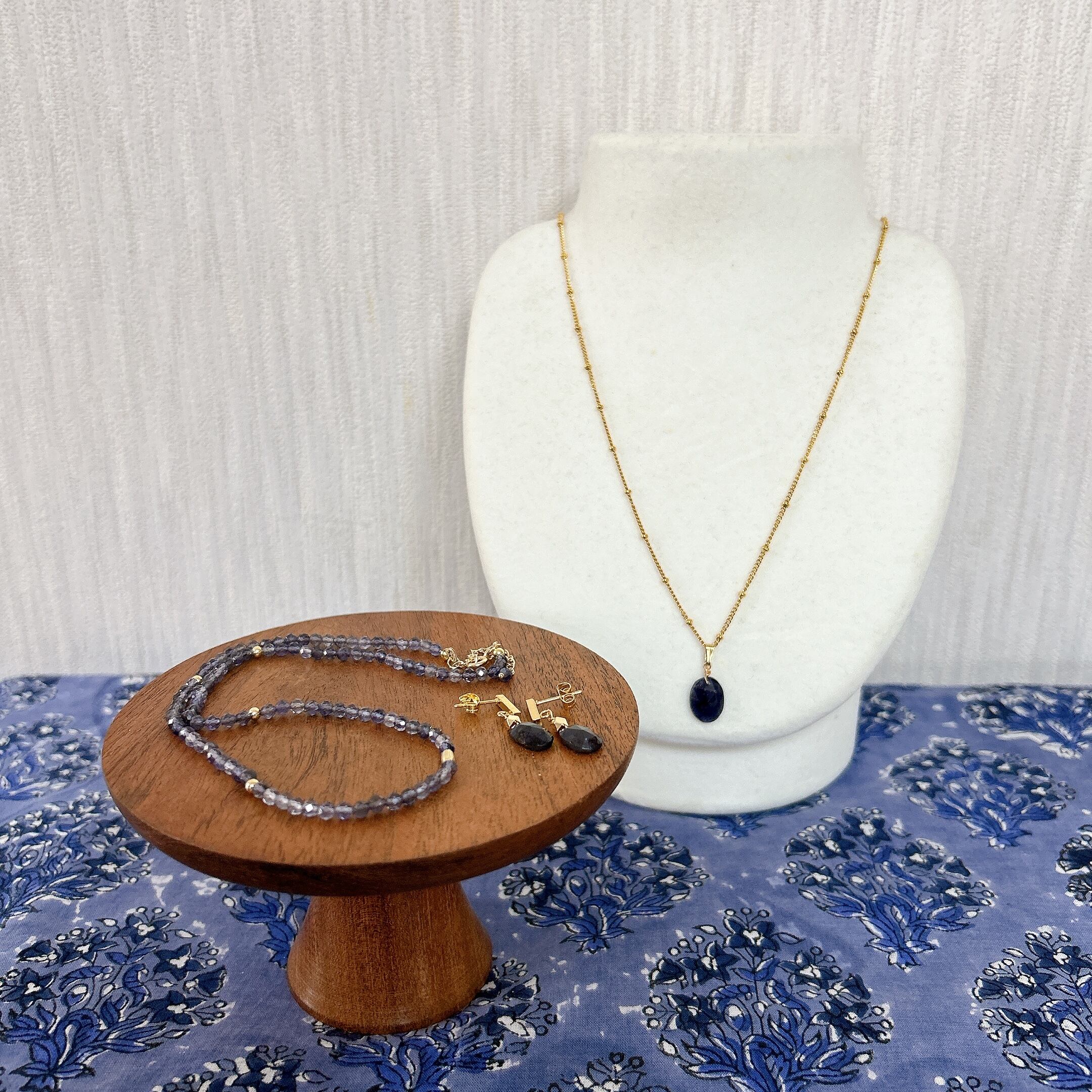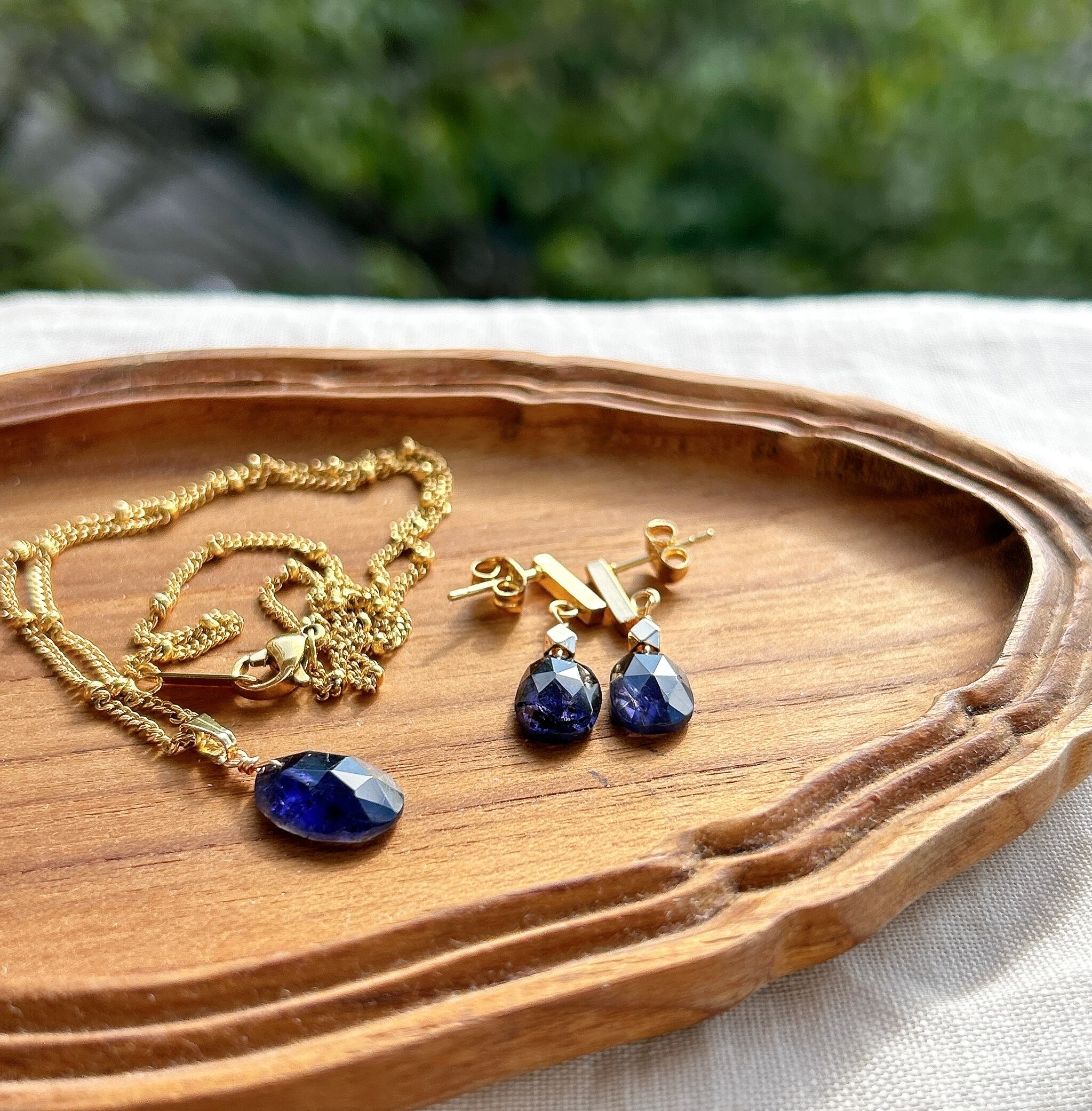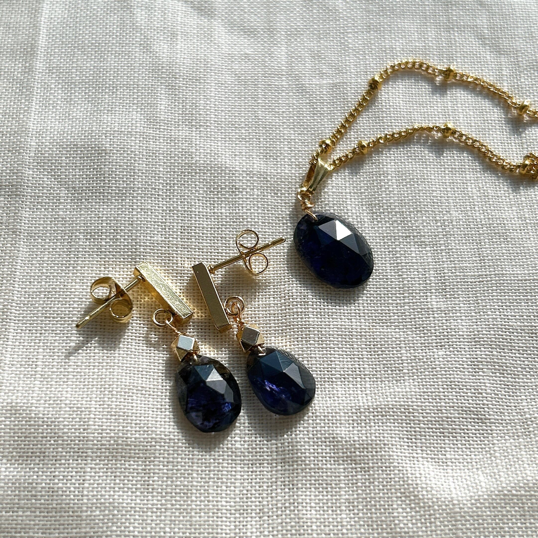 お揃いのデザインのピアスや、アイオライトのブレスレット、ショートネックレスもご用意していますので、ぜひセットでつけてみてくださいね。