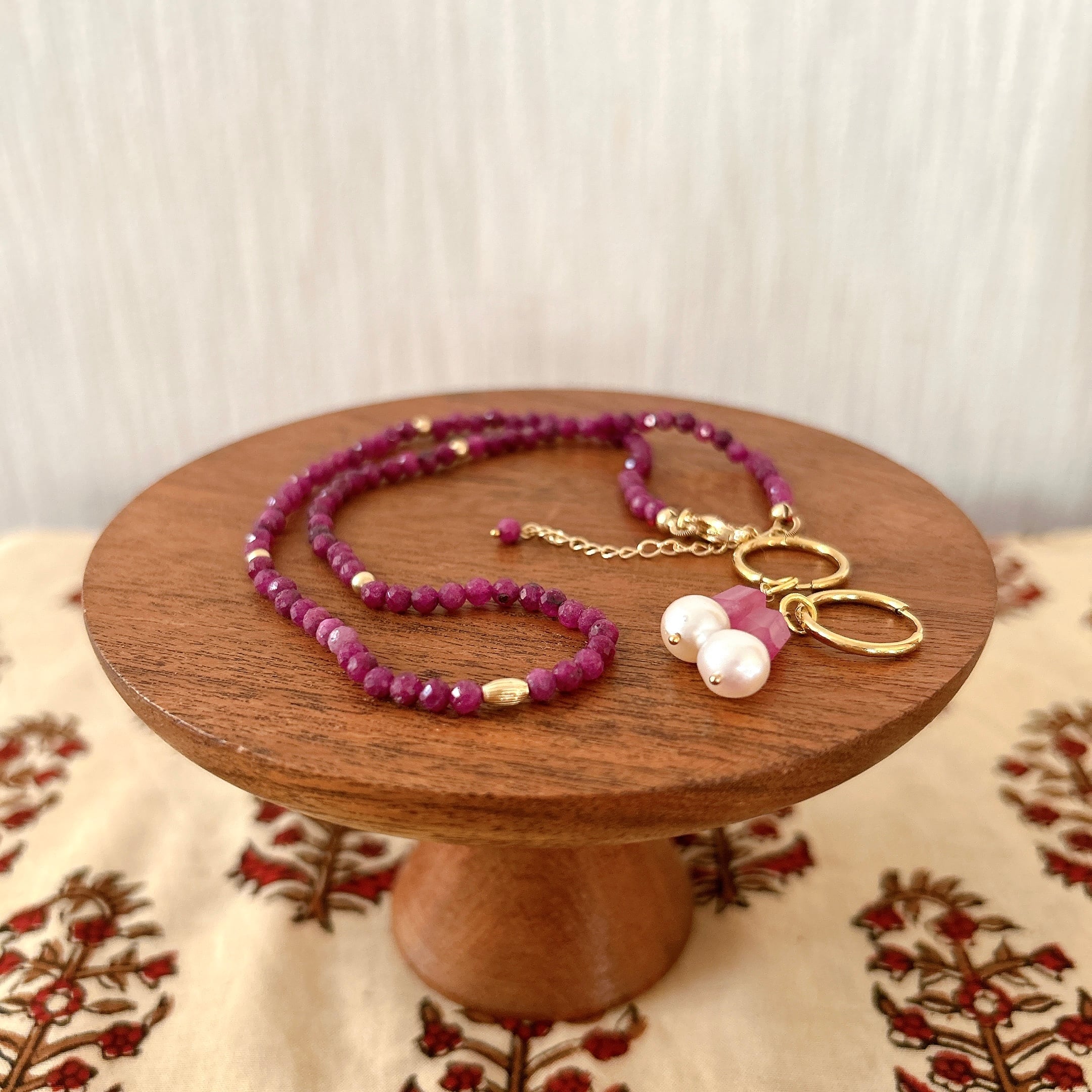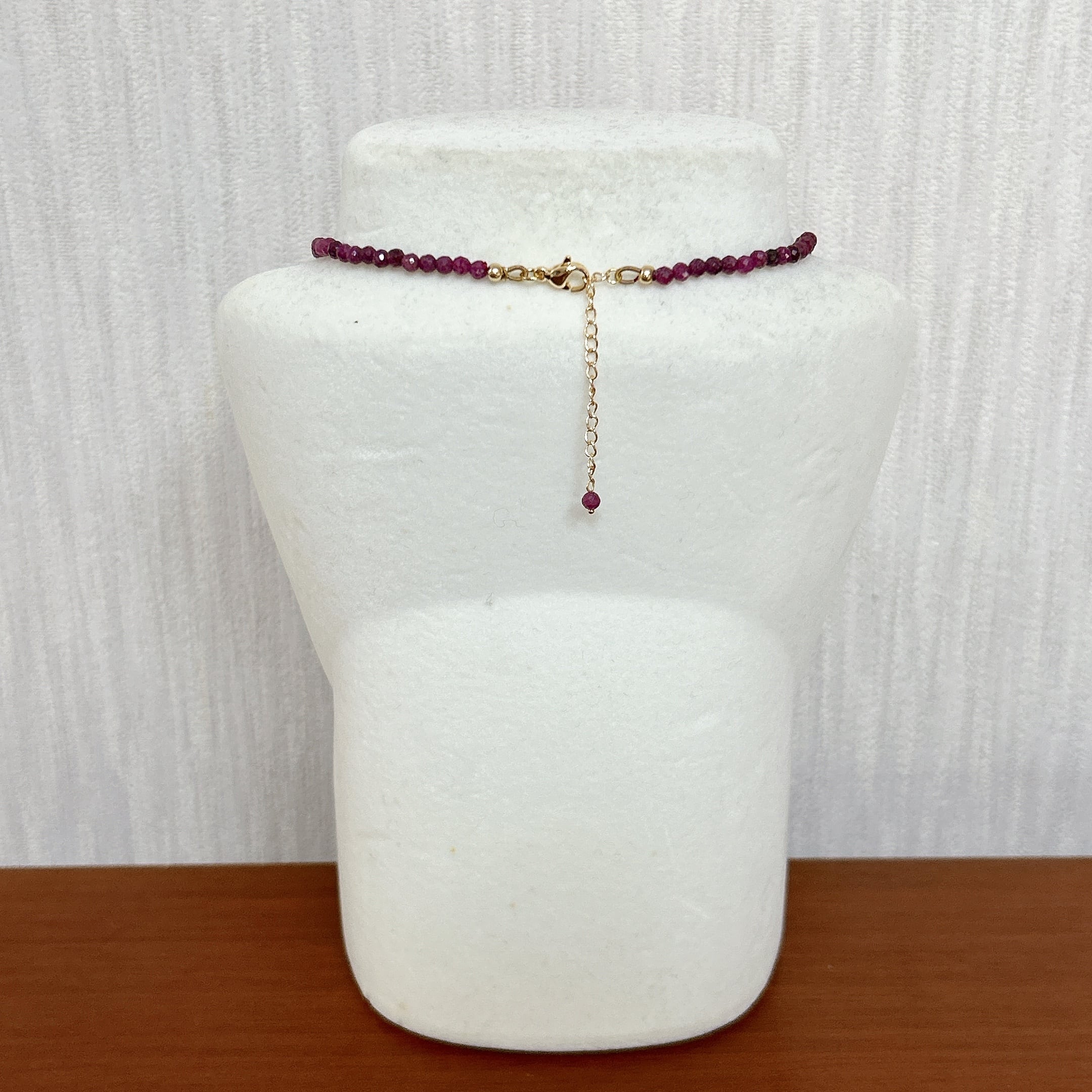 <素材>ルビー、K14GF(留め具、アジャスターチェーン、ゴールドビーズ)、シルク糸