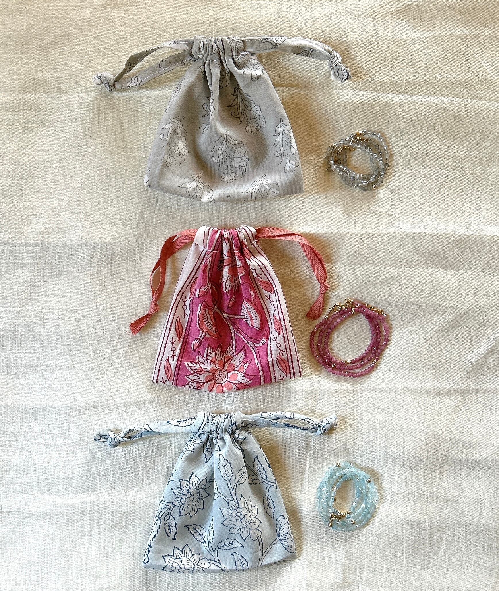 天然石のカラーに合わせた、ブロックプリントの巾着に入れてお届けします。(写真は一例です)