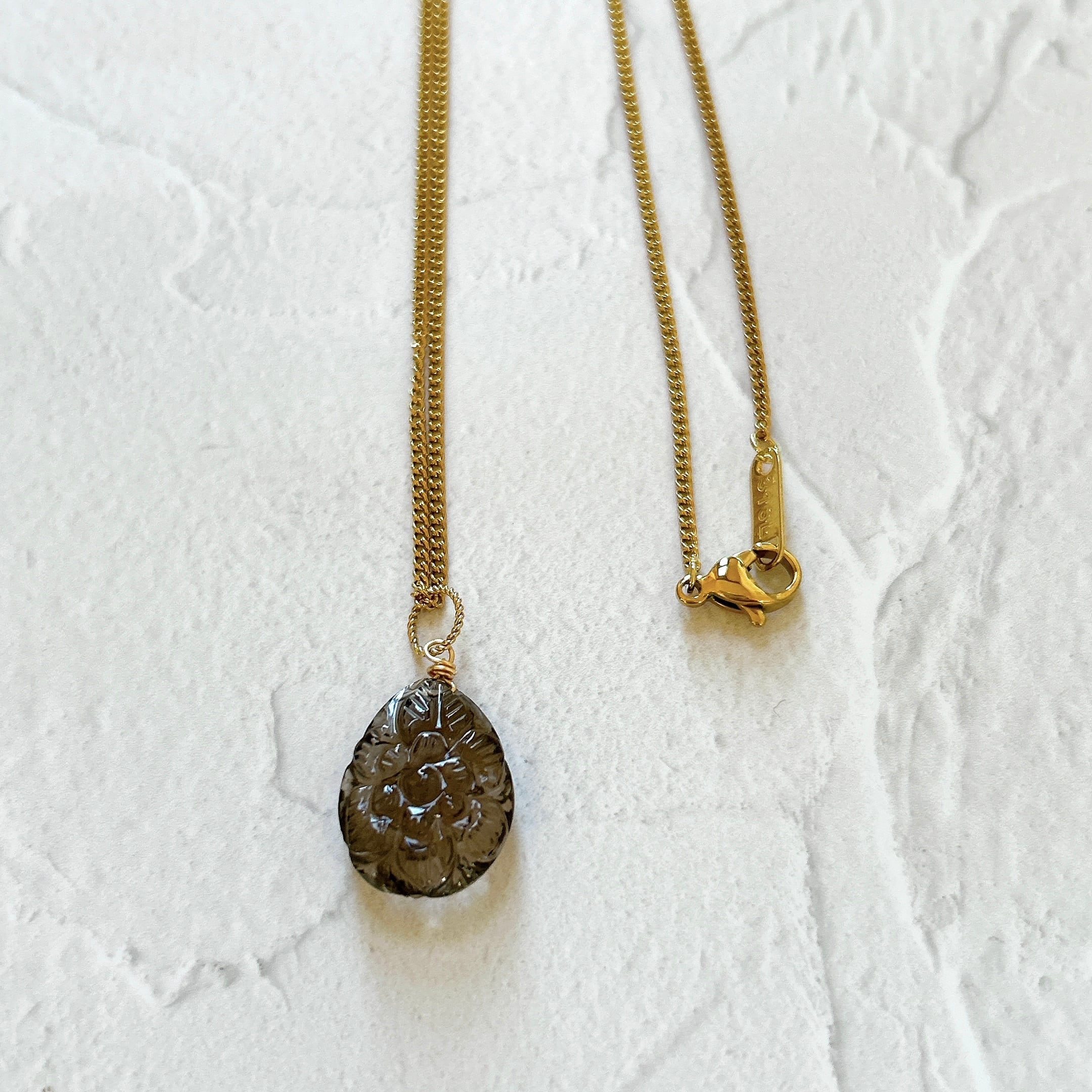 インドの職人によって繊細なお花の彫刻が施された、スモーキークォーツの大粒ドロップを使いやすいミドルネックレスに仕立てました。