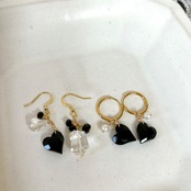 ブラックオニキスハートとパールのピアス・イヤリング P-144