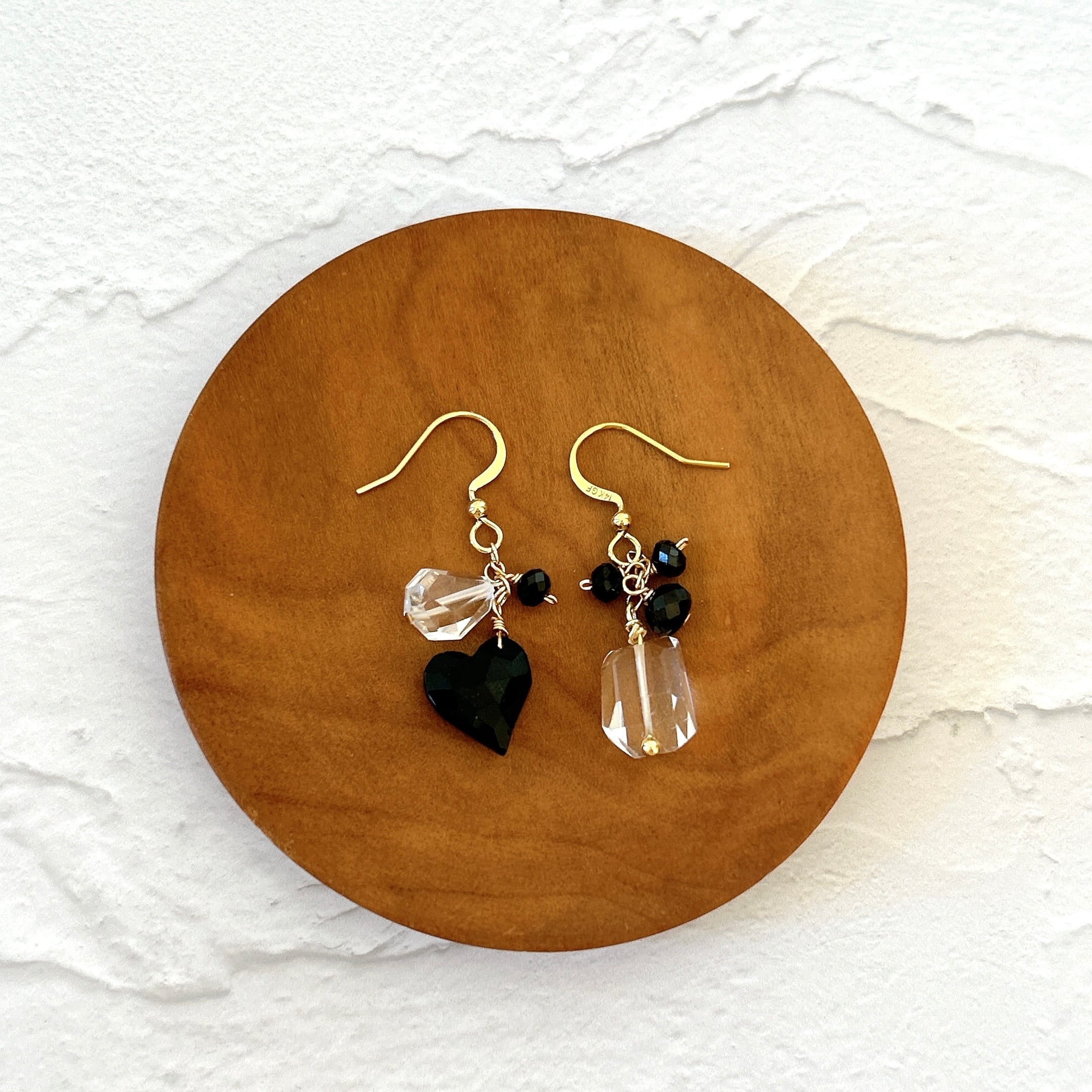 ブラックオニキスハートとクリスタルのアシンメトリーピアス P-143