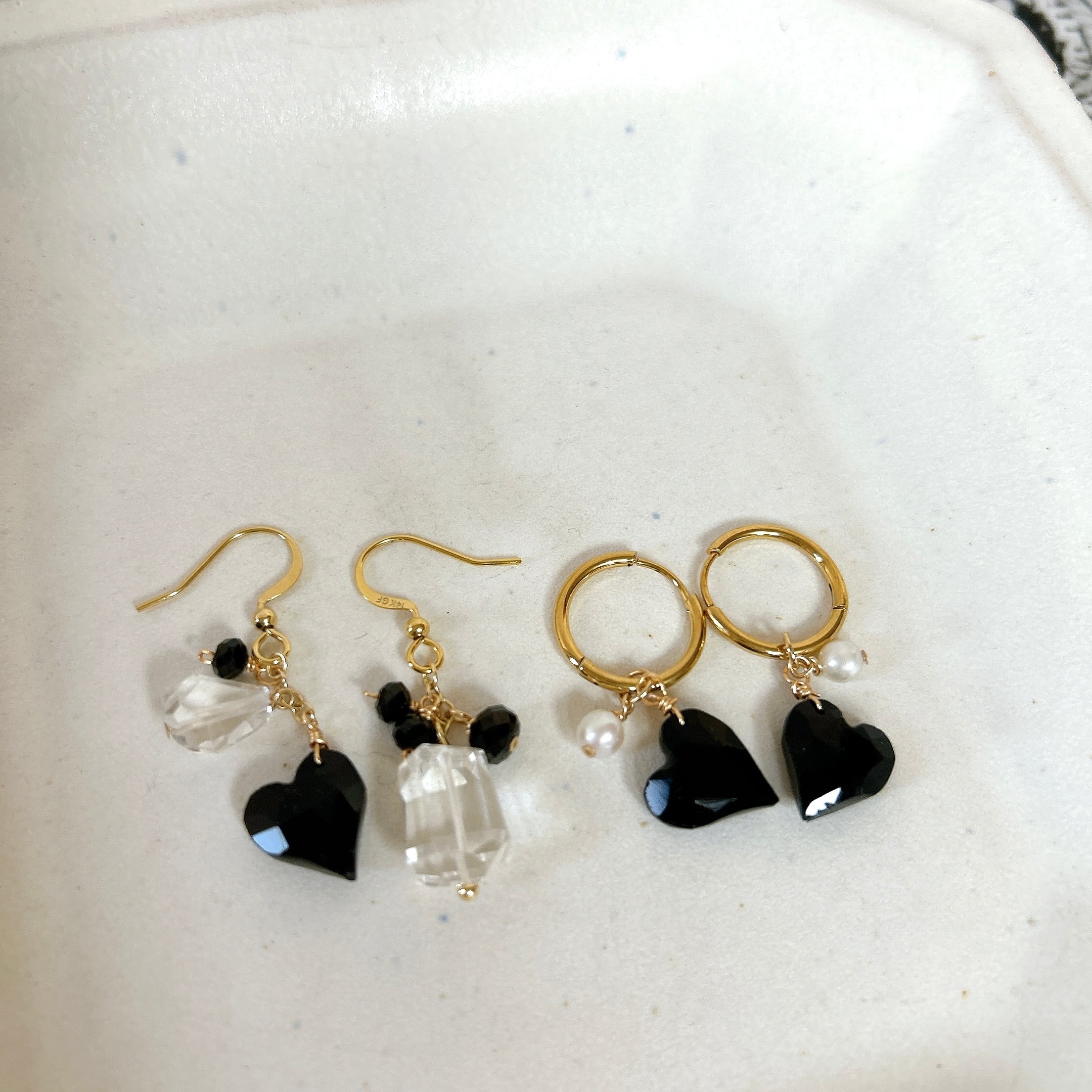 キュートなブラックオニキスのハートを見つけましたので、2種のピアスイヤリングに仕立てました。
