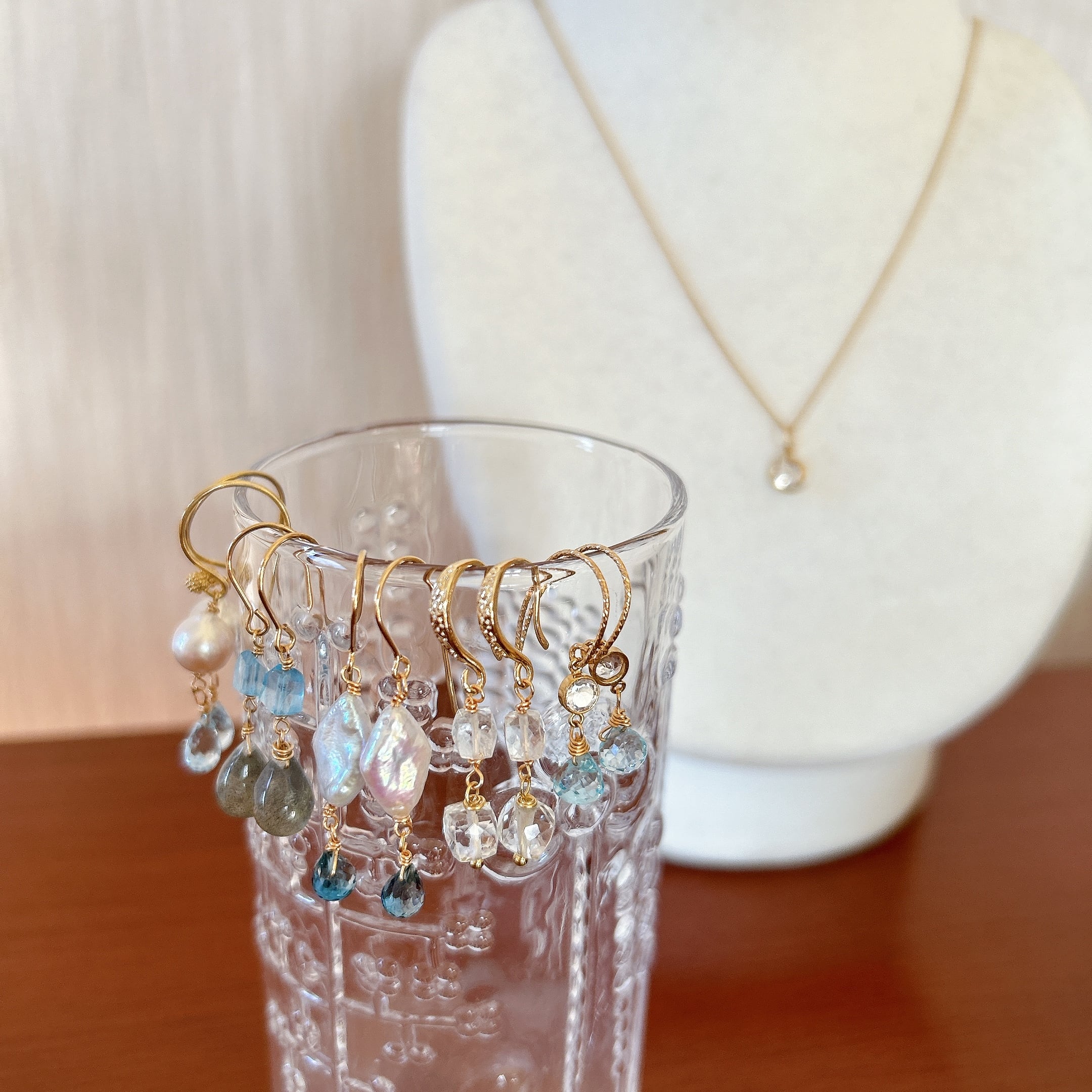 同時発売の、ホワイトトパーズの一粒ネックレスと一緒に着けても素敵ですよ。