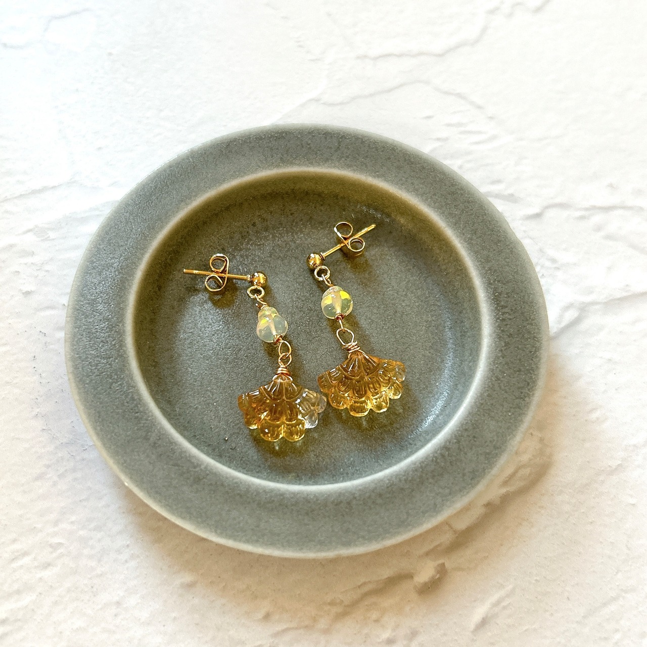 こちらは「ファン・カービング」と呼ばれる、扇型に繊細な彫刻が施されたシトリンにプレシャスオパールを合わせたピアスです。