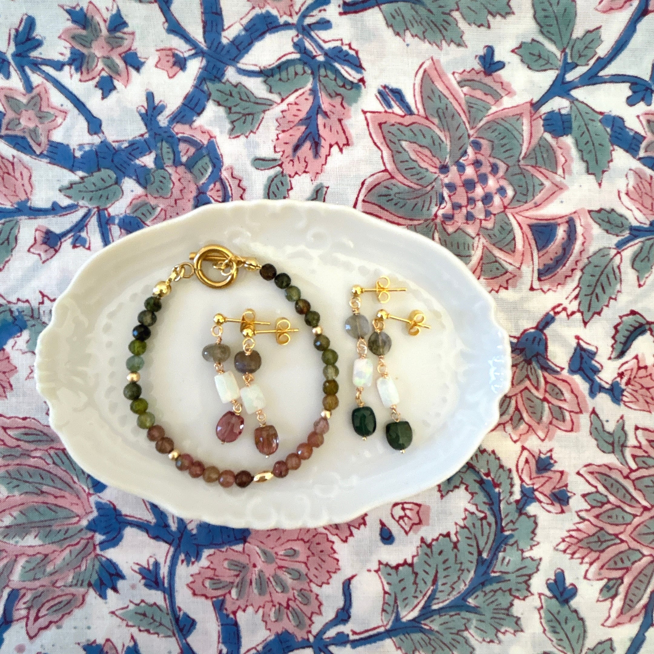 こちらは、絶妙なベージュピンクや、ダークグリーンにほんの少しブルーを混ぜたようなブルーグリーンのトルマリンに、遊色の美しいオパールとラブラドライトを組み合わせた、とにかくお色の出方が楽しくも美しいお品です。