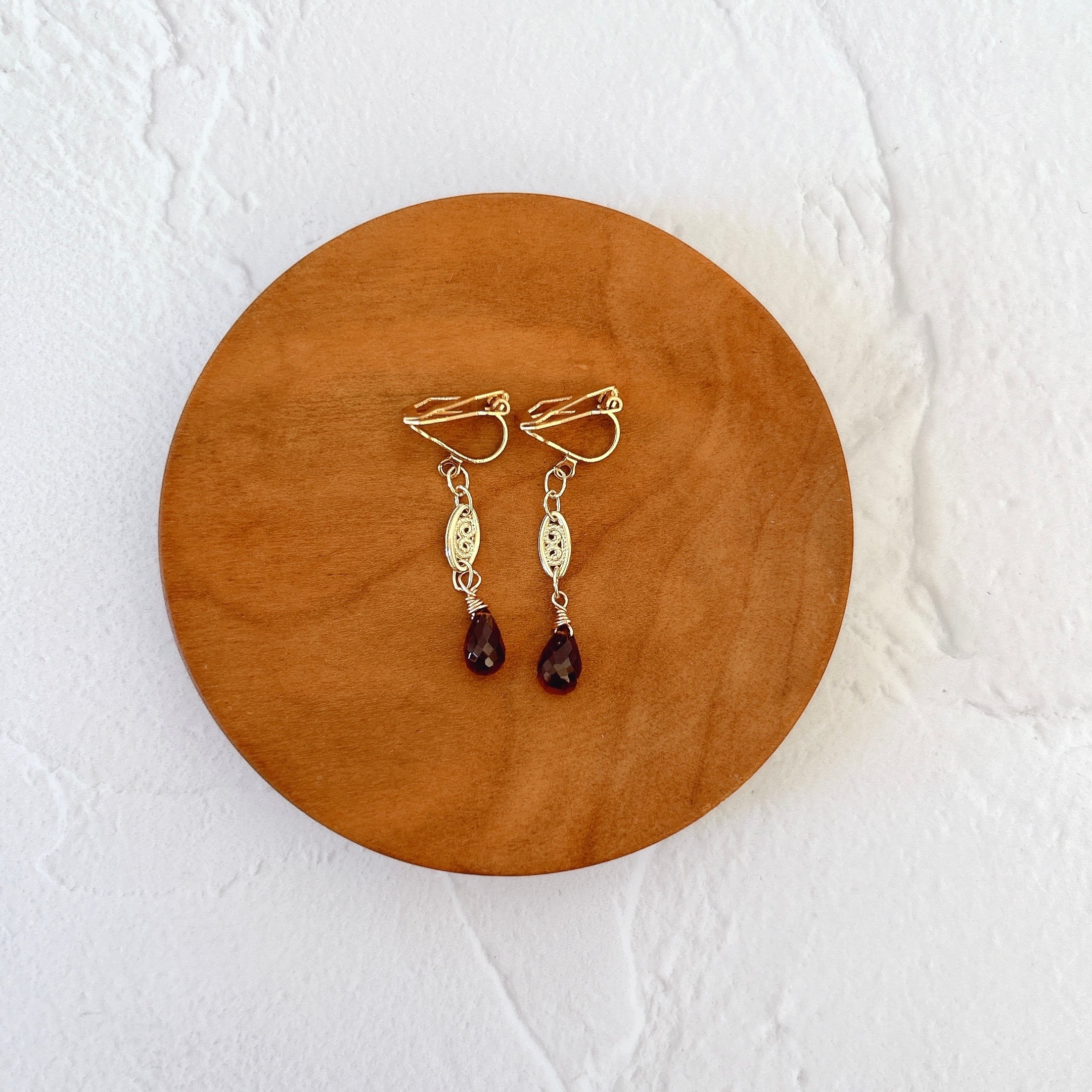 <素材>ガーネット、K14GF(ワイヤー、ゴールドパーツ、ピアス金具)、サージカルステンレス(クリップ式イヤリング)