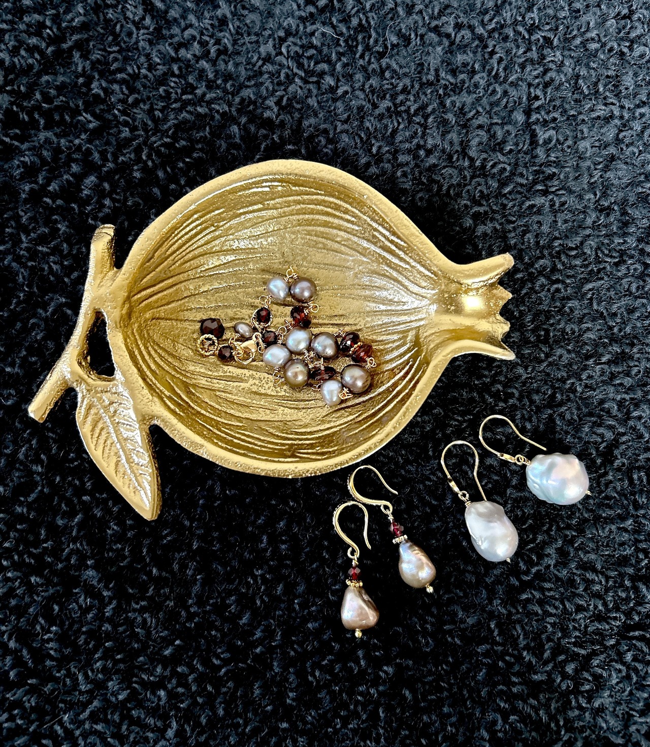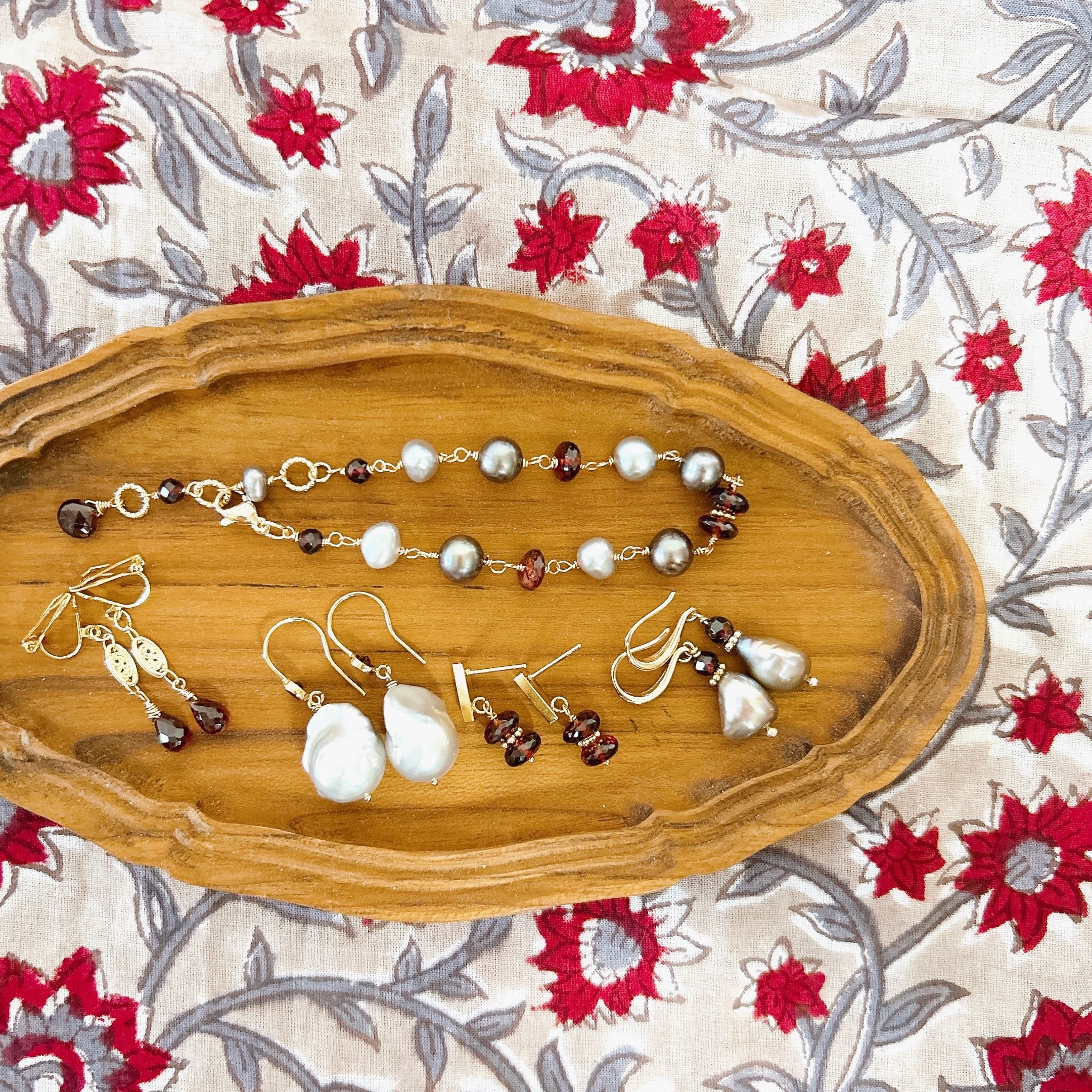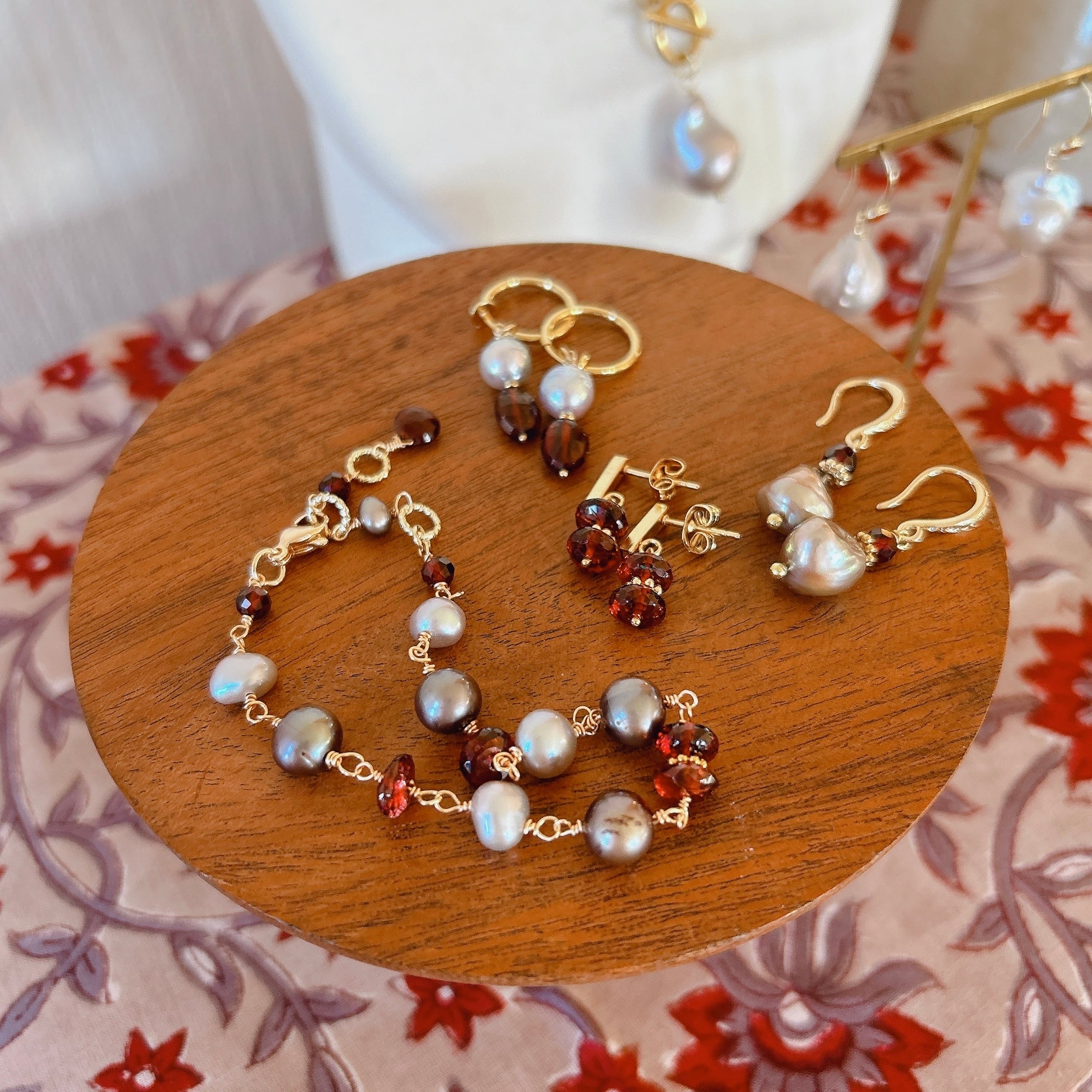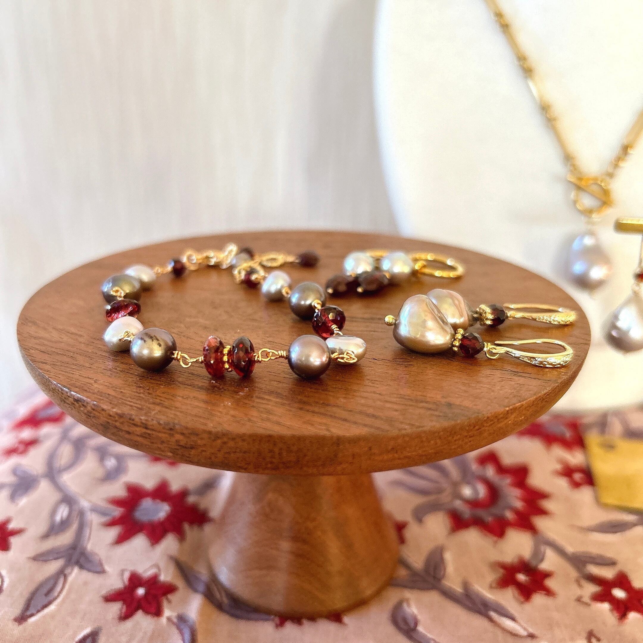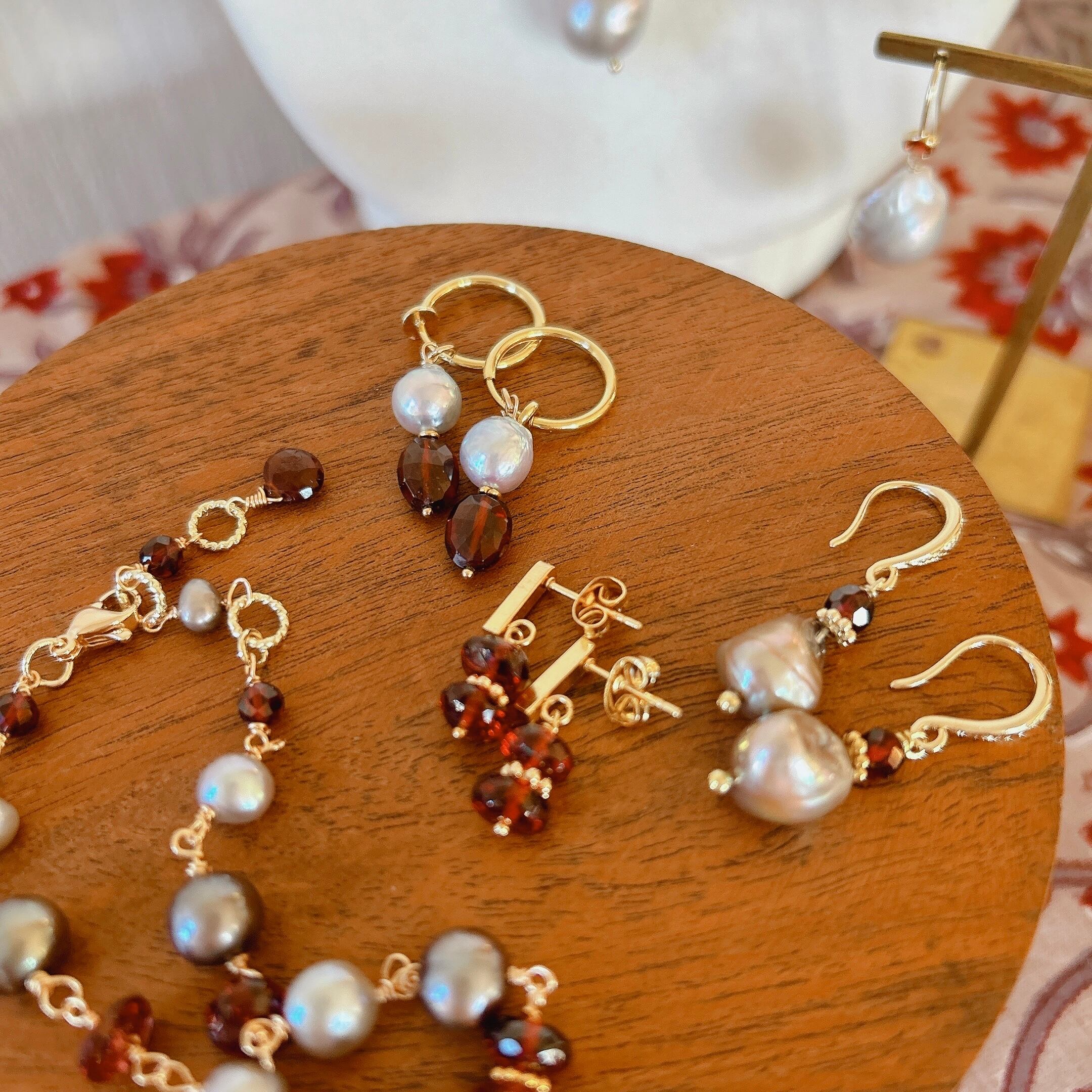 ガーネットやシルバーパールのブレスレット、ネックレスもご用意していますので、ぜひ合わせてお楽しみください。