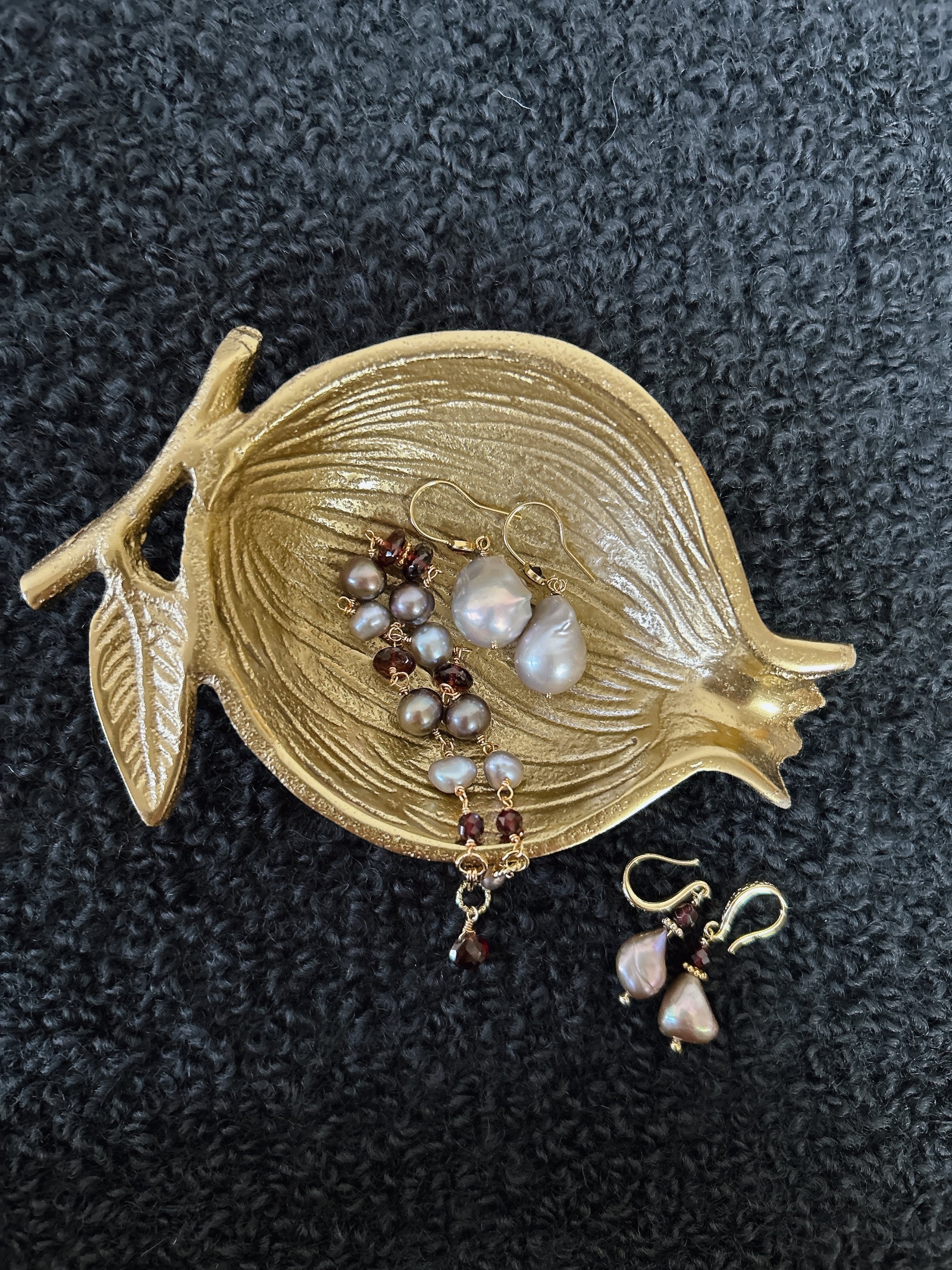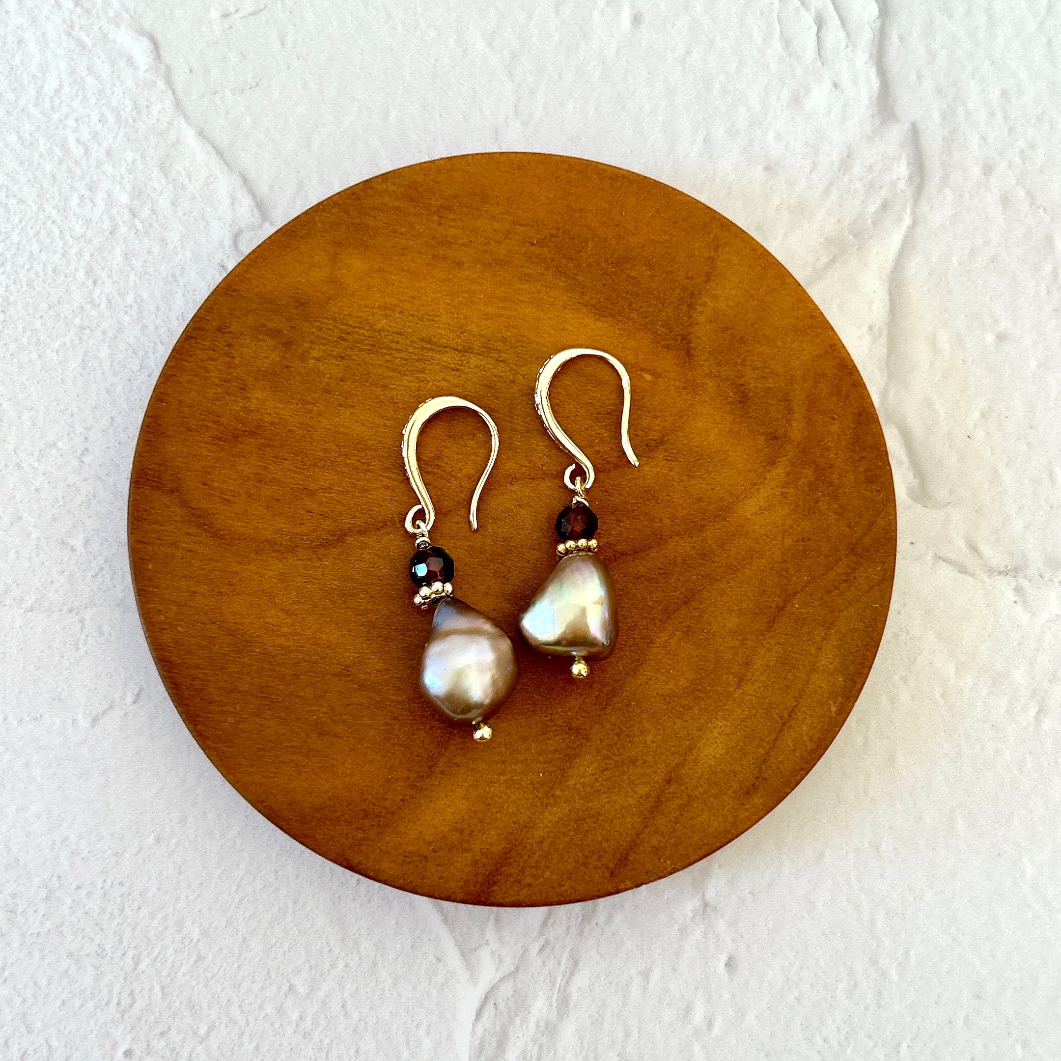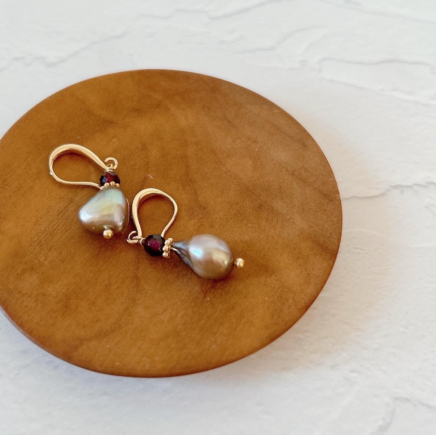 ご用意しました。こちらは、いびつな形(バロック)がユニークなグレーの淡水パールに、小粒のガーネットを一粒合わせました。ピアスフックも彫りの入ったクラシカルなものを使用しています。パールの形がユニークなので、再販があっても次回は違った形のパールになります。