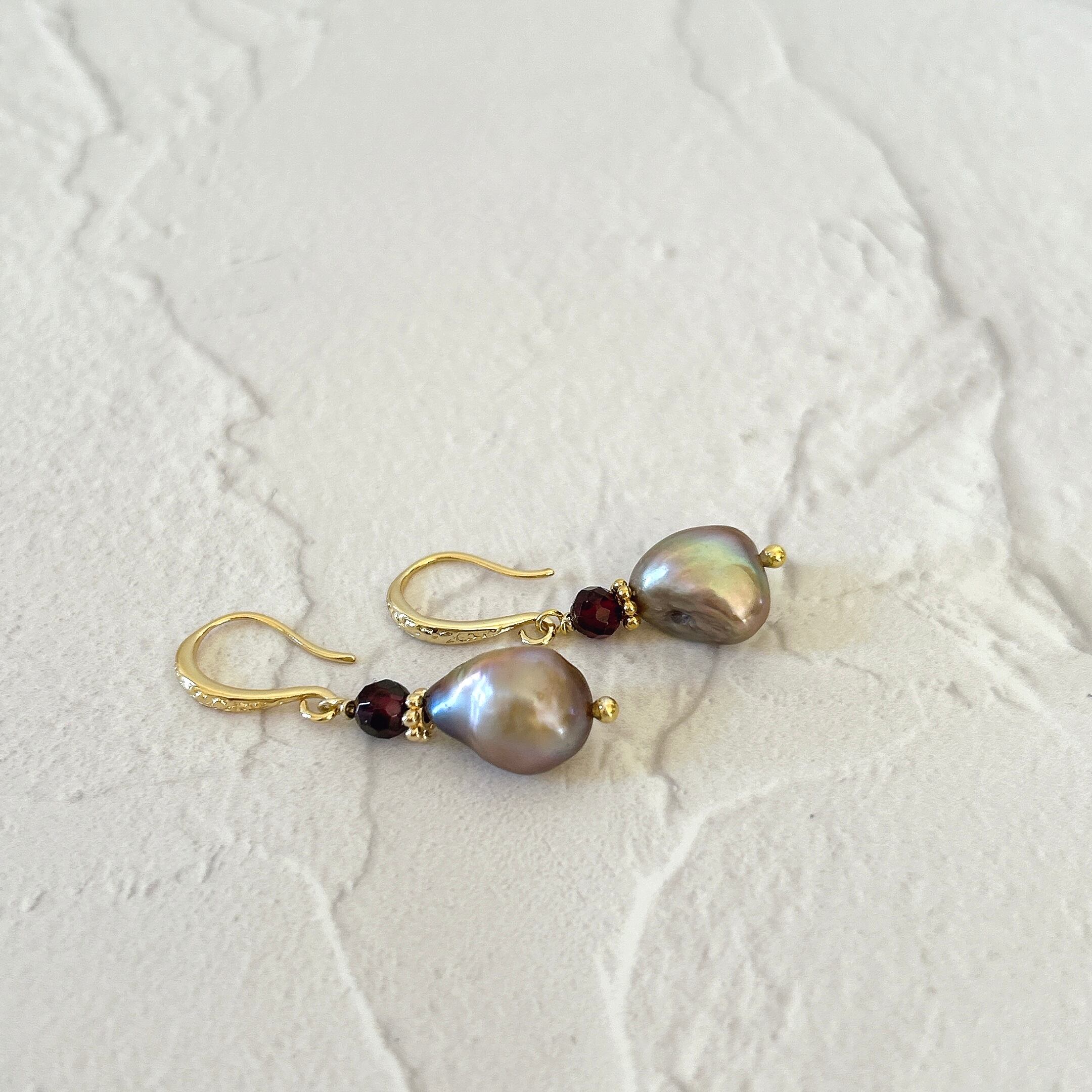 グレーバロックパールと小粒ガーネットのピアス P-146