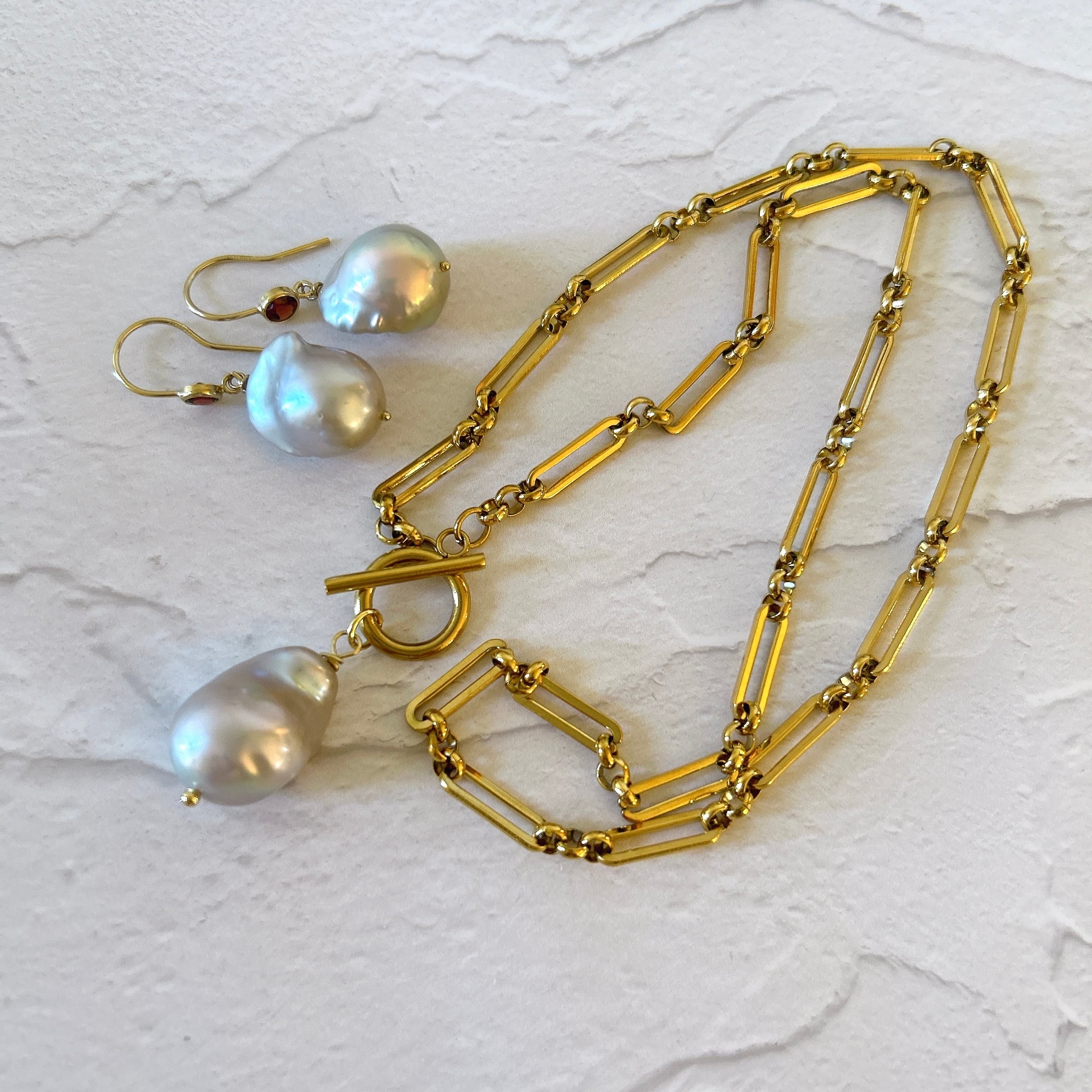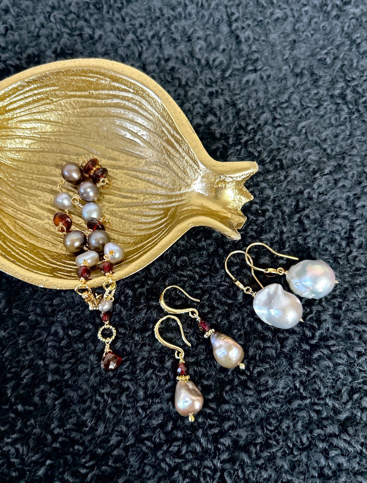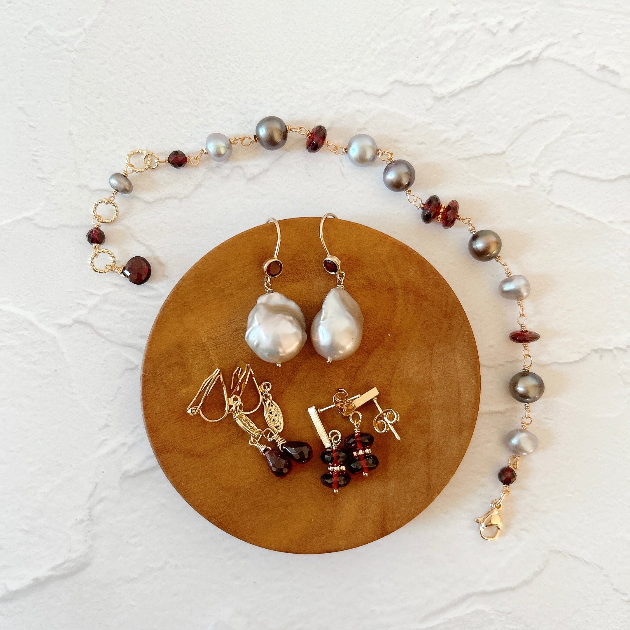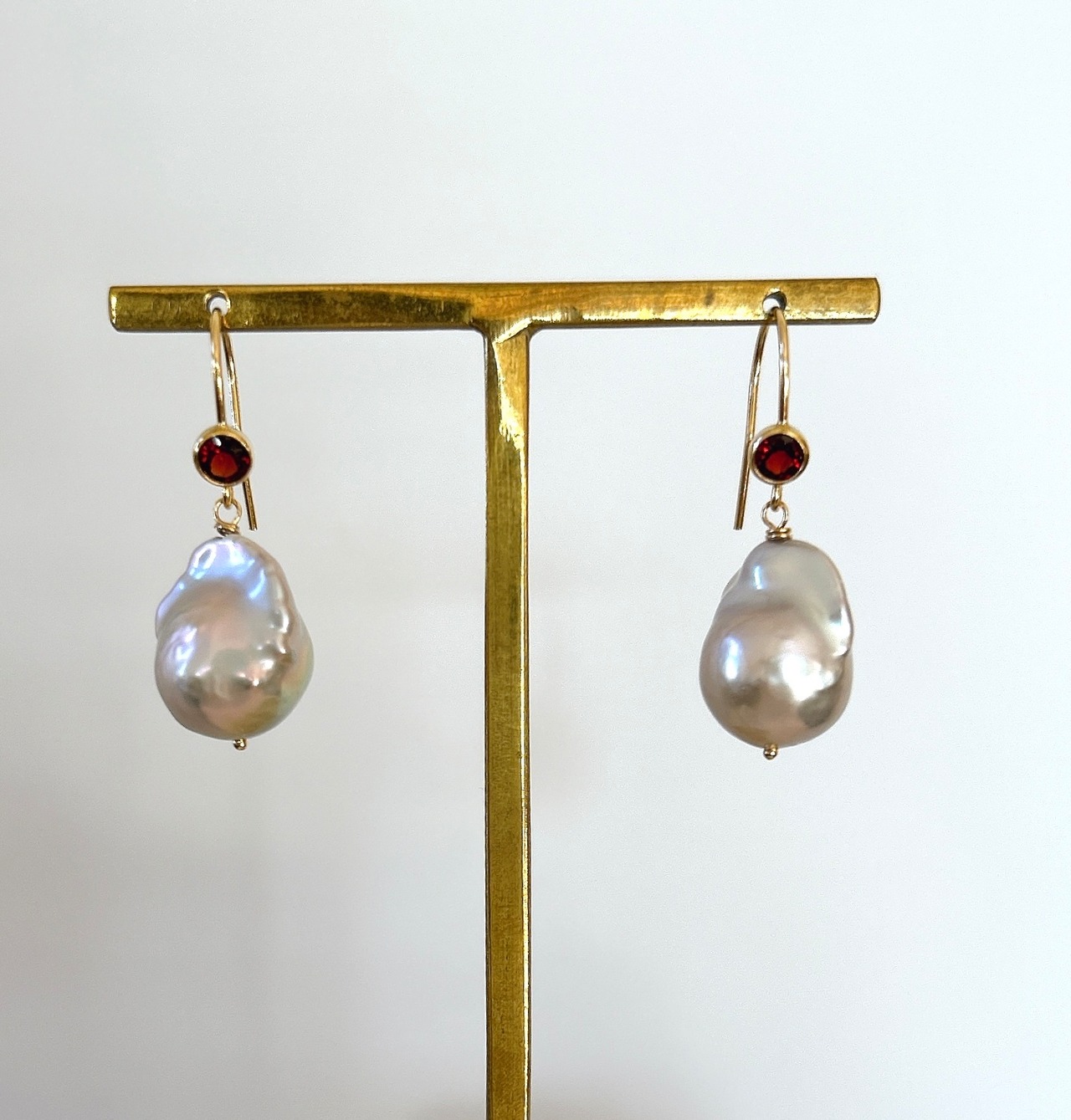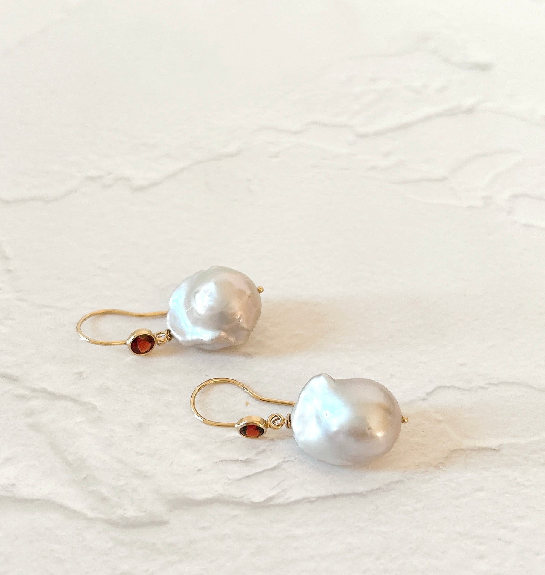オイスターバロックだけでも可愛いのに、ガーネットフックと合わせたらさらに素敵になった、とっておきのピアスです。