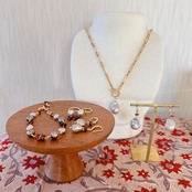 ネックレスより少し小ぶりなサイズなので、ネックレスとお揃いで合わせてもいいですし、同じ色合いのグレーパールのブレスレットとぜひ合わせてみてくださいね。