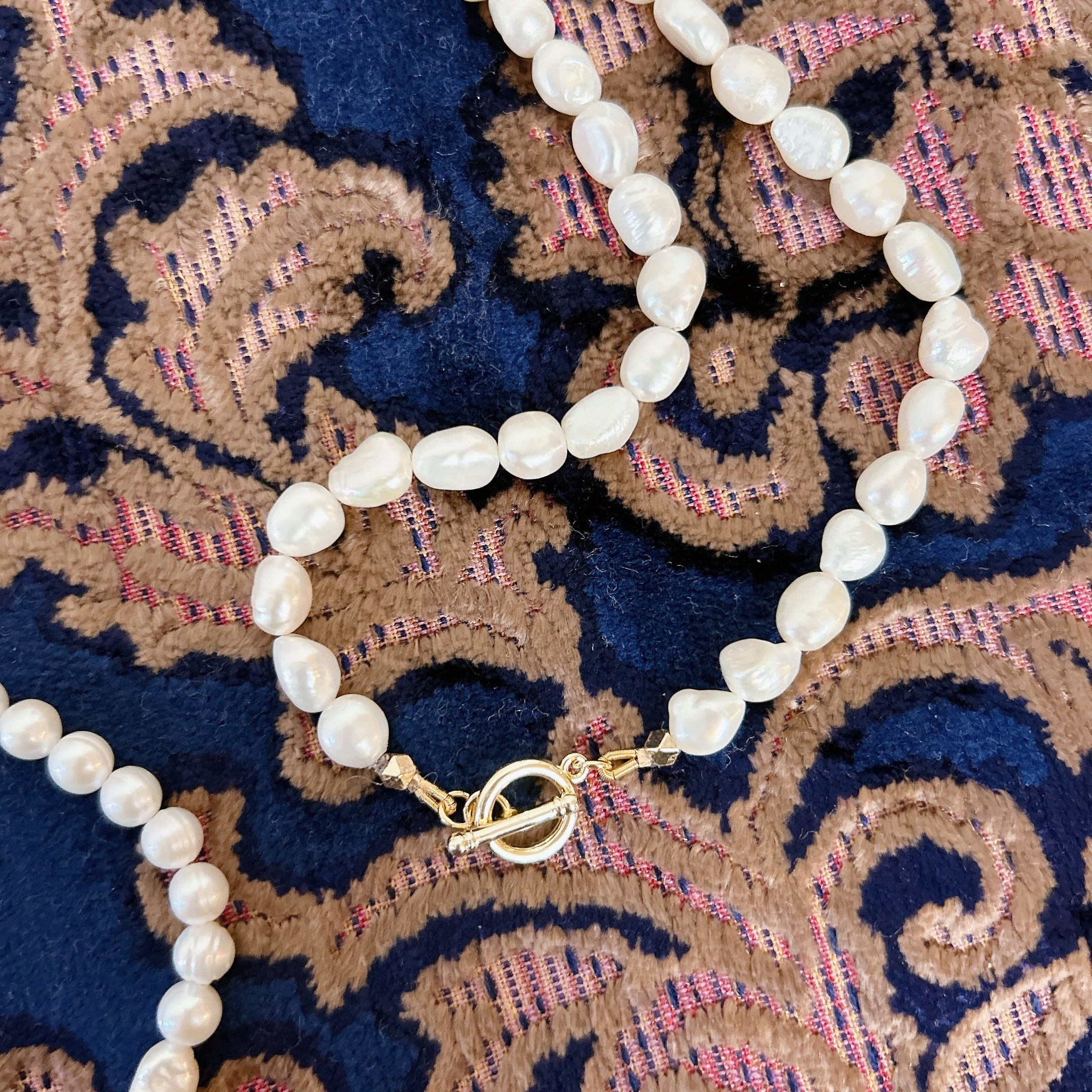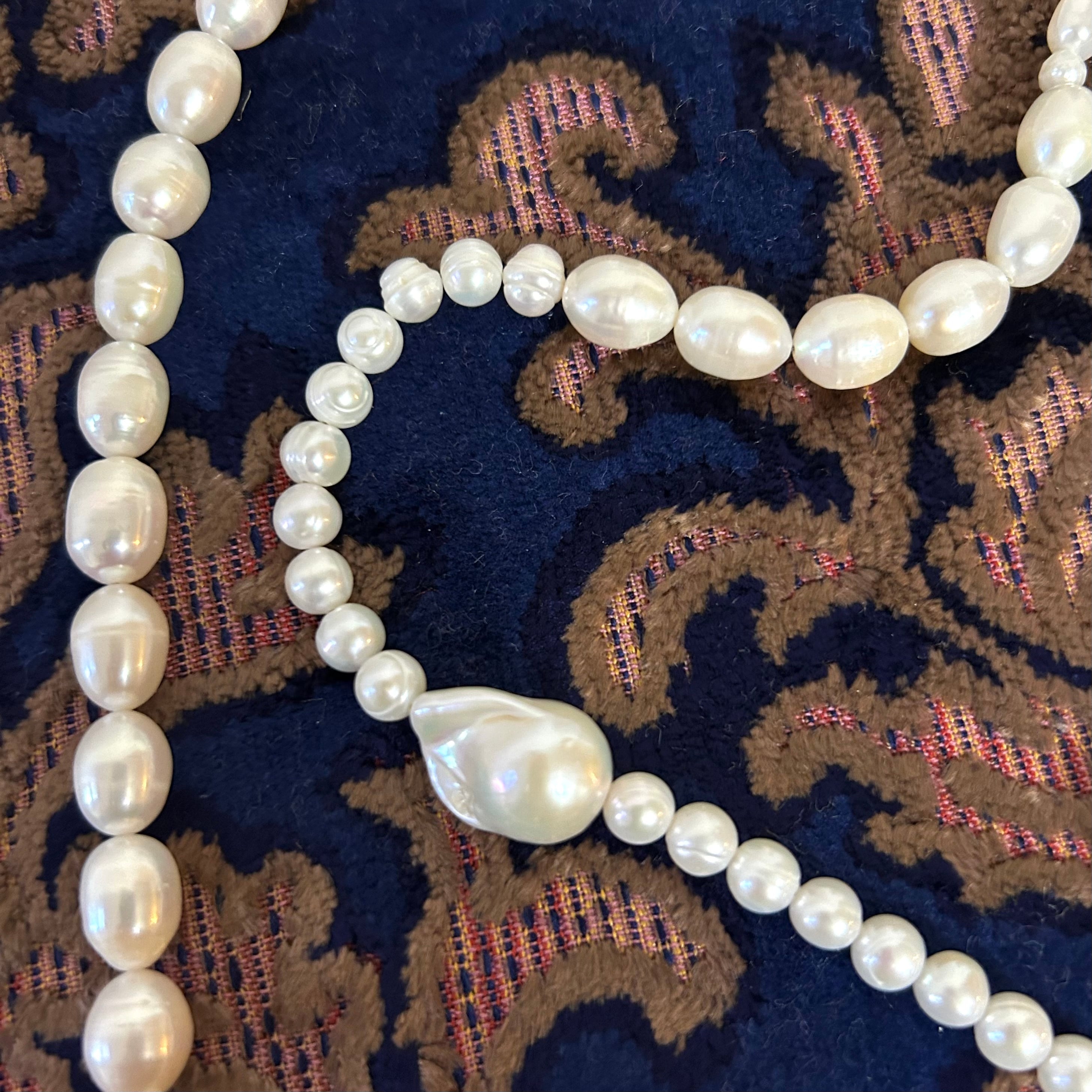 4種のバロック淡水パールをたっぷり贅沢に繋いだ、約90cmのロングネックレス。
