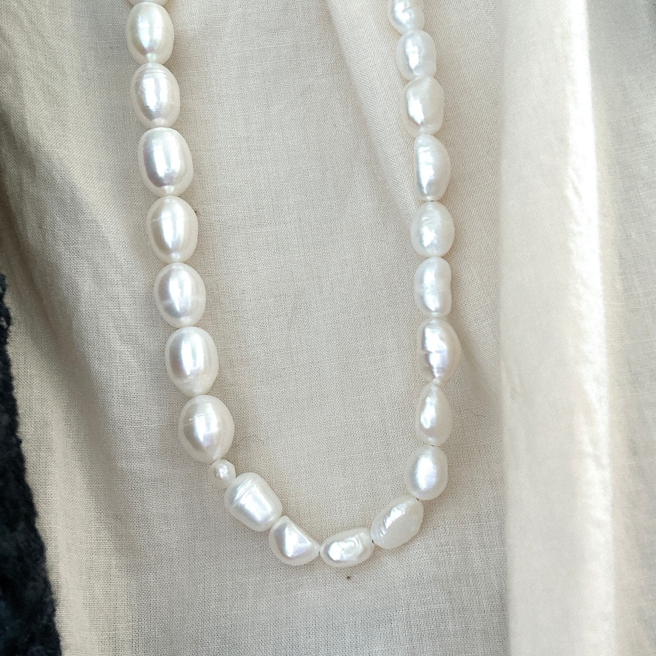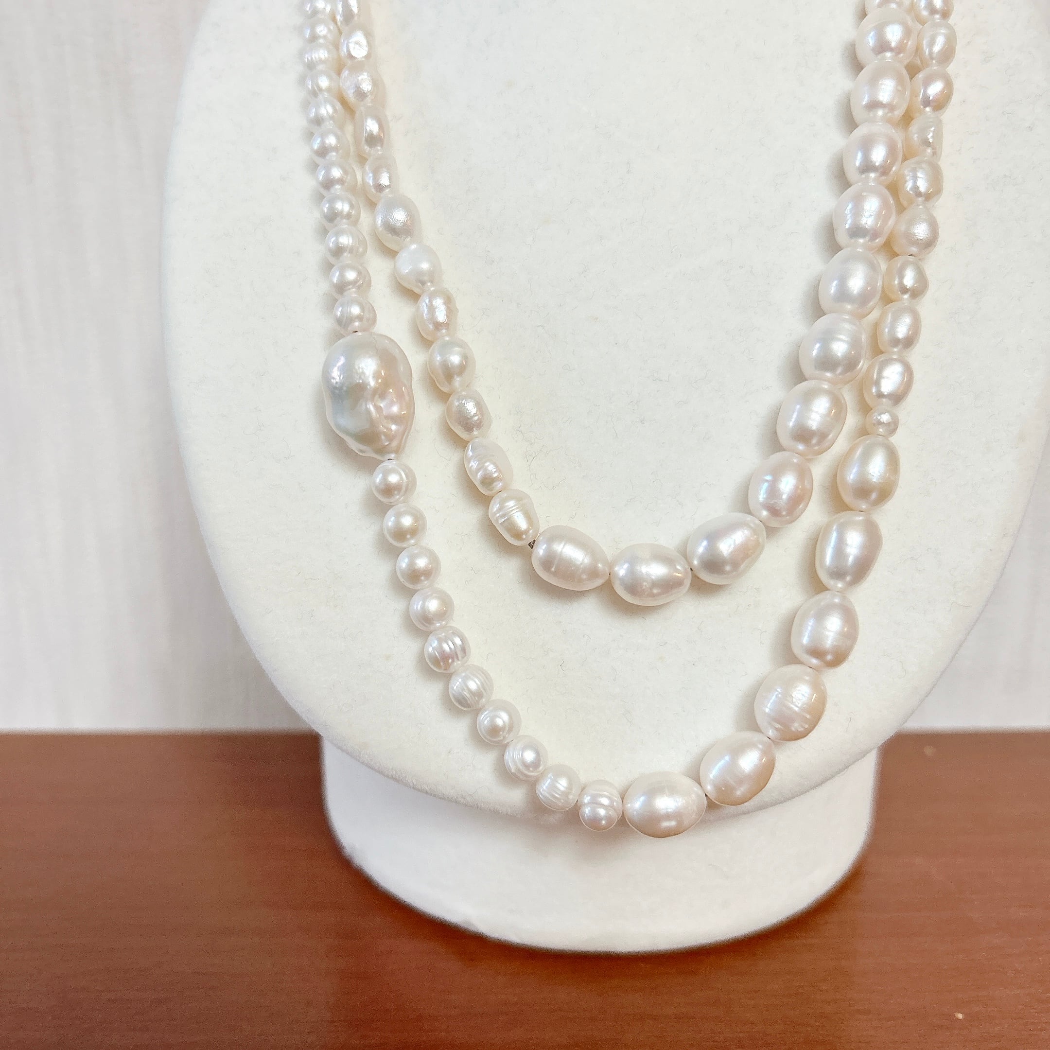 <サイズ>全長92cm(金具込み) パールサイズ:最大約18mm×13mm(オイスターバロックパール)、最小約6mm(オイスターパール隣の丸玉)