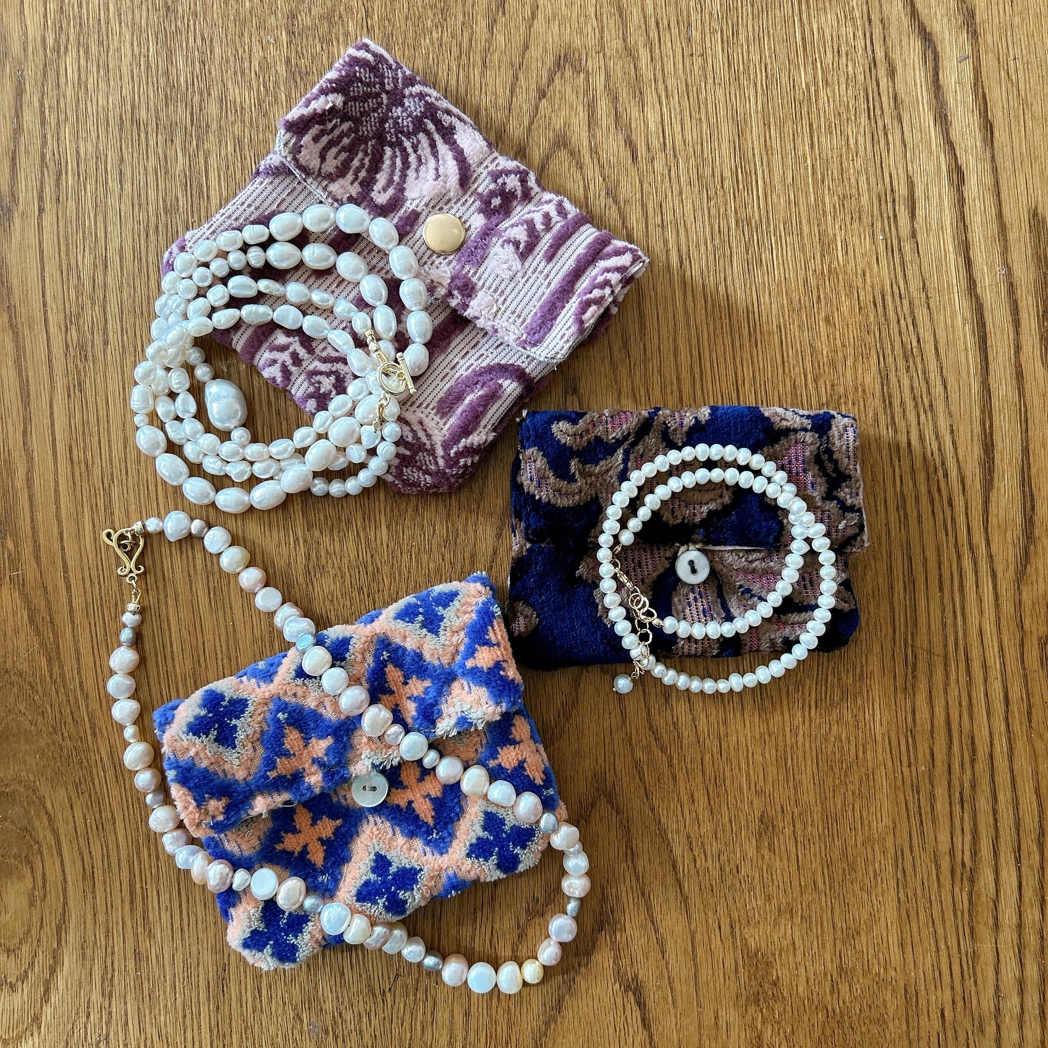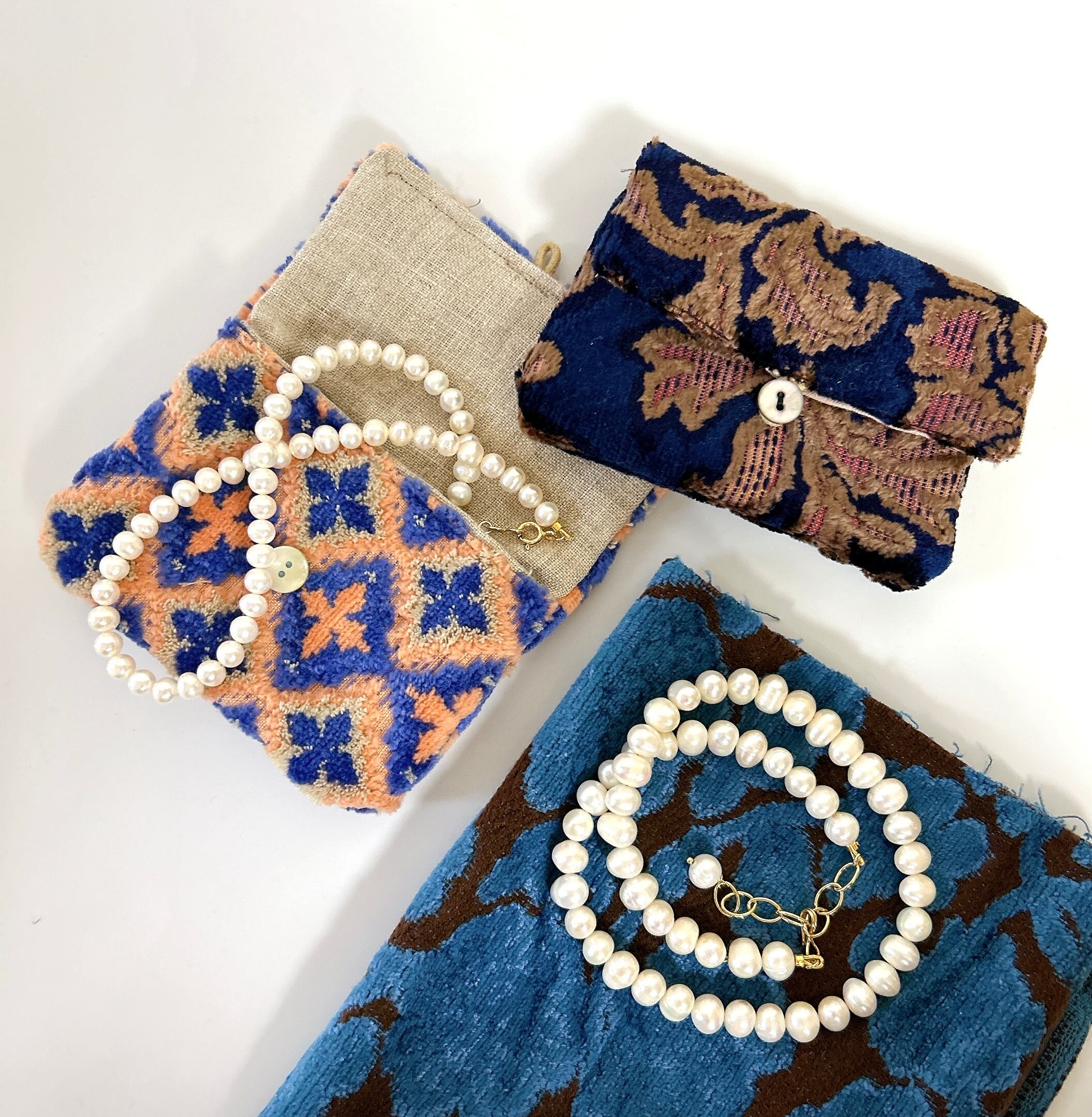 こちらのネックレスには、国産の高級ビロード生地(金華山織)でお作りしたポーチをおつけします。(写真は一例です)