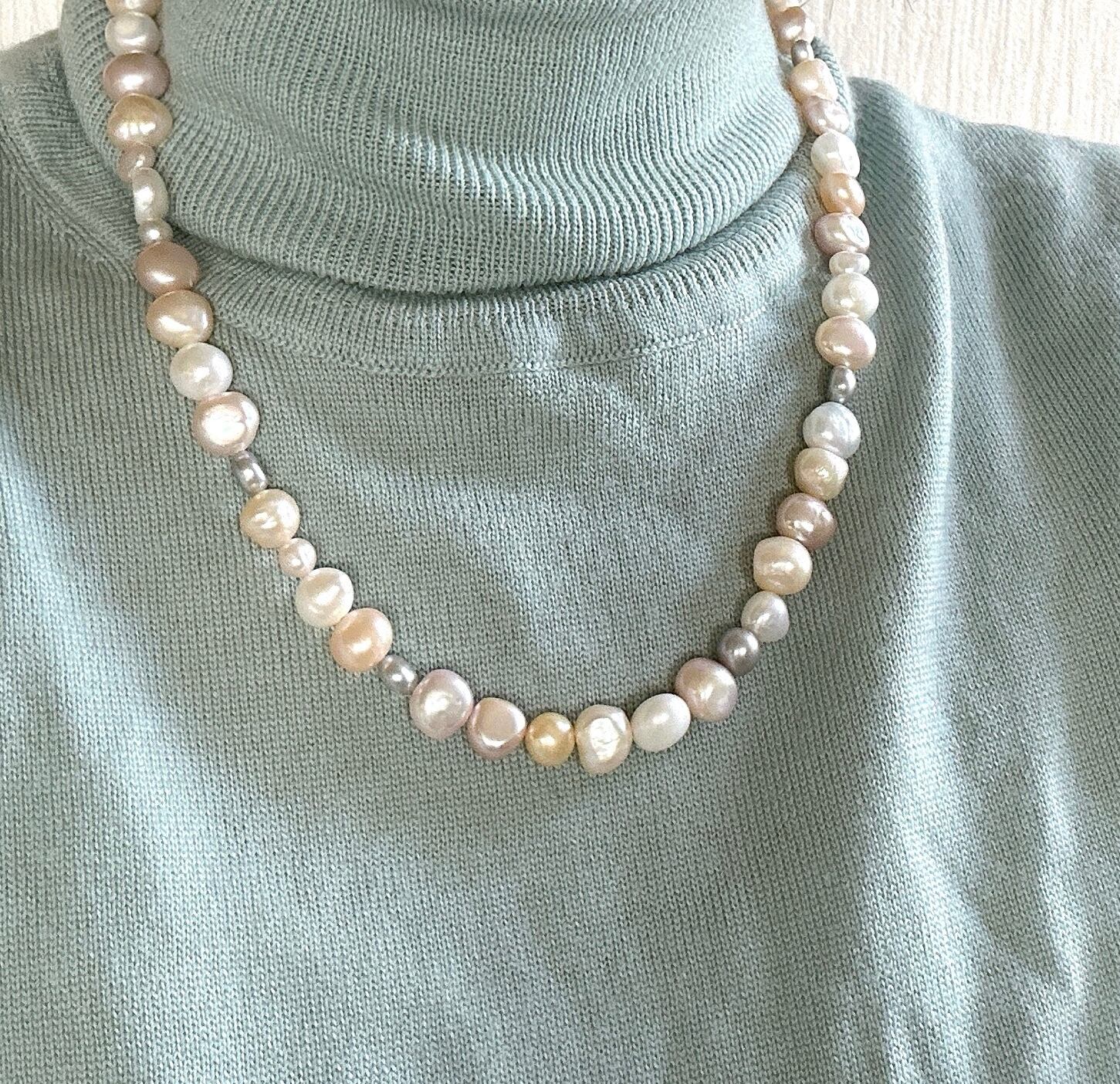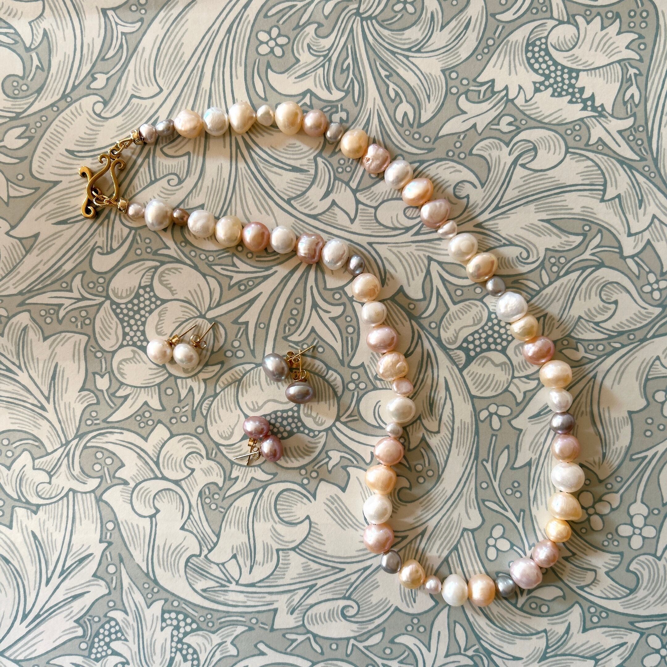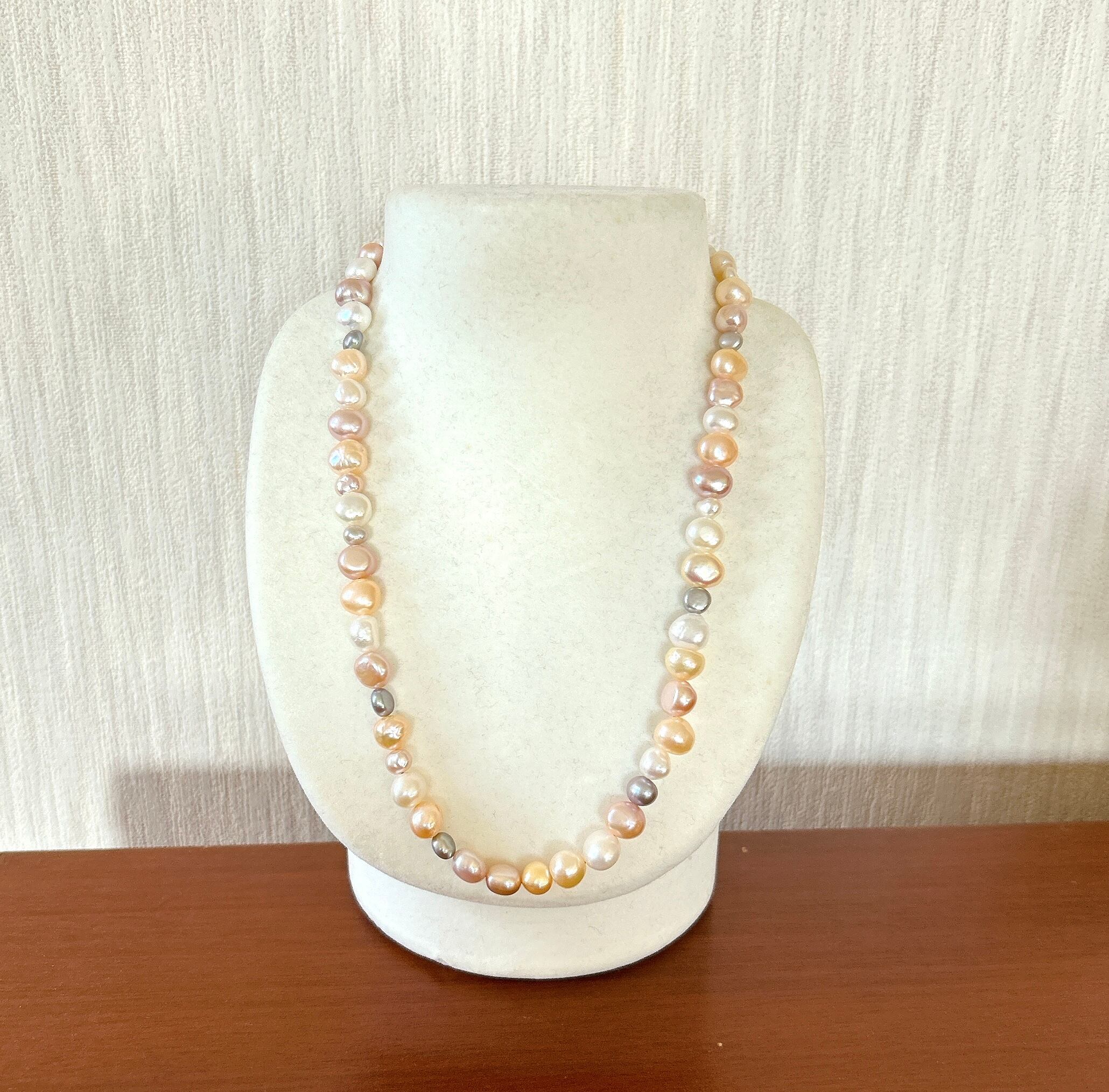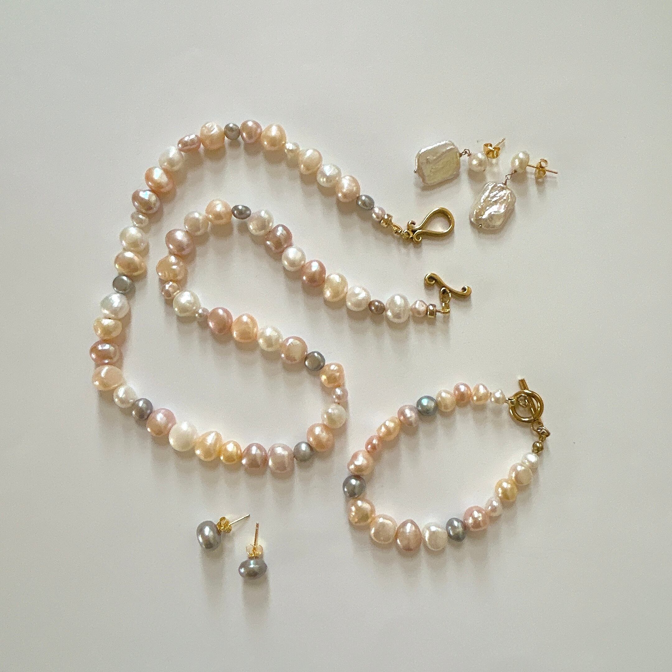以前、マルチカラーパールのブレスレットをお作りした時に大変ご好評をいただいたので、ネックレスもお作りしたところ、そちらもすぐに売り切れてしまったのですが、なかなか良いパールが入りませんでした。今回、素敵なパールを仕入れられましたのでパールフェアに合わせて再販いたします。(お揃いのブレスレットはサイズ1のみ在庫ございます)