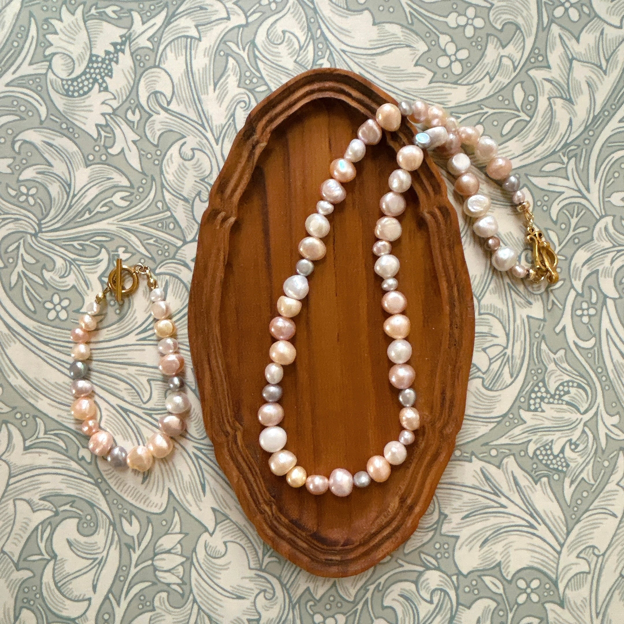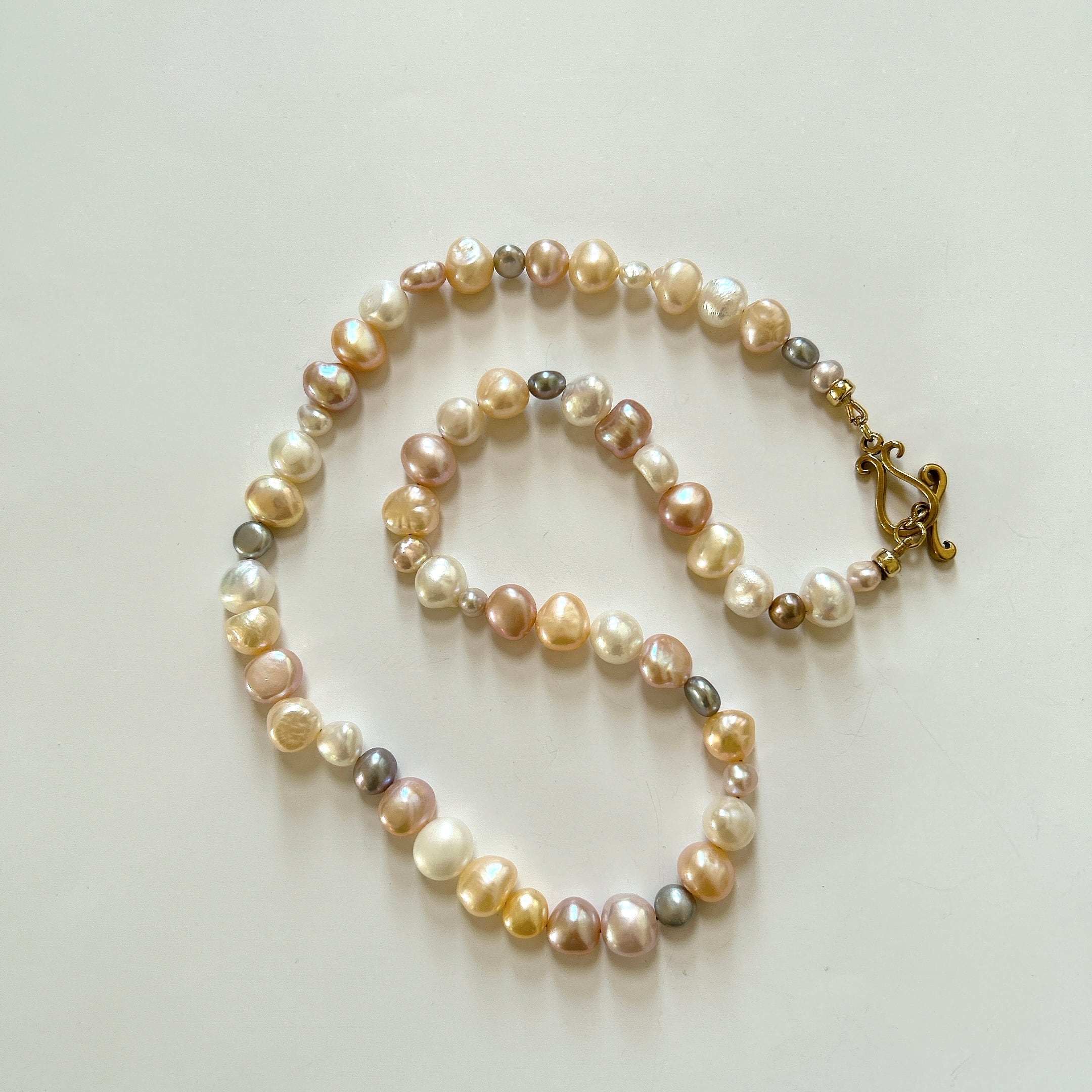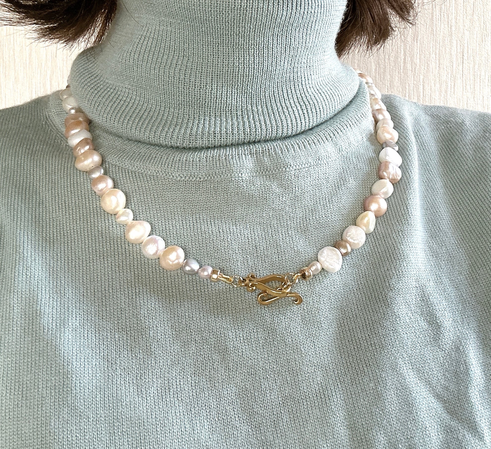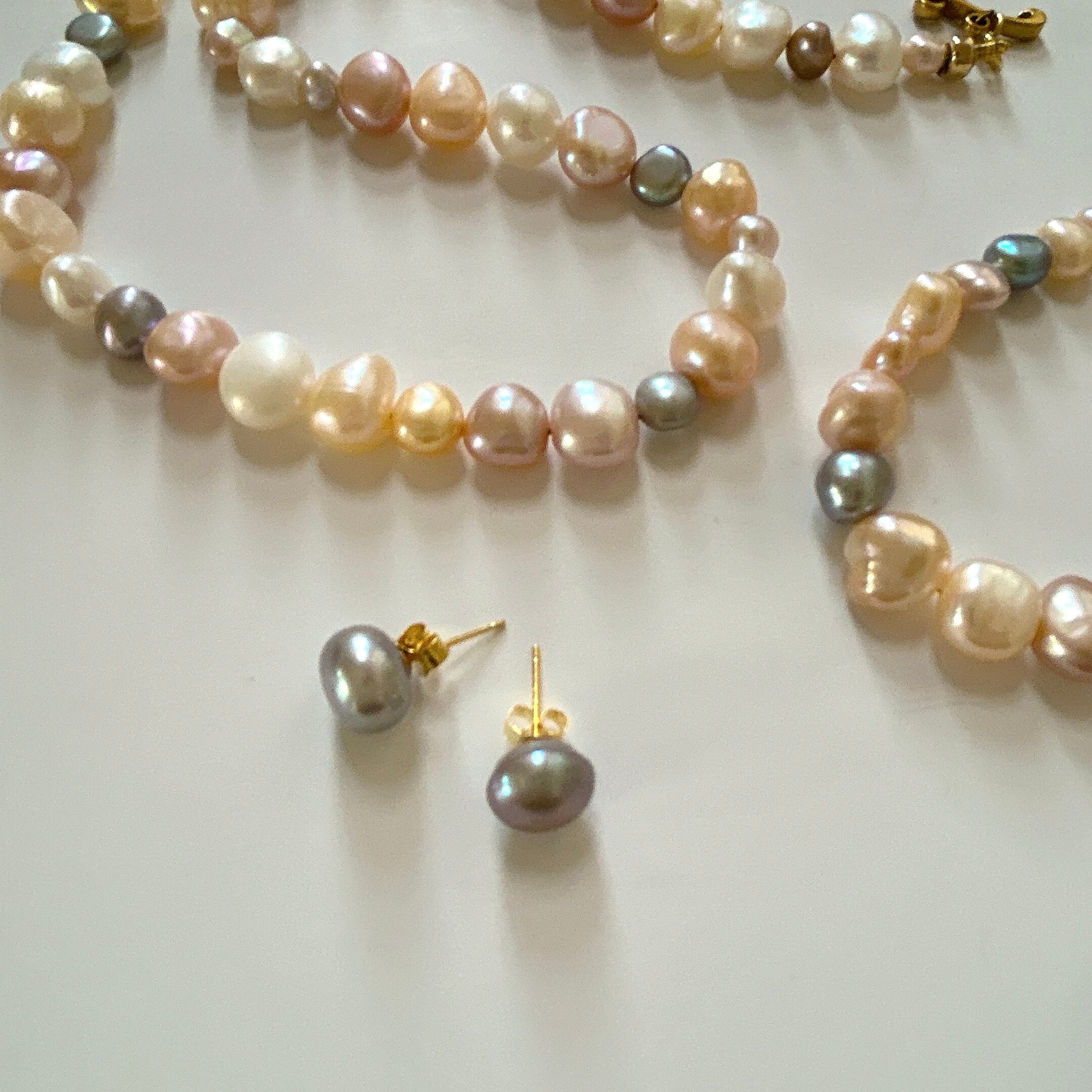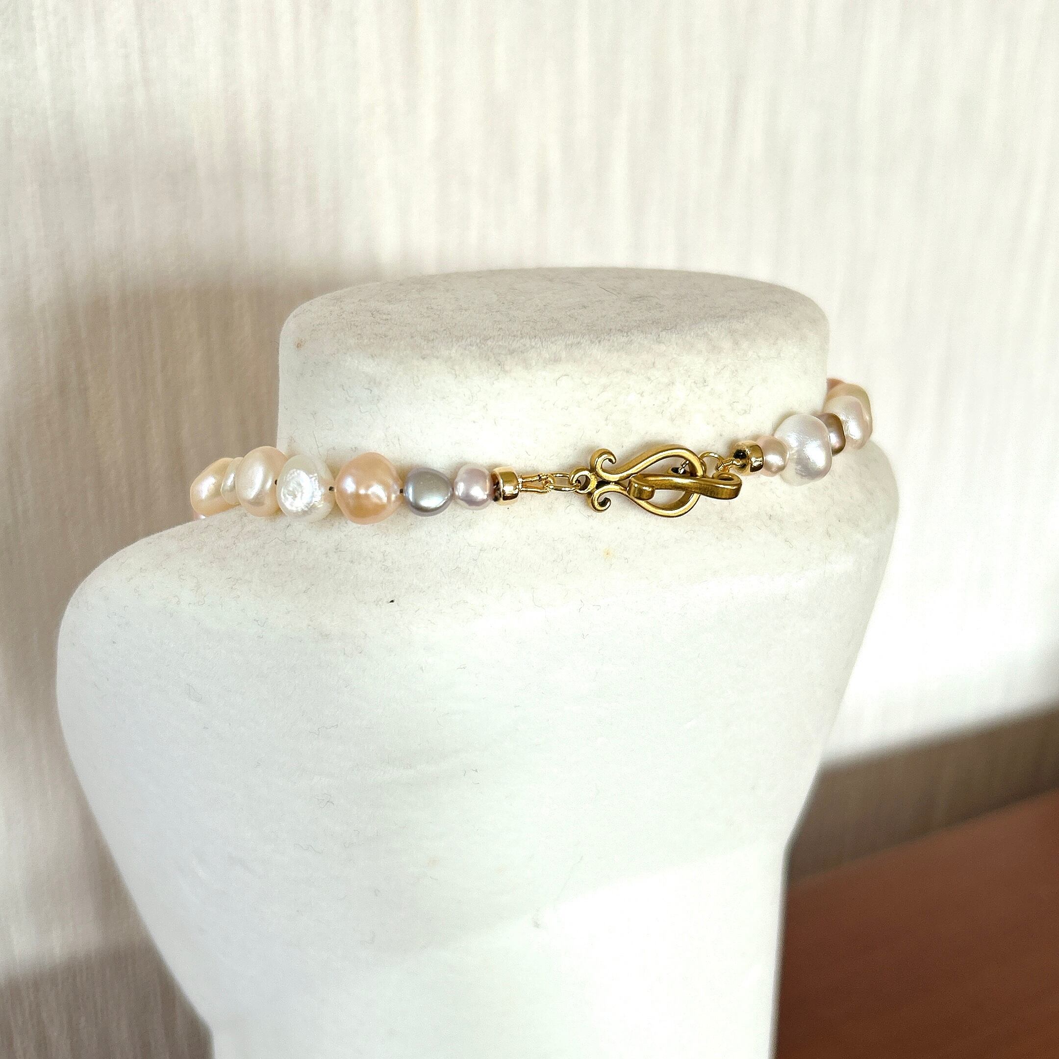 以前、マルチカラーパールのブレスレットをお作りした時に大変ご好評をいただいたので、ネックレスもお作りしたところ、そちらもすぐに売り切れてしまったのですが、なかなか良いパールが入りませんでした。今回、素敵なパールを仕入れられましたのでパールフェアに合わせて再販いたします。(お揃いのブレスレットはサイズ1のみ在庫ございます)