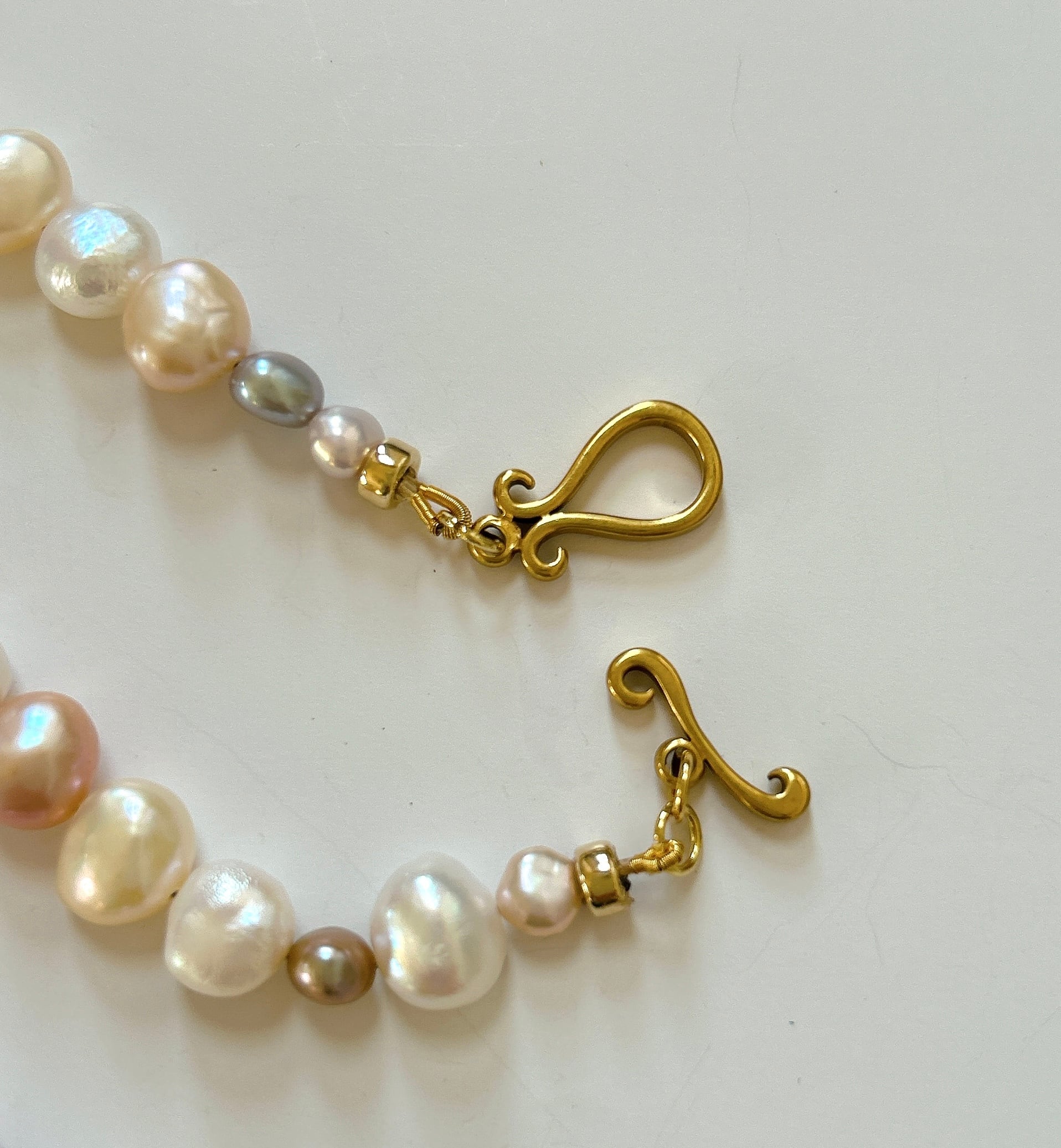 ホワイト、ライトピンク、ライトグレーに染められた、大小さまざまな大きさのバロック淡水パールをランダムに繋いだネックレス。