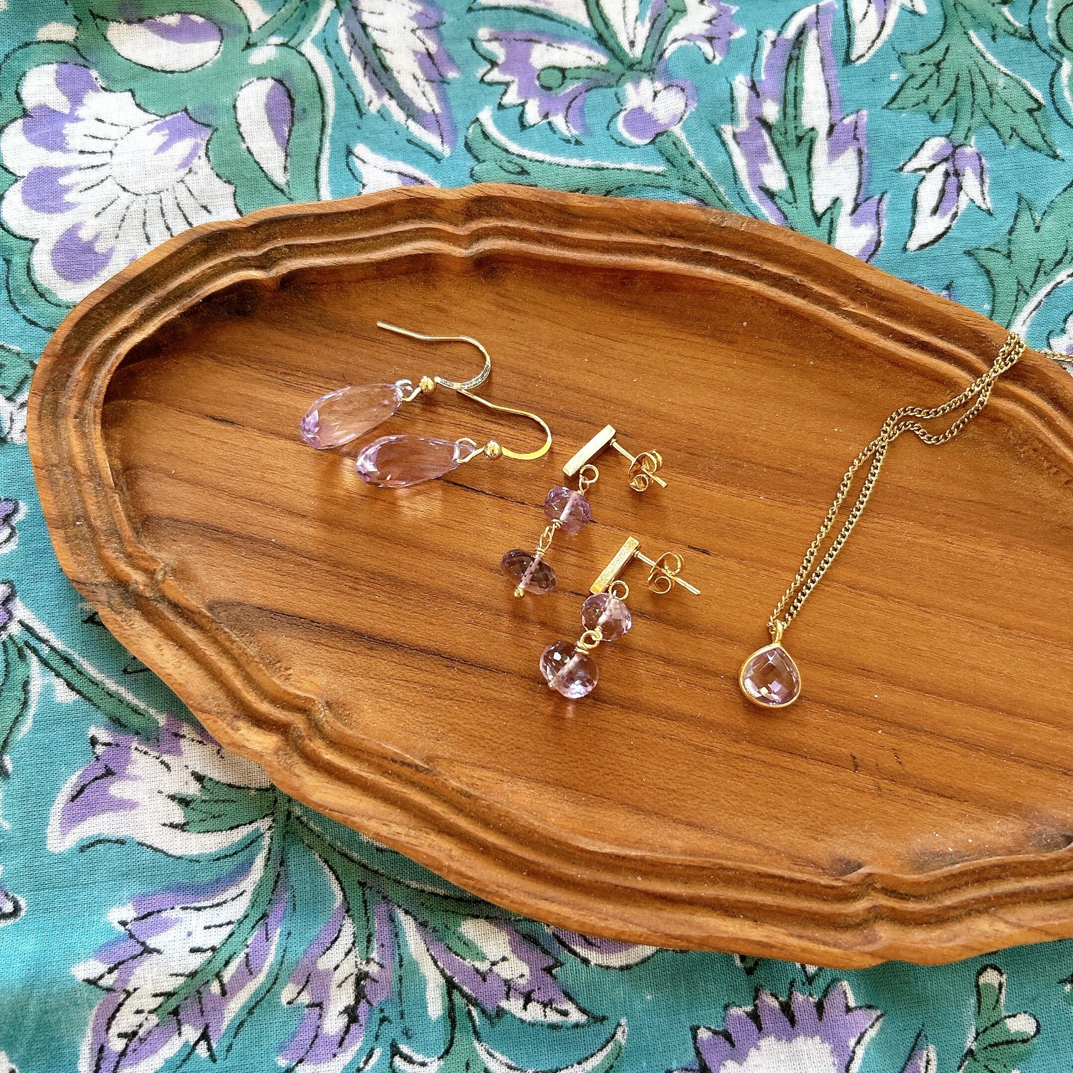 透明感たっぷり、春にぴったりのお色ですので、ぜひこのタイミングでお迎えいただけると嬉しいです!同じお色のアメジストを使ったショートネックレスもございますので、お揃いでお楽しみいただけます。