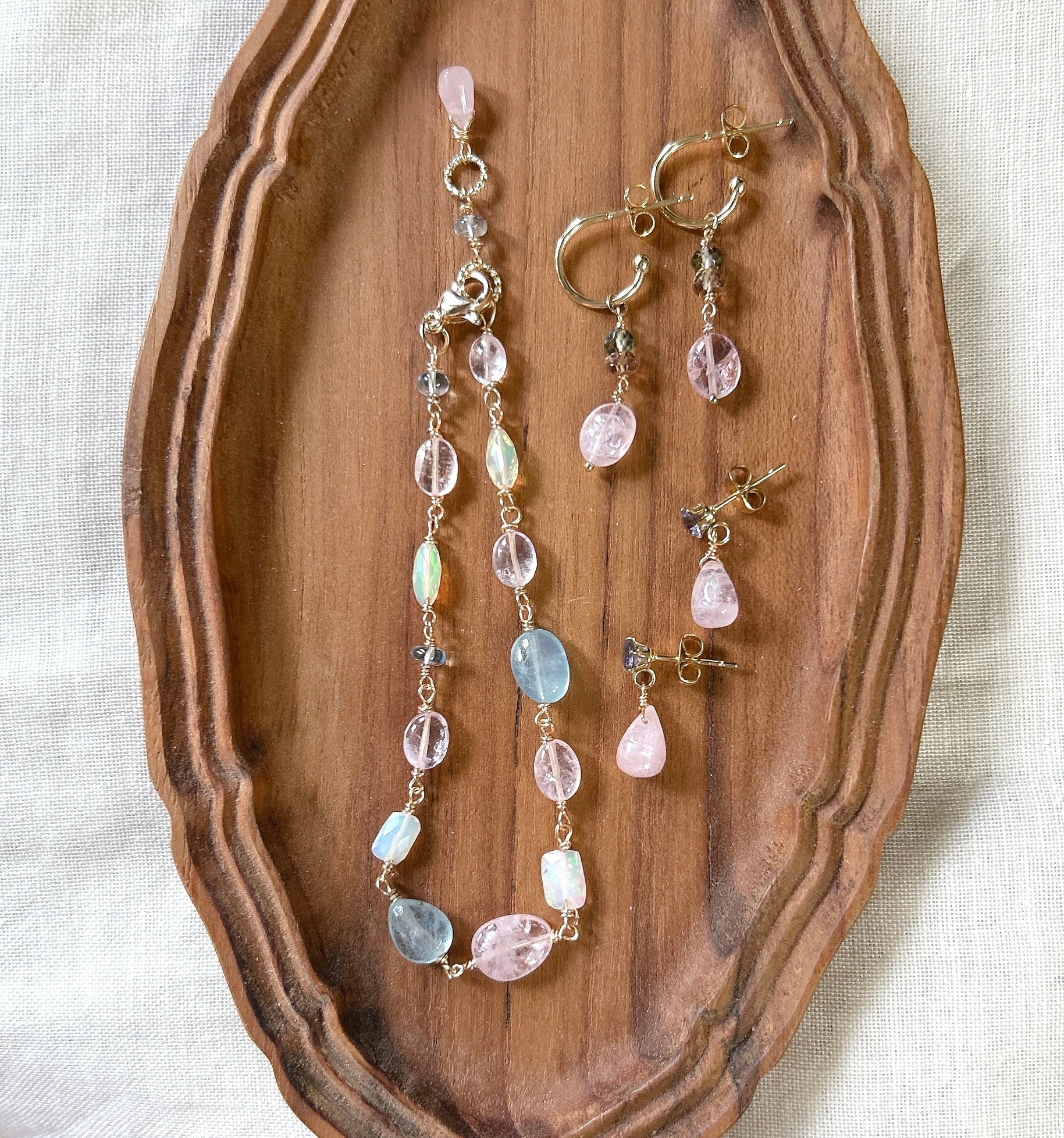 <素材>モルガナイト、アイオライト、サージカルステンレス(ピアス金具)、K14GF(ワイヤー)