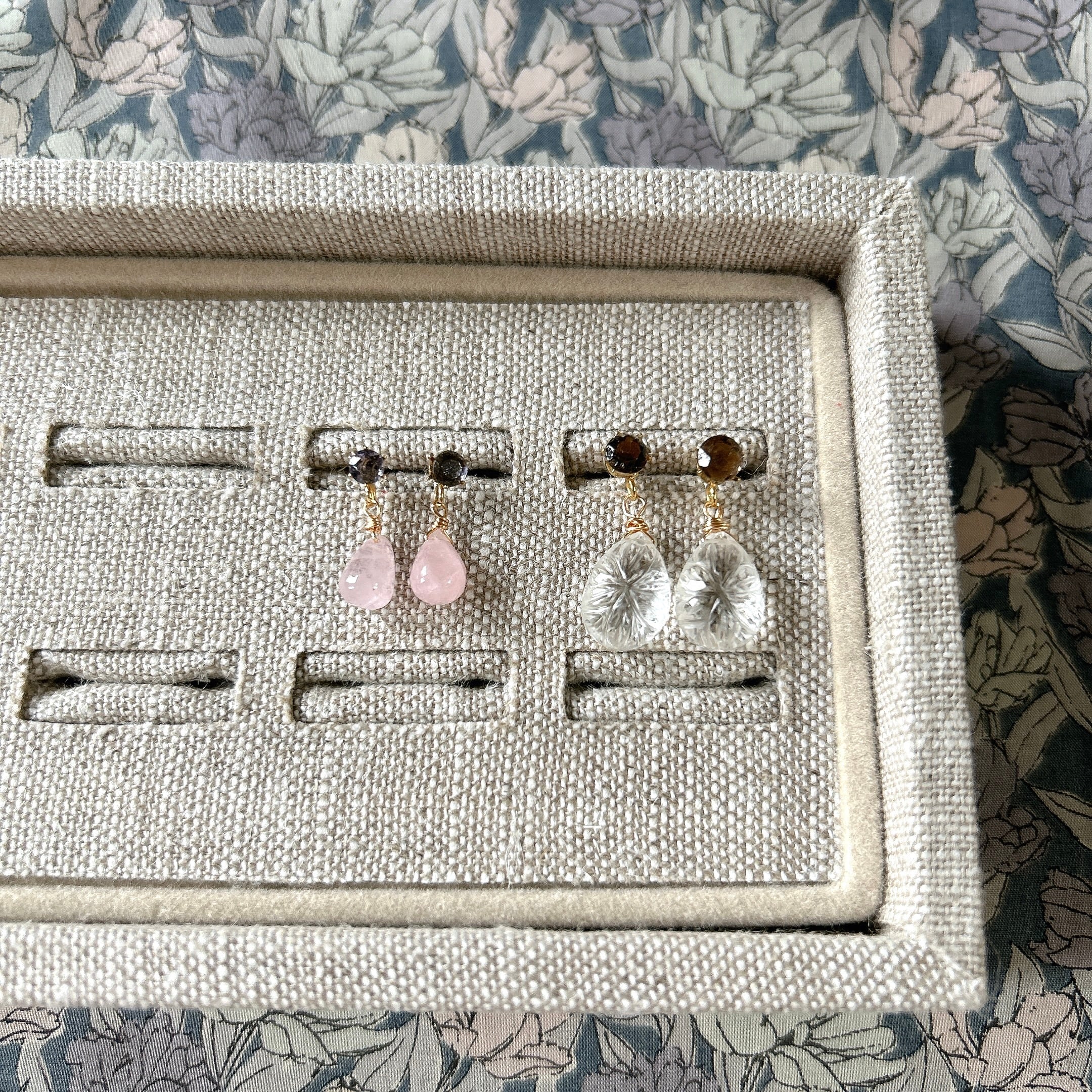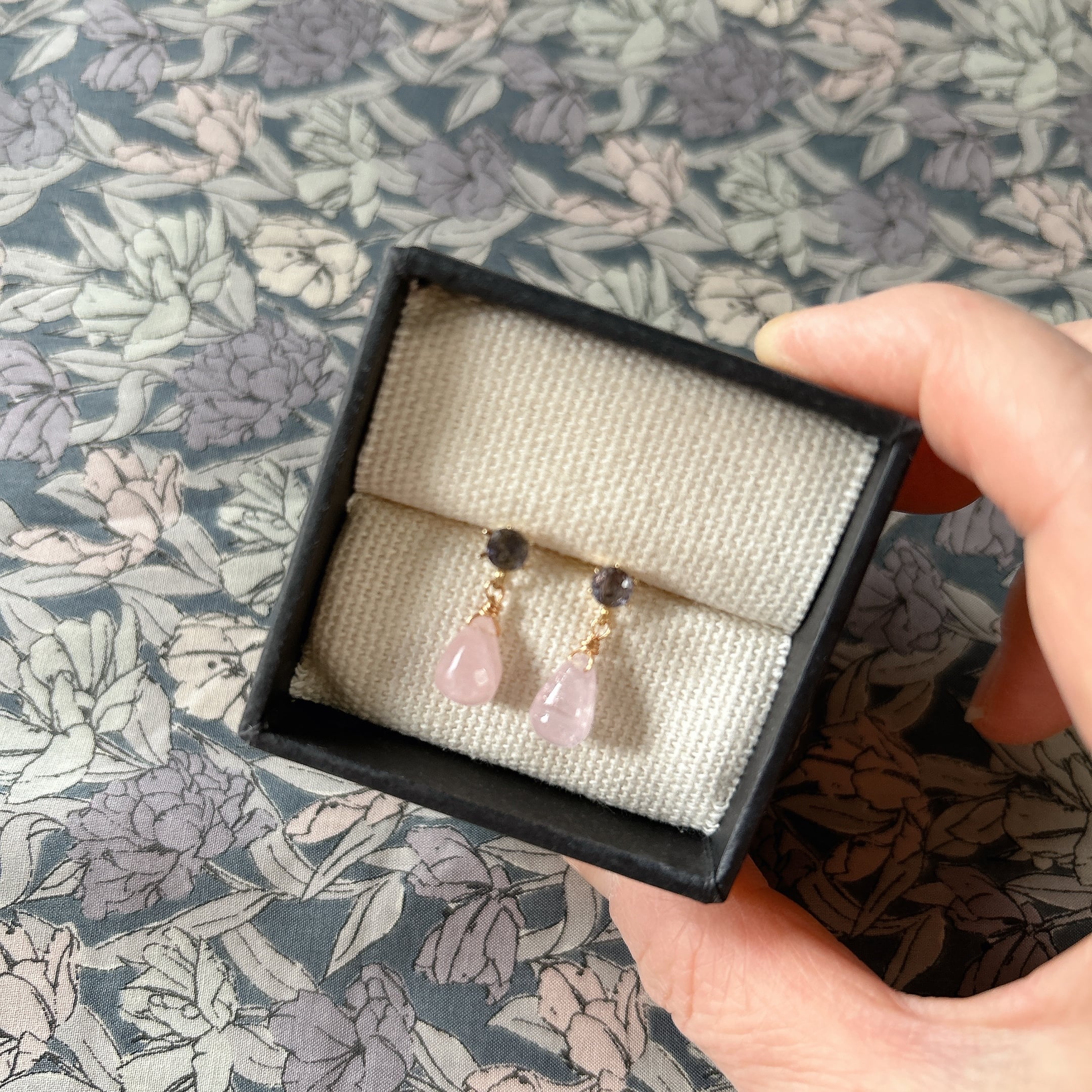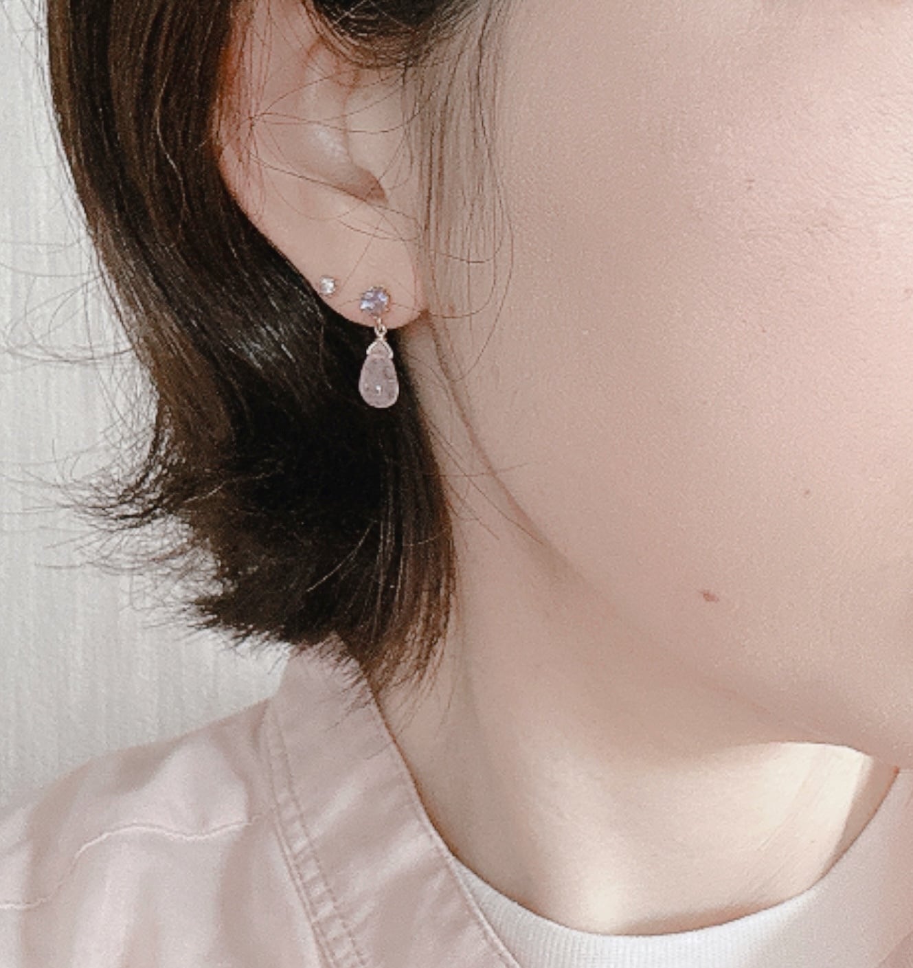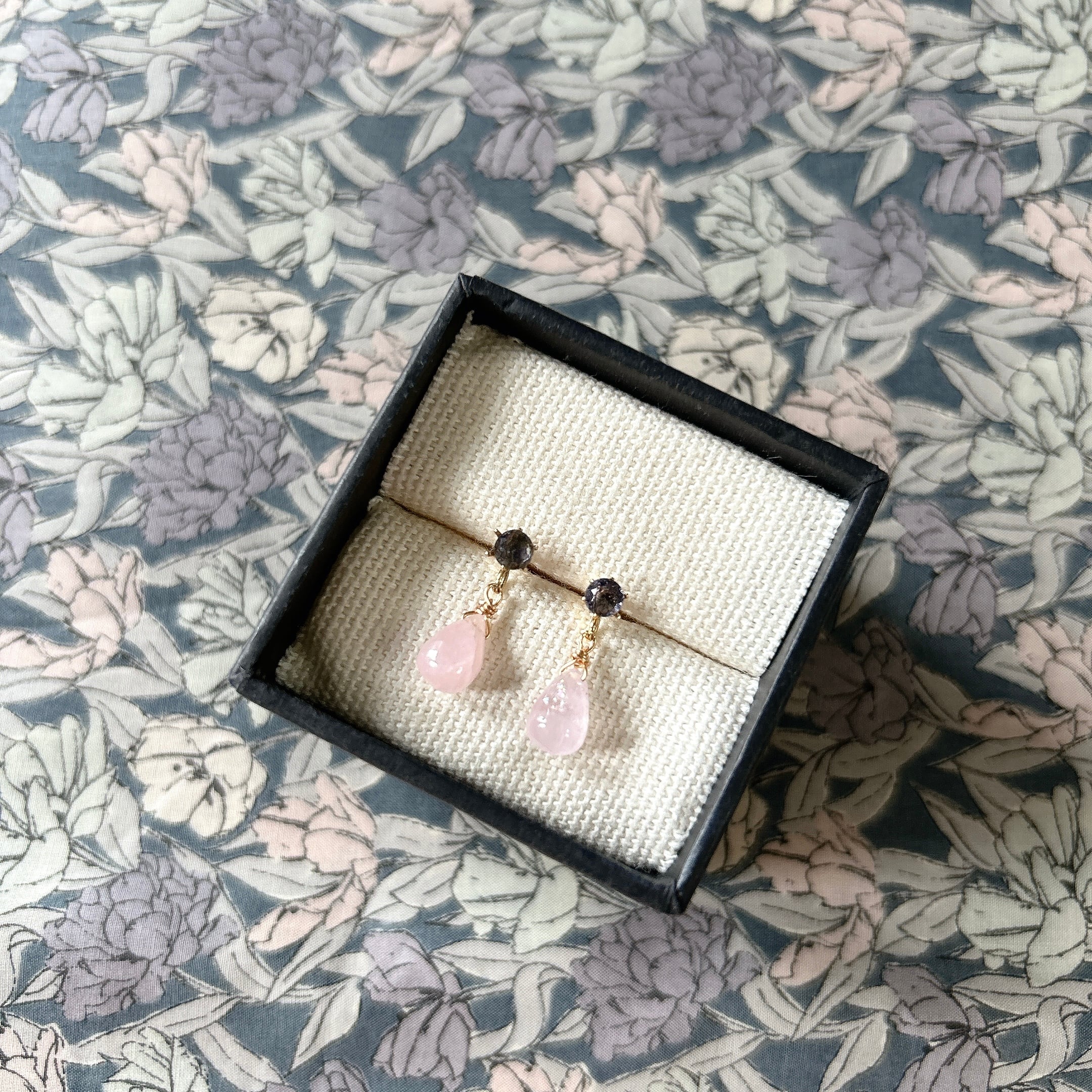 こちらは、ブルーグレーが美しいアイオライトにつるんとしたモルガナイトのドロップをぶら下げた、小ぶりで可愛らしいピアスです。