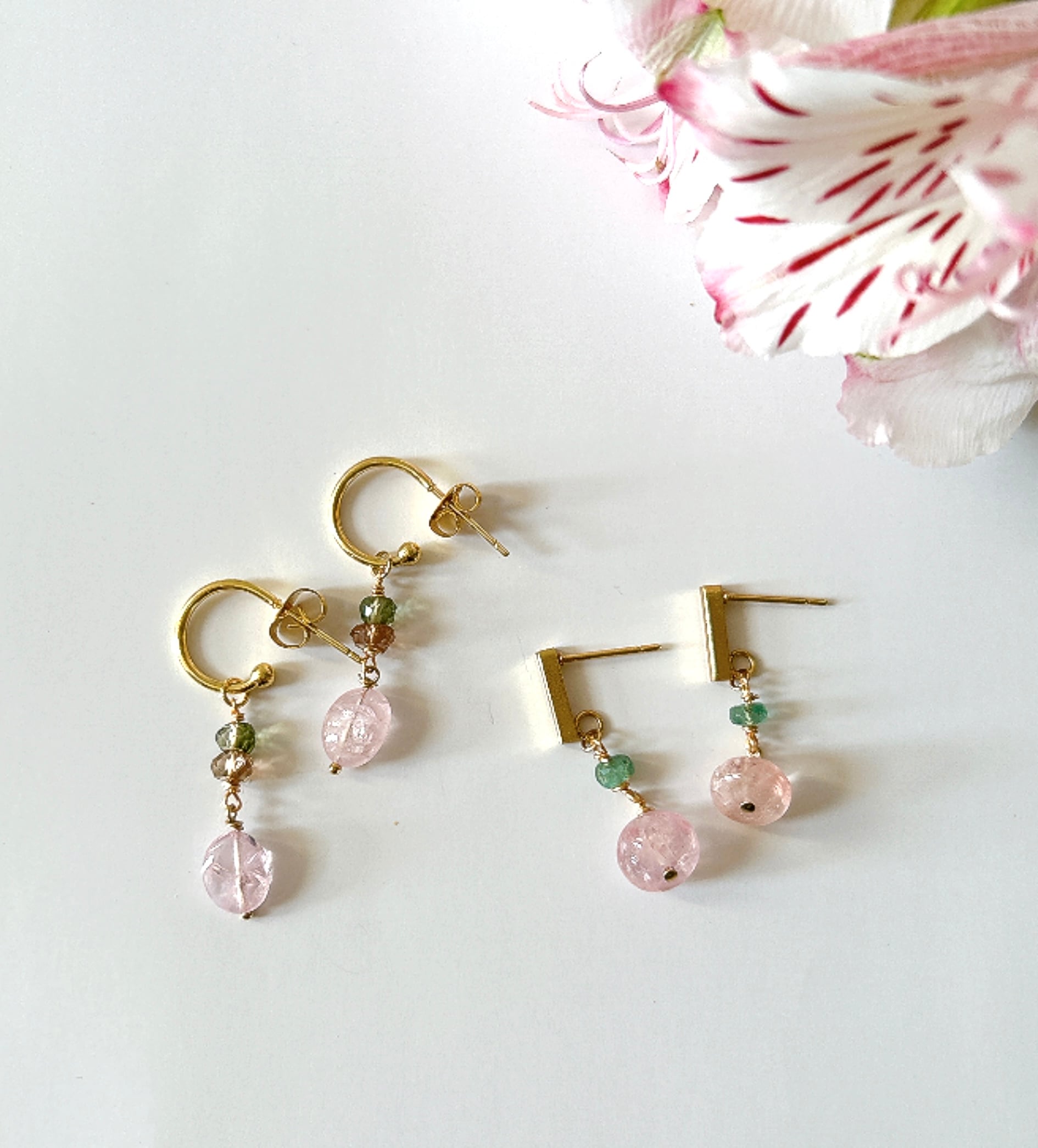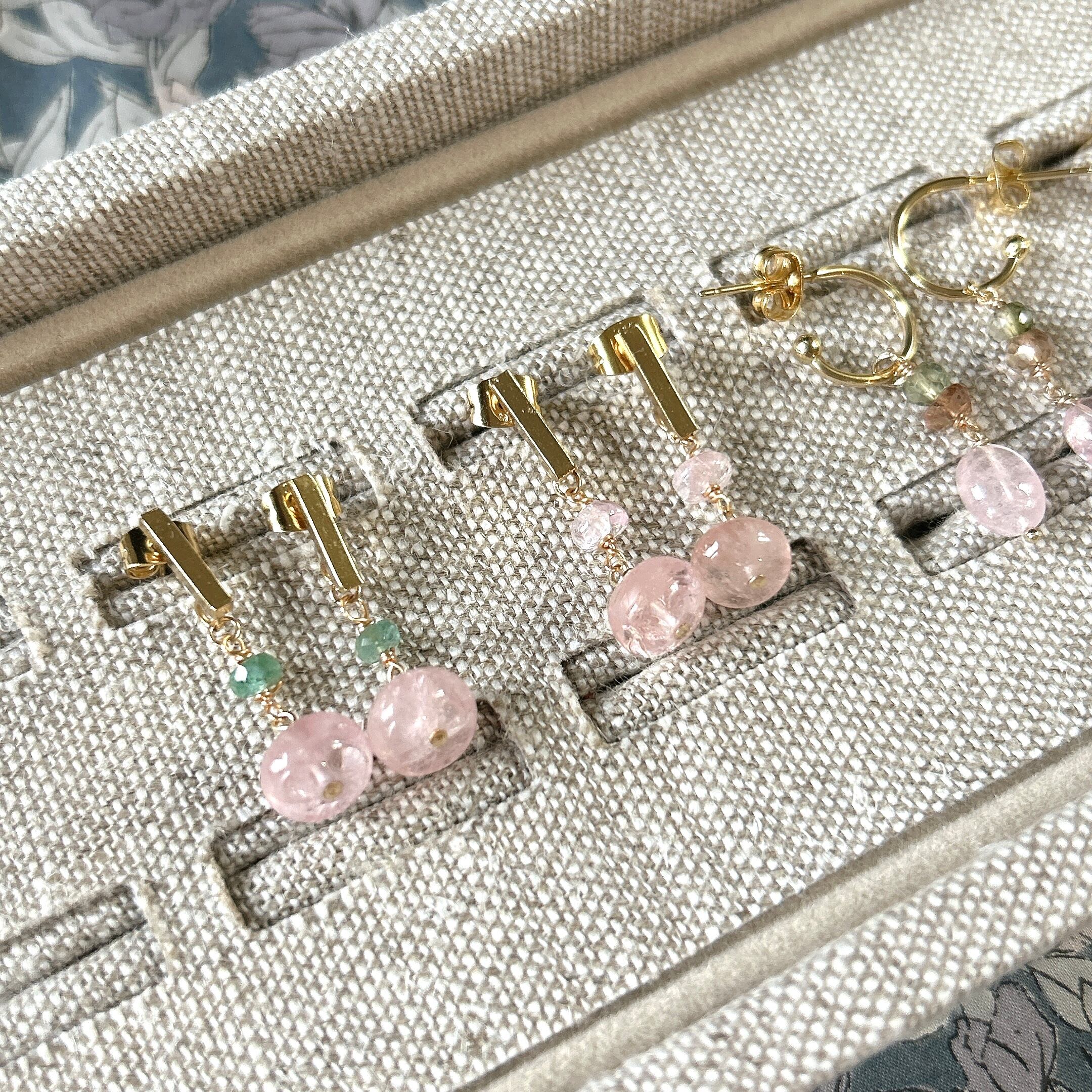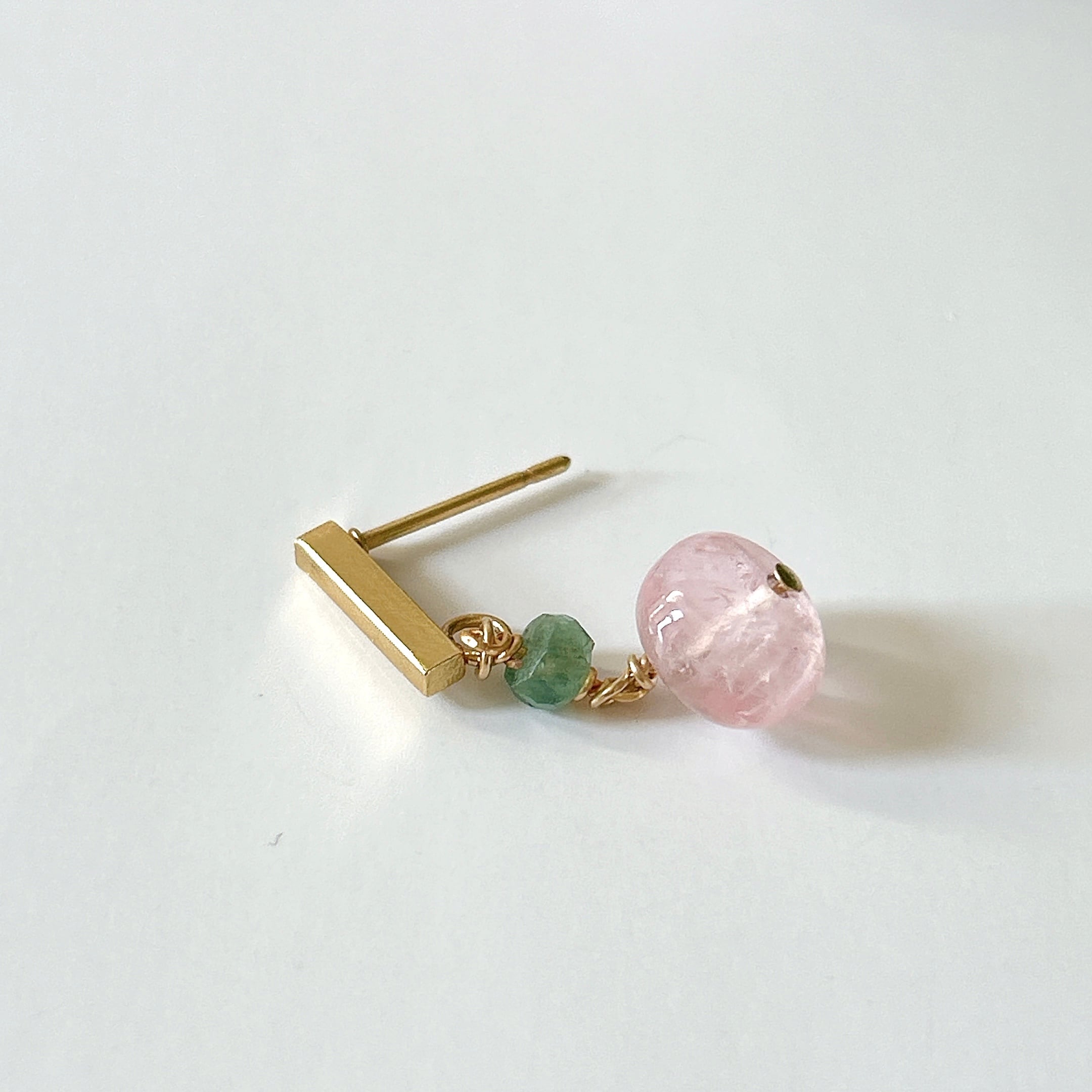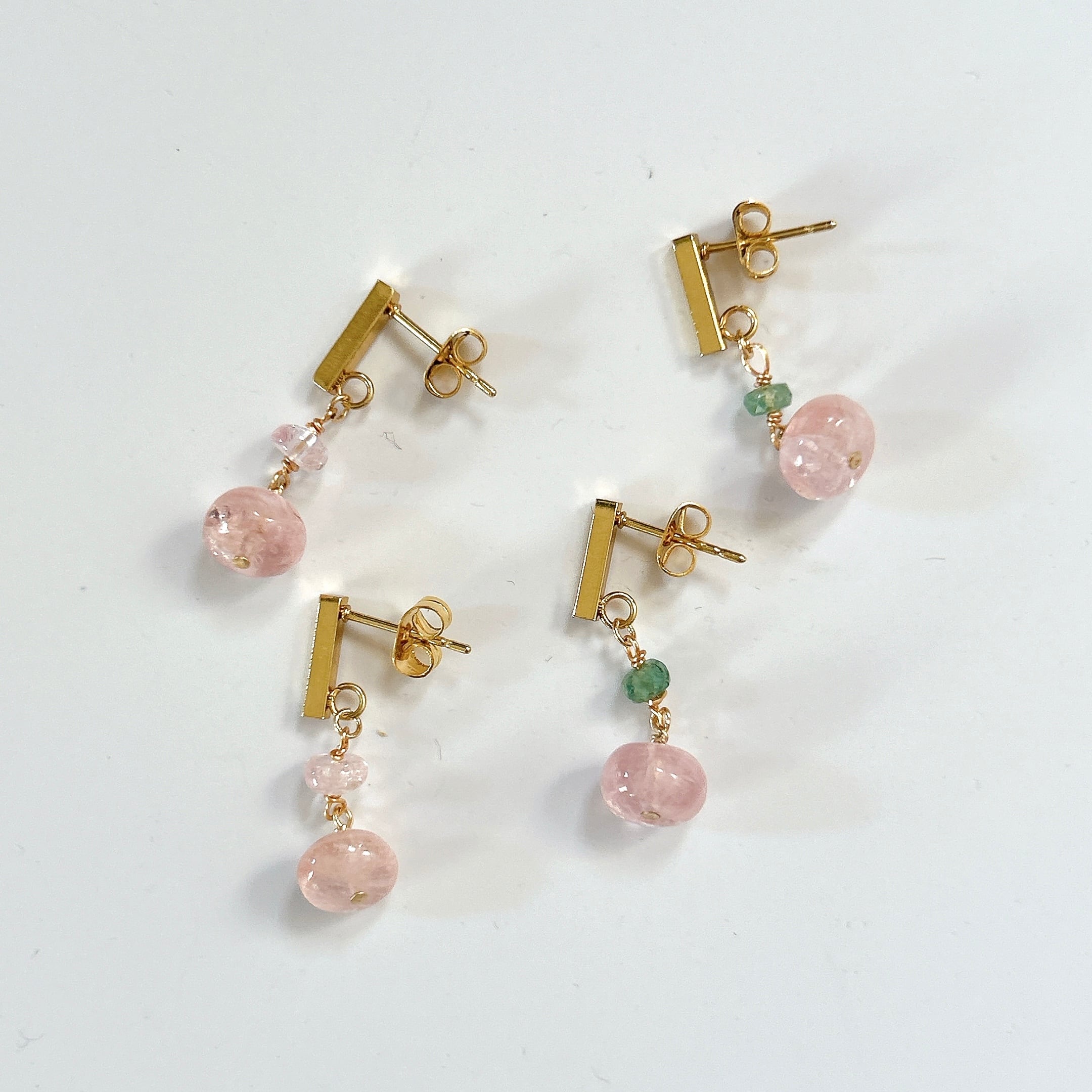 <素材>天然石(モルガナイト、エメラルド)、サージカルステンレス(ピアス金具)、K14GF(ワイヤー、ピン)