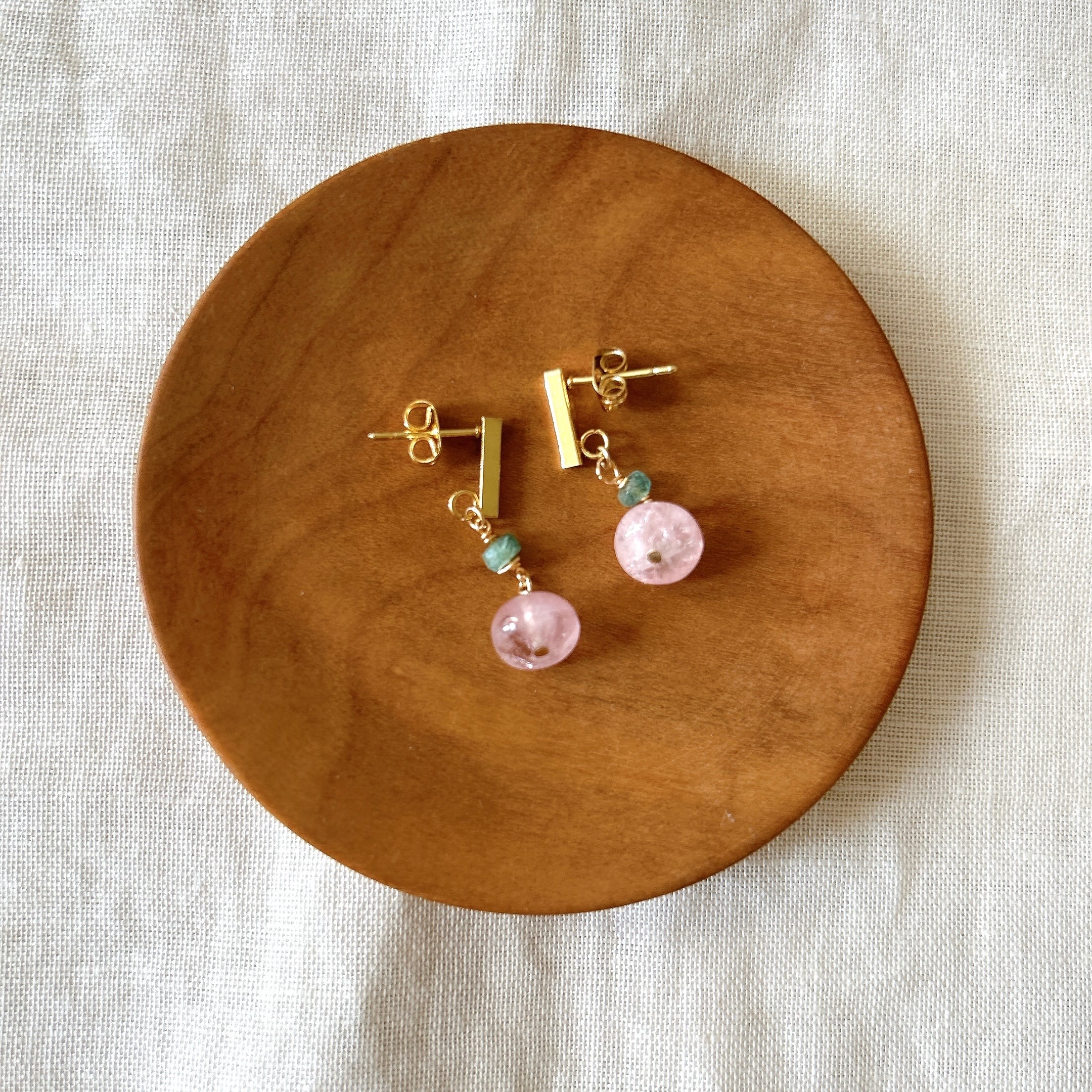 厚みのあるモルガナイトのつるんとしたボタンカットで、まるでキャンディのように可愛くて美味しそうなピアスをお作りしました。