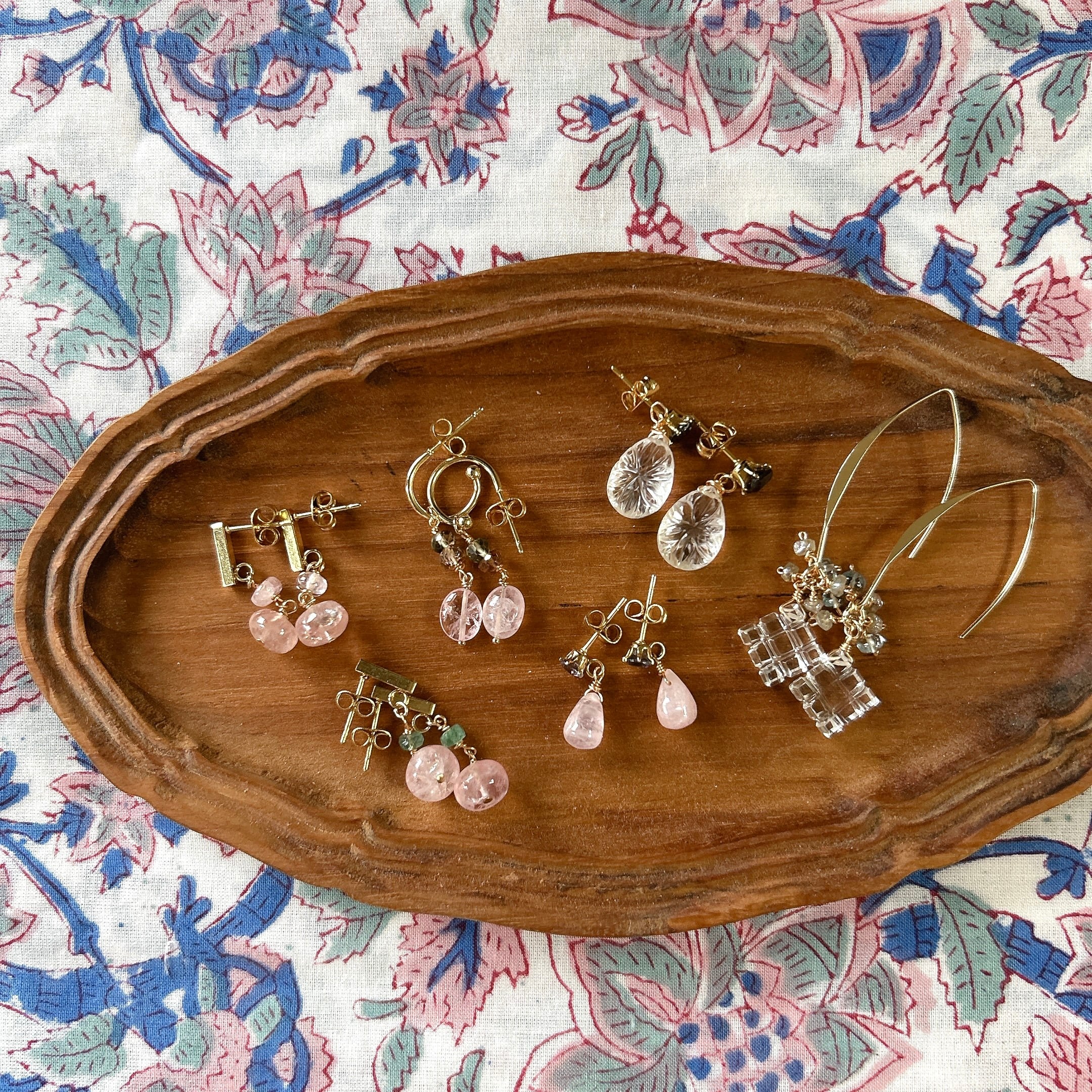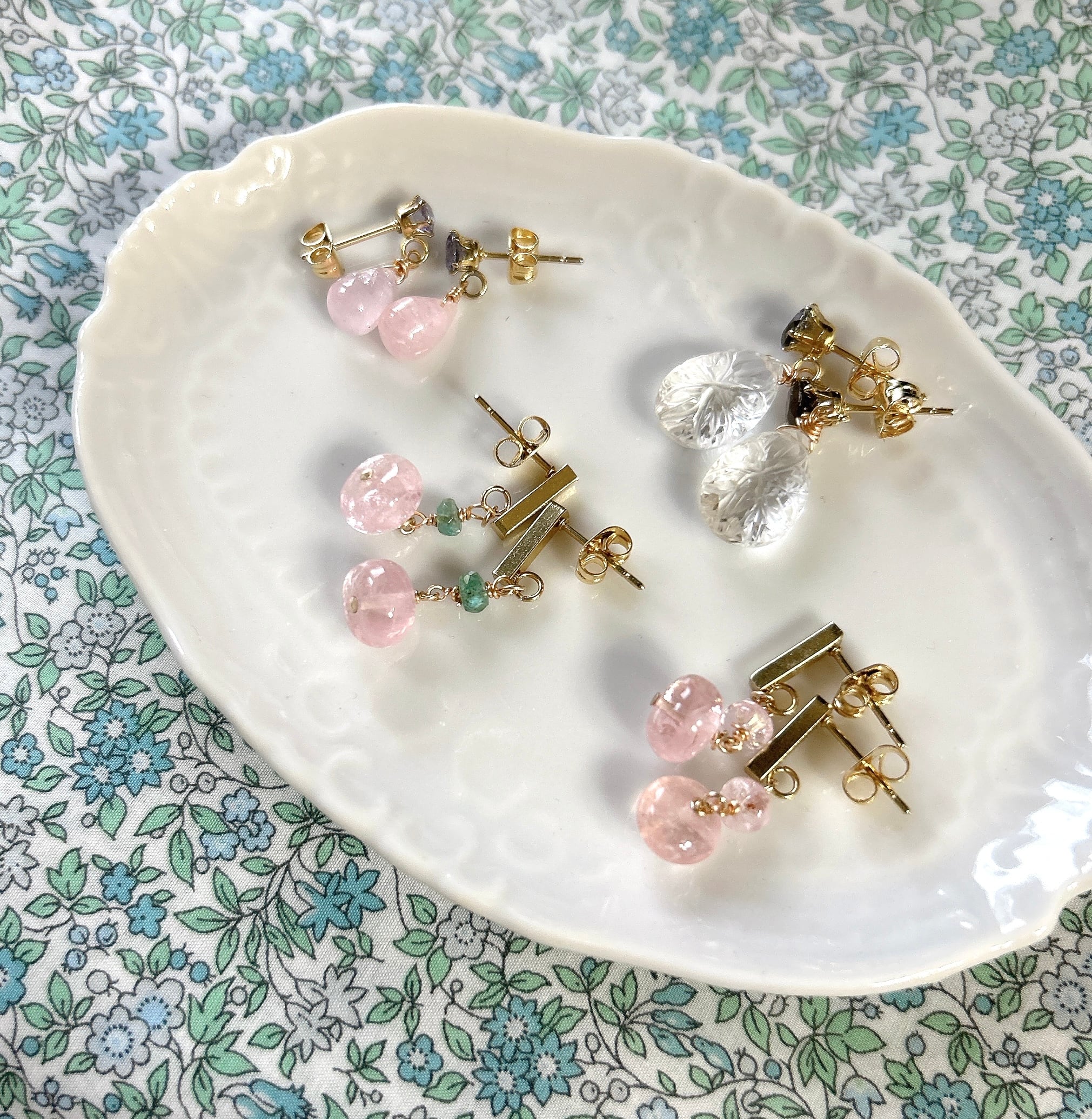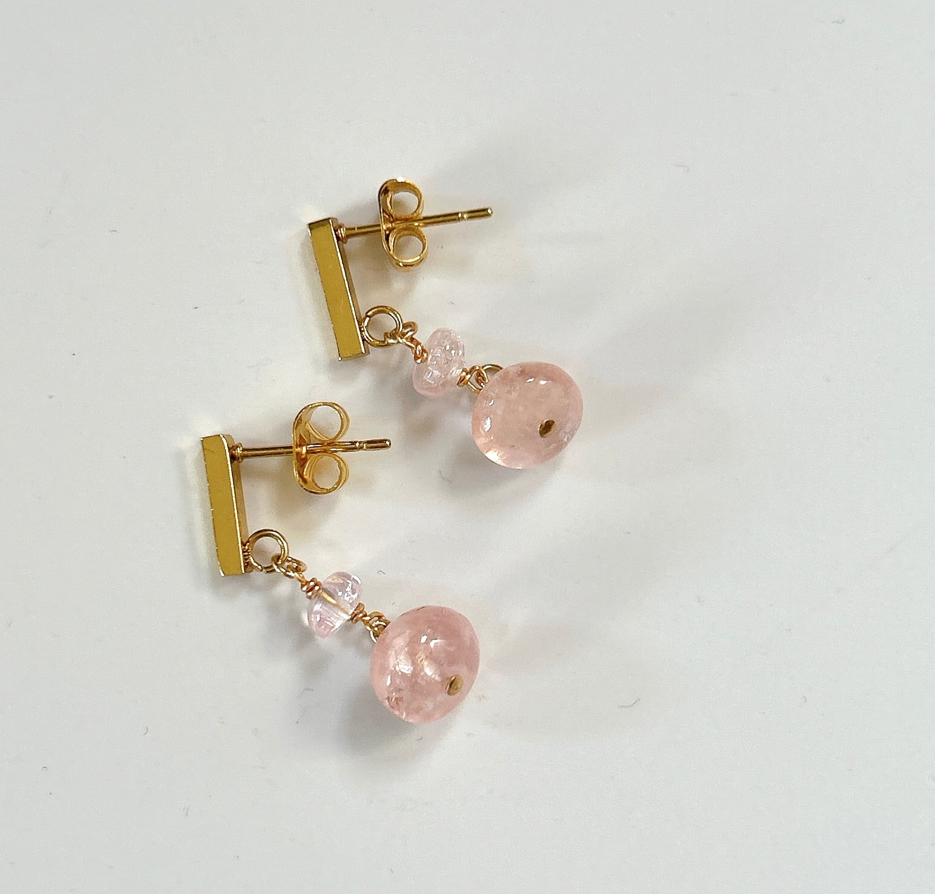 厚みのあるモルガナイトのつるんとしたボタンカットで、まるでキャンディのように可愛くて美味しそうなピアスをお作りしました。