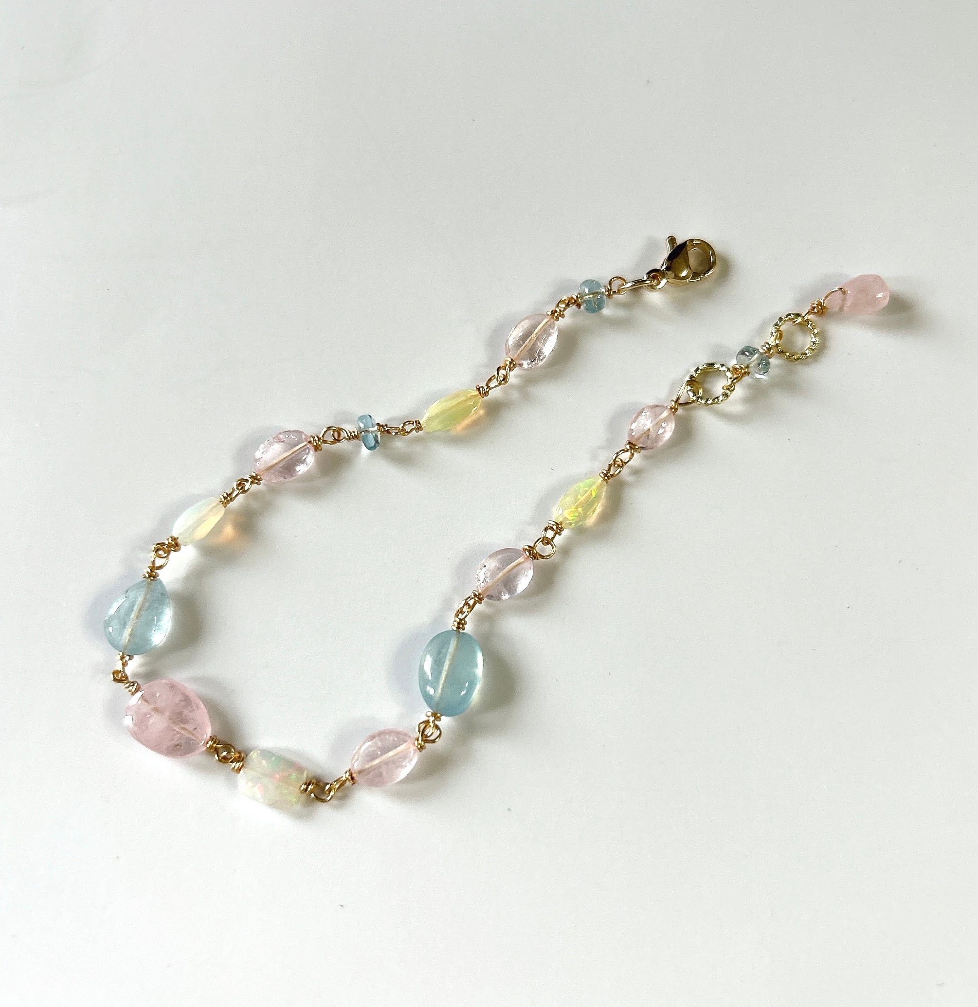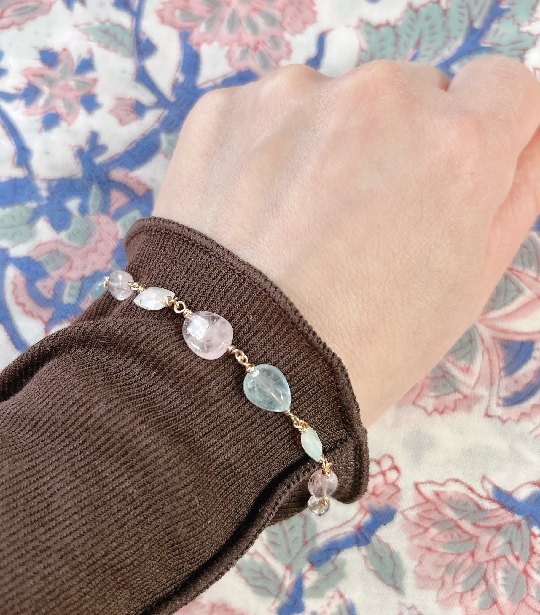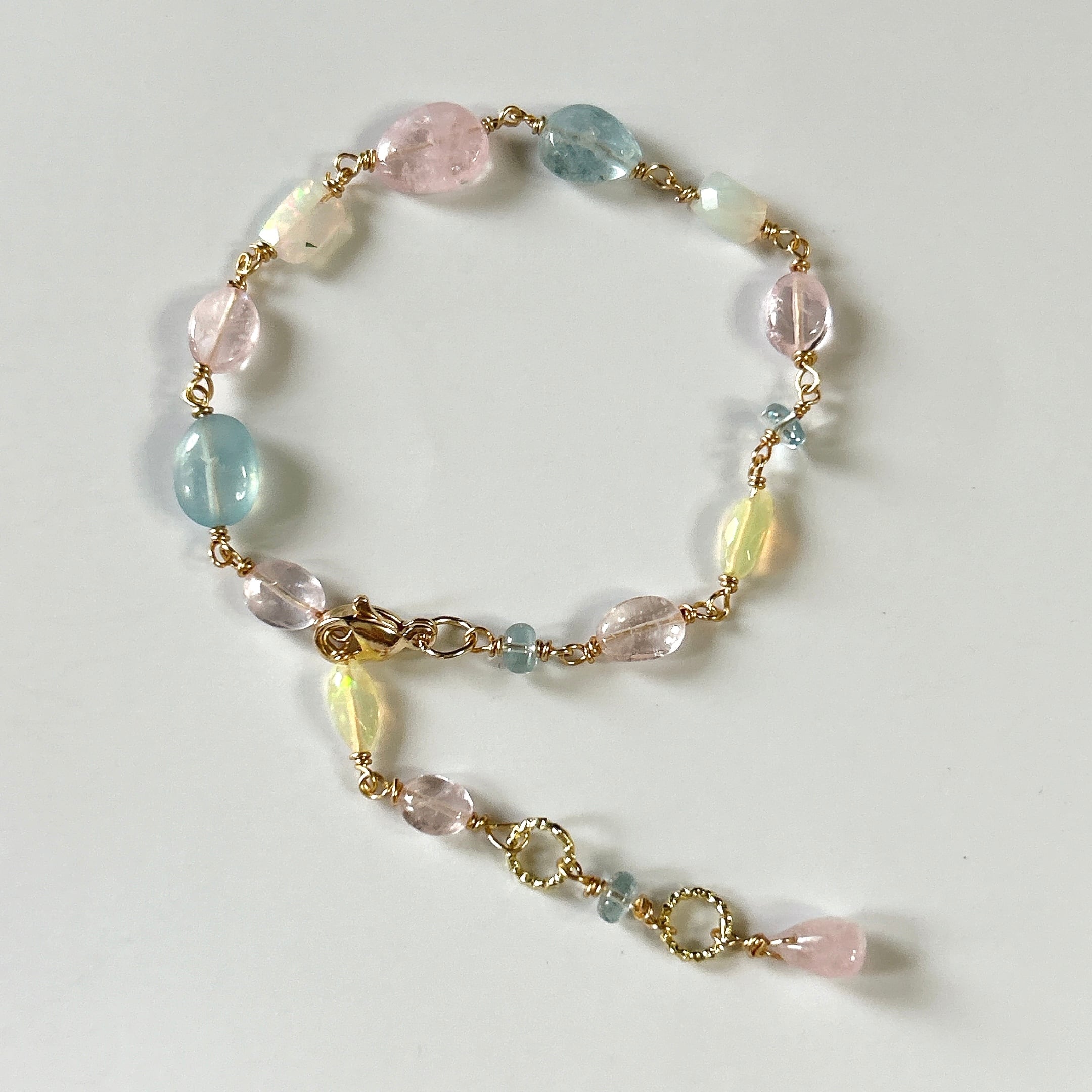 淡い桜色のモルガナイト、水色のアクアマリン、それに乳白色のオパールをK14GF(ゴールドフィルド)のワイヤーで一粒づつ繋いだ、春色のブレスレット。