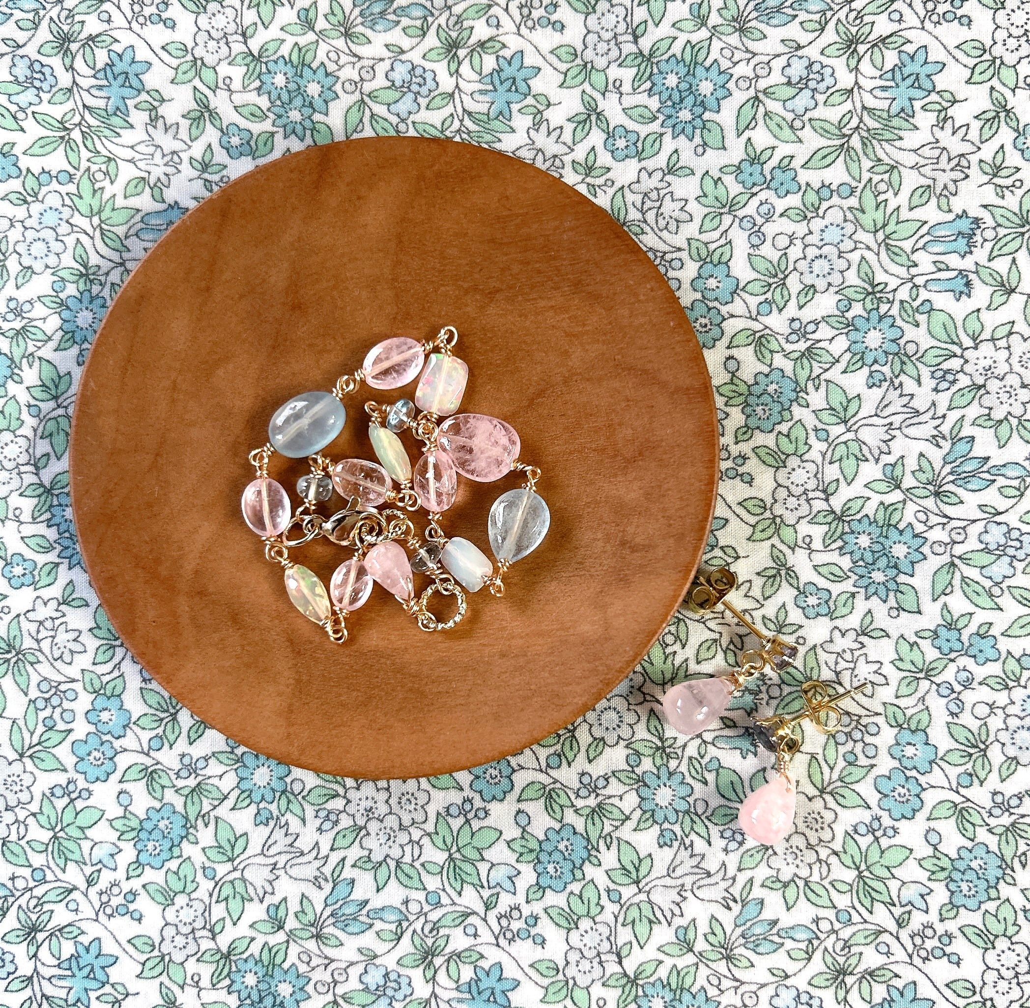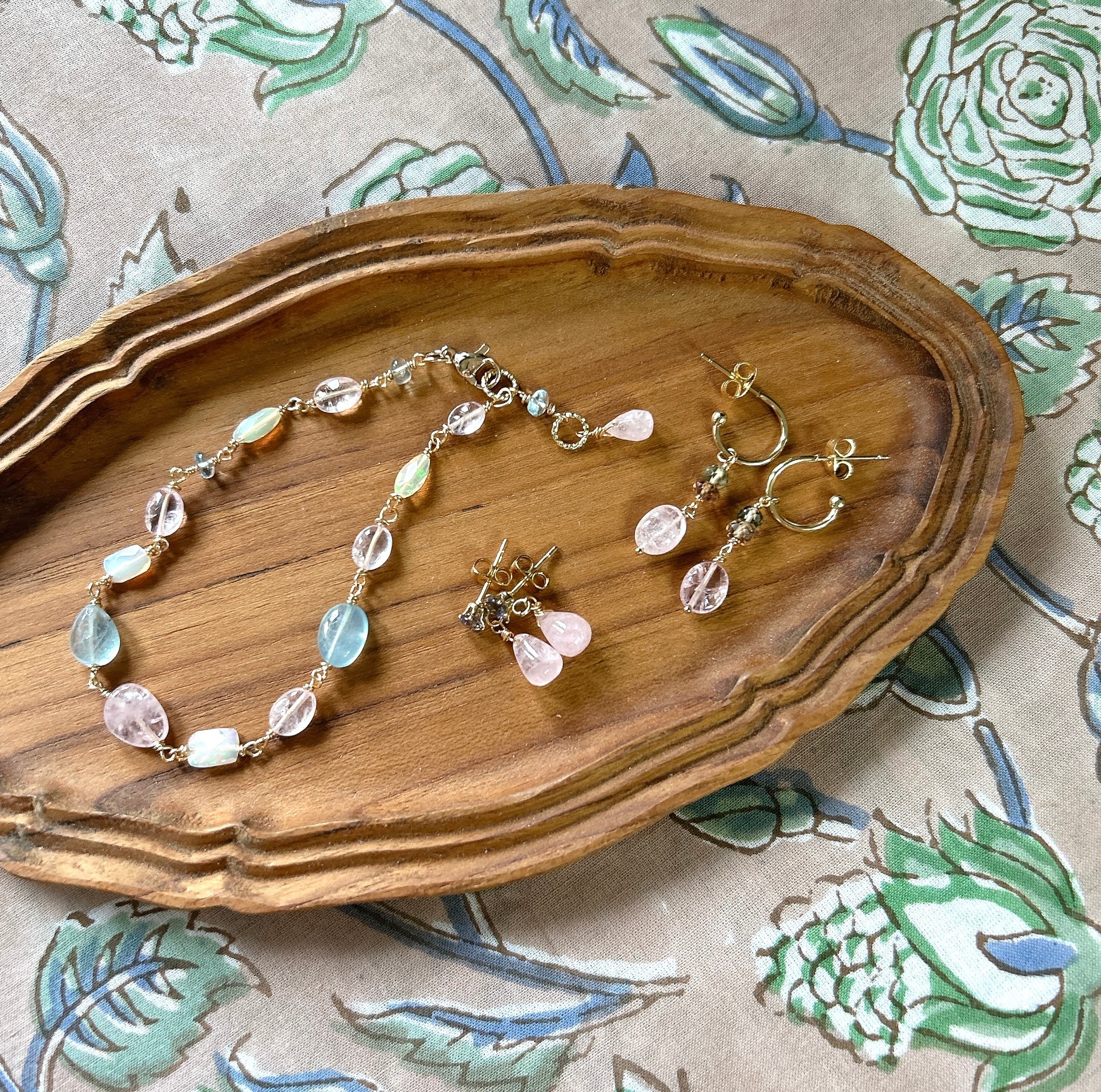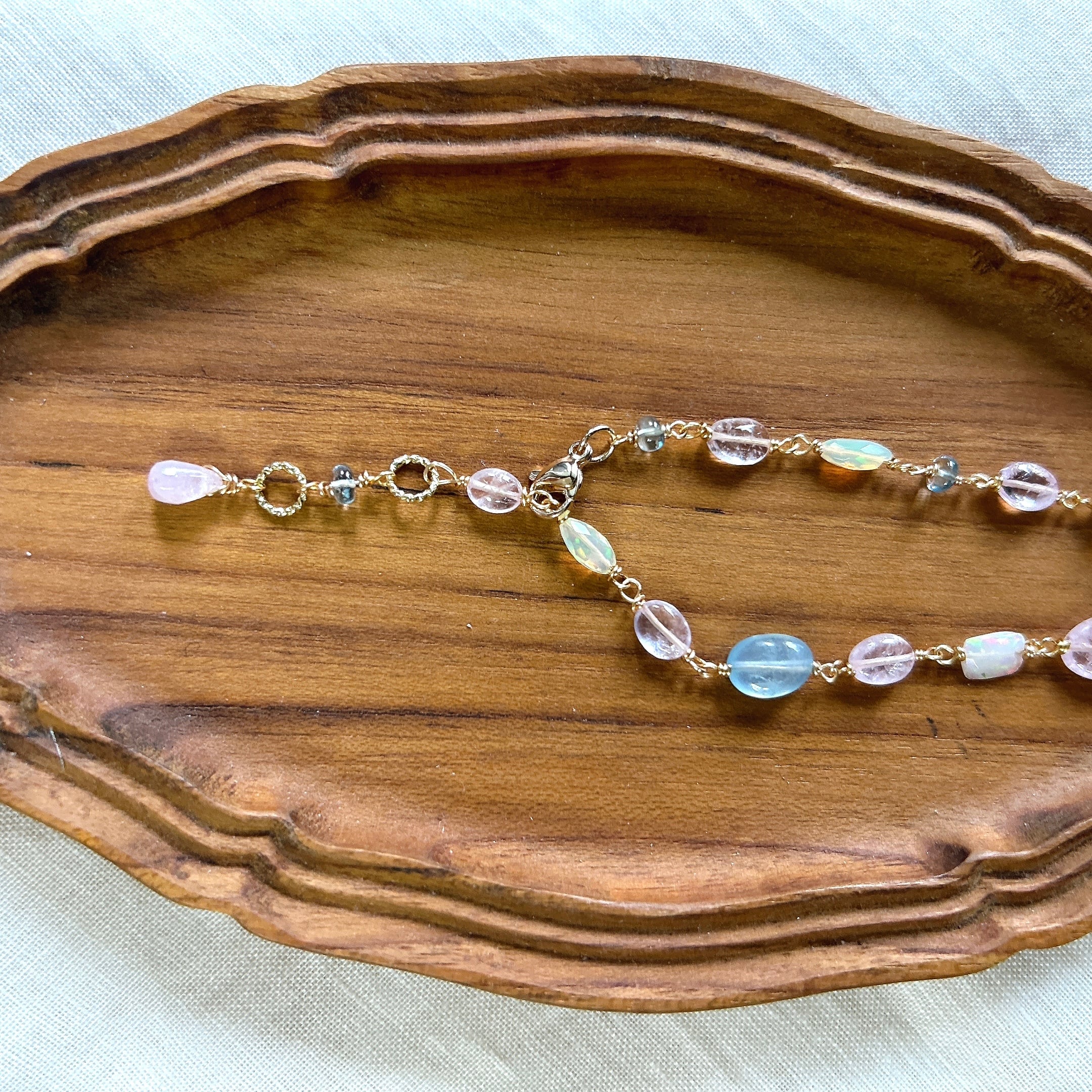 淡い桜色のモルガナイト、水色のアクアマリン、それに乳白色のオパールをK14GF(ゴールドフィルド)のワイヤーで一粒づつ繋いだ、春色のブレスレット。